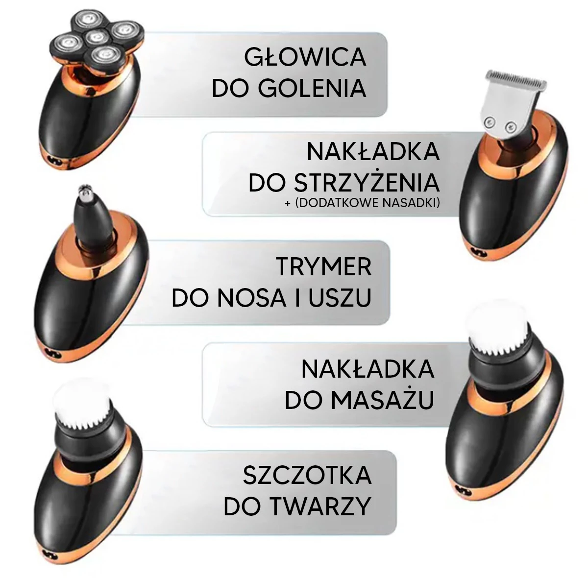Zařízení dále obsahuje veškeré potřebné příslušenství, jako jsou čtyři nástavce na stříhání vlasů, zastřihovací hlava, kartáček na čištění obličeje, kartáček na čištění a kabel sloužící také k nabíjení baterie.