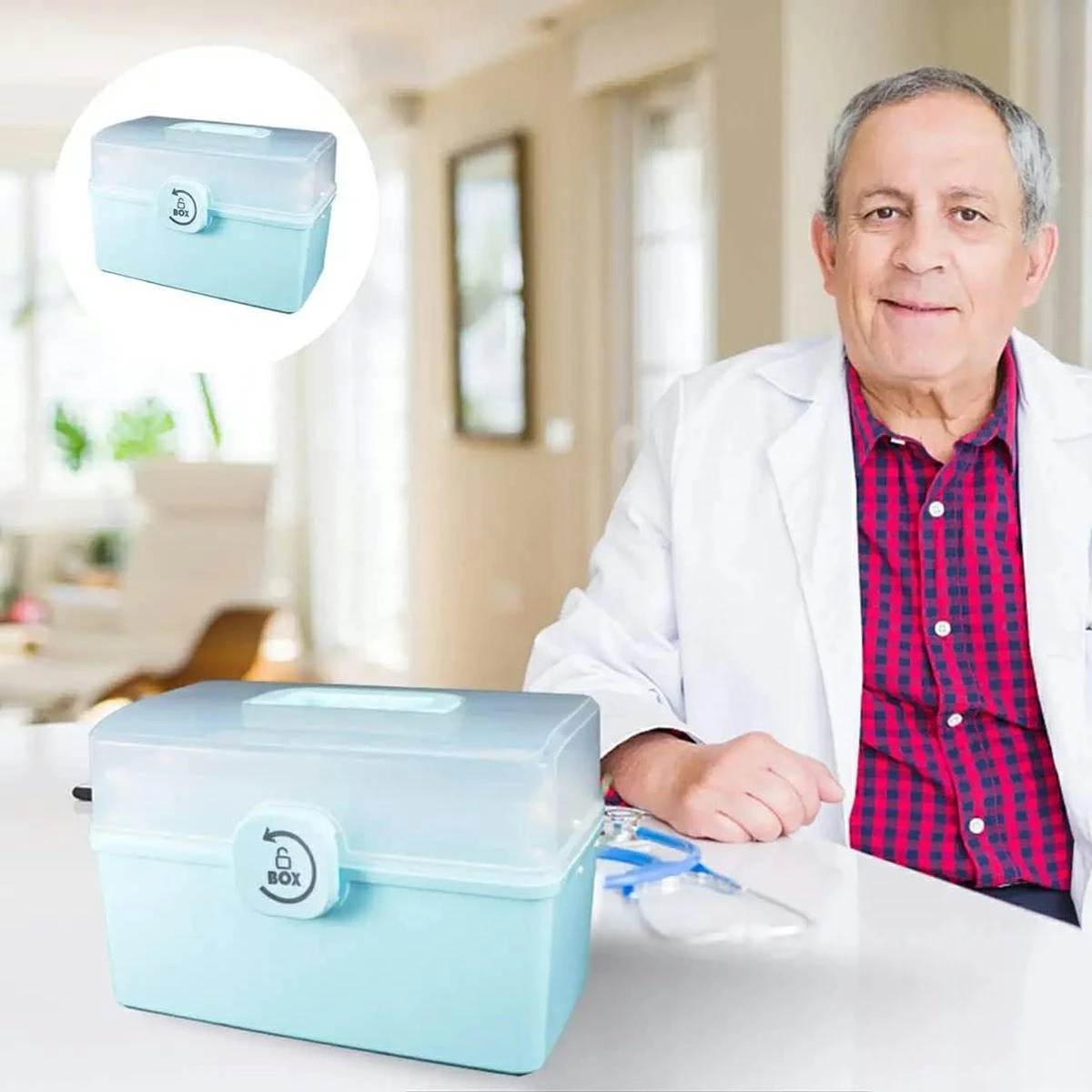 Praktická nádoba, skládací lékárnička na léky. Organizér umožňuje pohodlně uspořádat léky na několik prostorných polic a v hlavní přihrádce. Extrémně snadné použití (průhledný kryt a rukojeť). Nádoba má speciální zámek, aby ji nemohly otevřít malé děti. Vyrobeno z bezpečného plastu, který nepřichází do styku s léky.