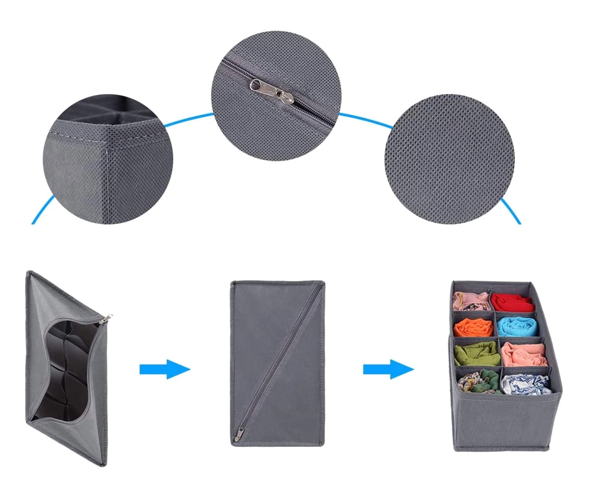 Sada 3 organizérů do zásuvky. Vložky vám umožní uspořádat si sbírku kravat, ponožek, opasků a spodního prádla jednoduchým, praktickým a levným způsobem. Sada obsahuje tři organizéry různých velikostí, počtu přihrádek a aplikací. Jsou vyrobeny z pevného prodyšného materiálu. Otevřený design umožňuje rychlý přístup k oblečení.
