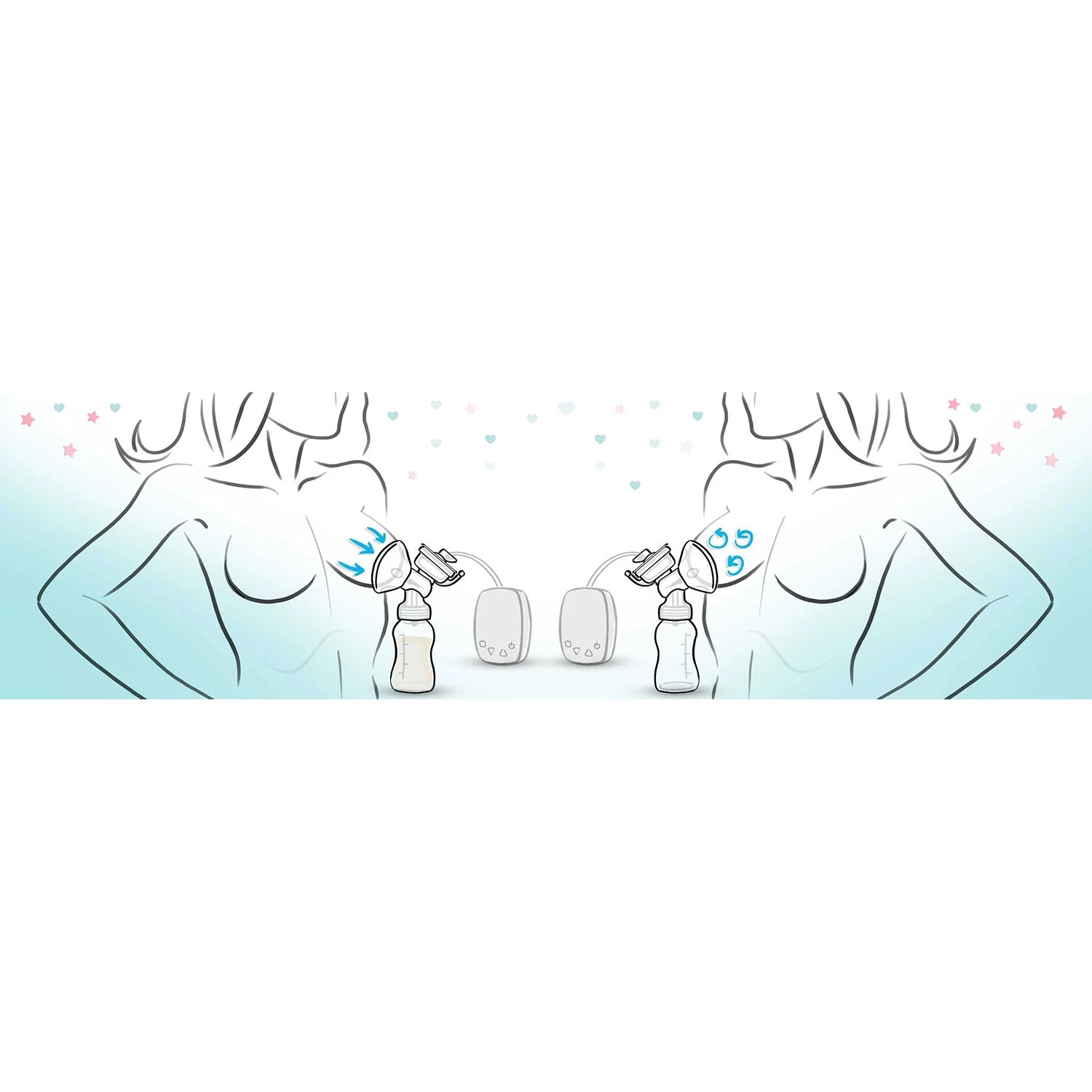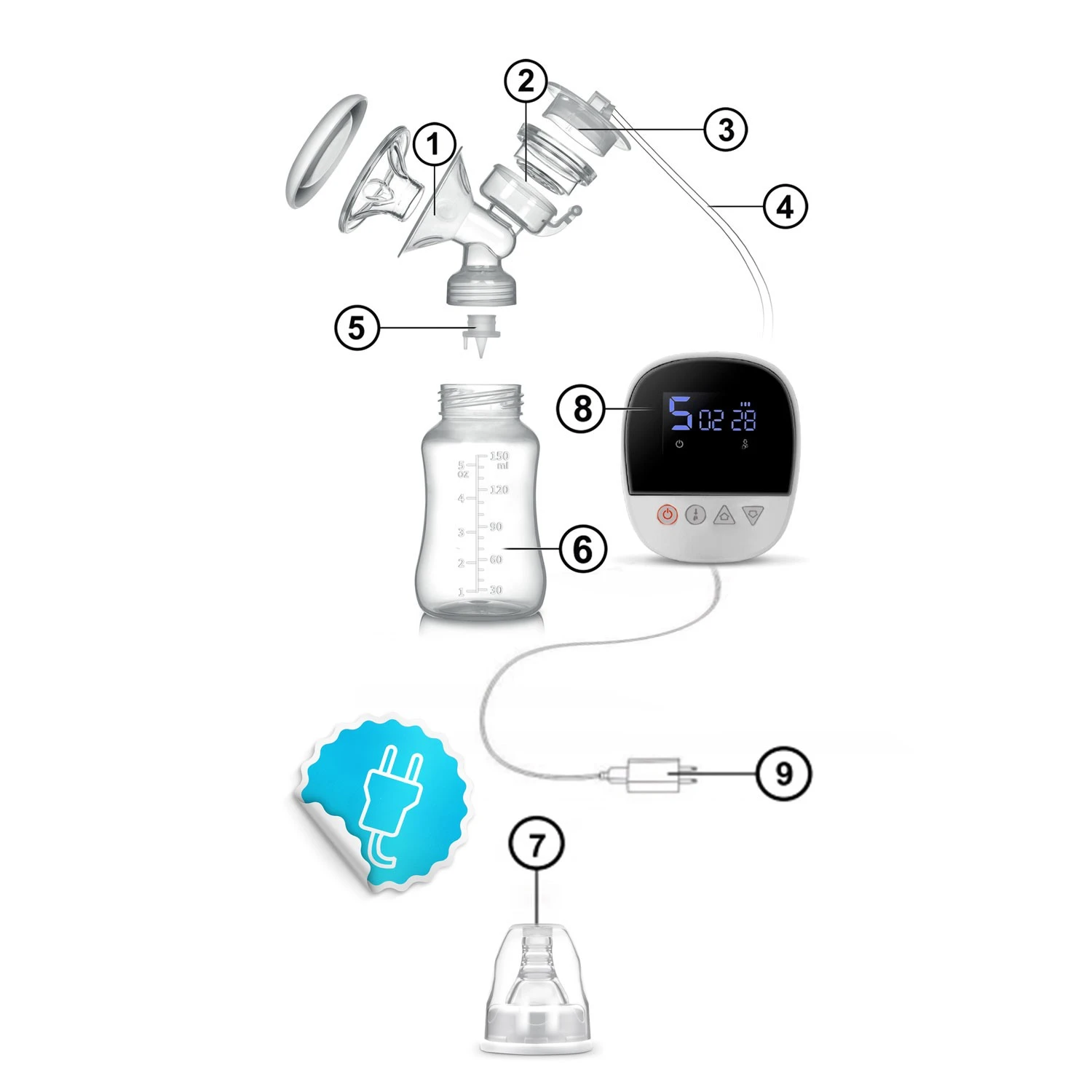 Určeno pouze k odsávání mateřského mléka. Před prvním použitím a po kontaktu s mlékem pečlivě vyčistěte všechny části přicházející do styku s potravinou. Nenechávejte zařízení ani příslušenství v dosahu dětí bez dozoru. Nepoužívejte, jsou-li poškozeny díly, hadička nebo kabel. Dodržujte pracovní cyklus 30 min ON / 30 min OFF. Nevystavujte vlhkosti mimo určené části a nepoužívejte s horkými kapalinami.