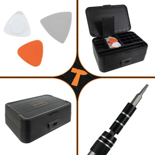 Součástí jsou magnetické šroubováky, široký výběr bitů, pinzety, páčidla, přísavka na displeje, antistatické nástroje a flexibilní prodlužovací nástavec. Nářadí je úhledně uspořádáno v praktickém a odolném kufříku, který umožňuje snadné přenášení a udržení pořádku.