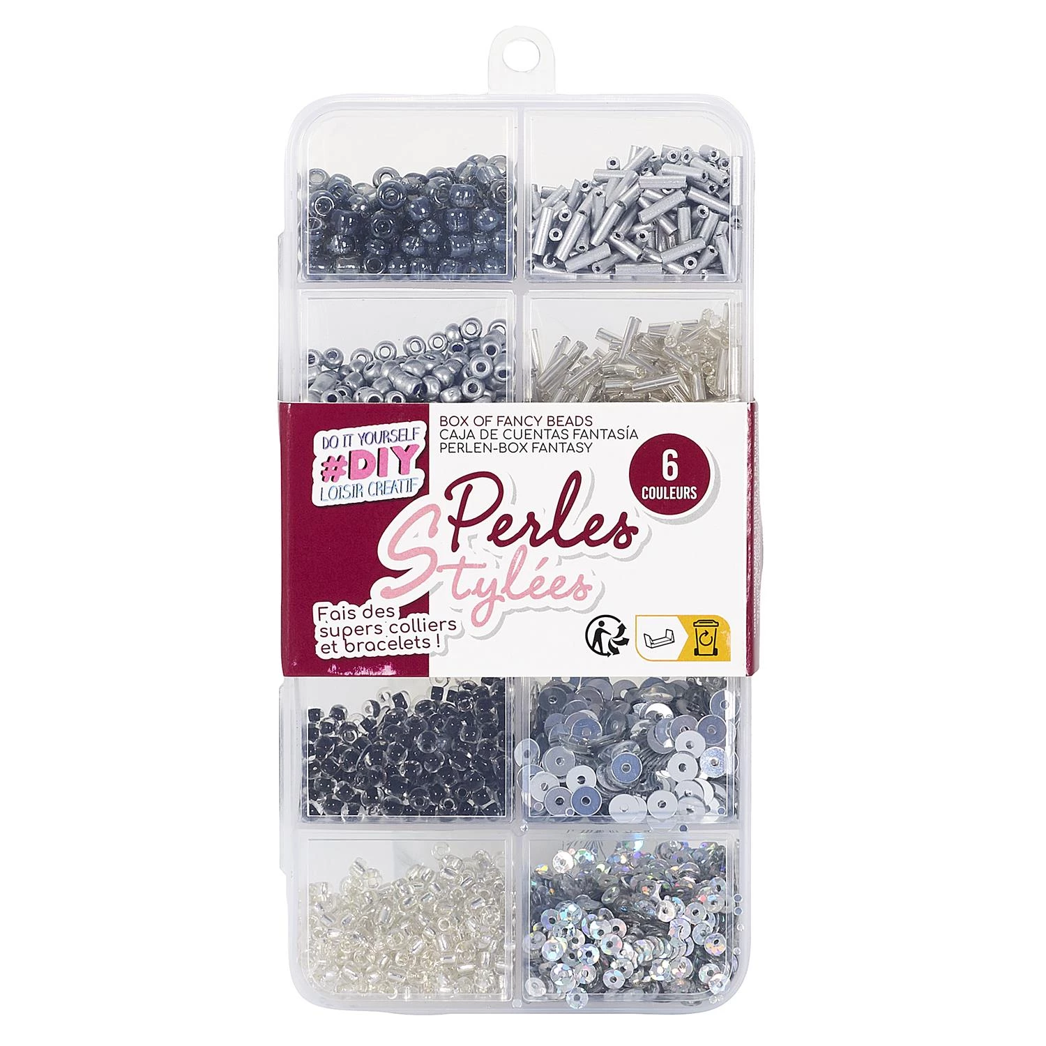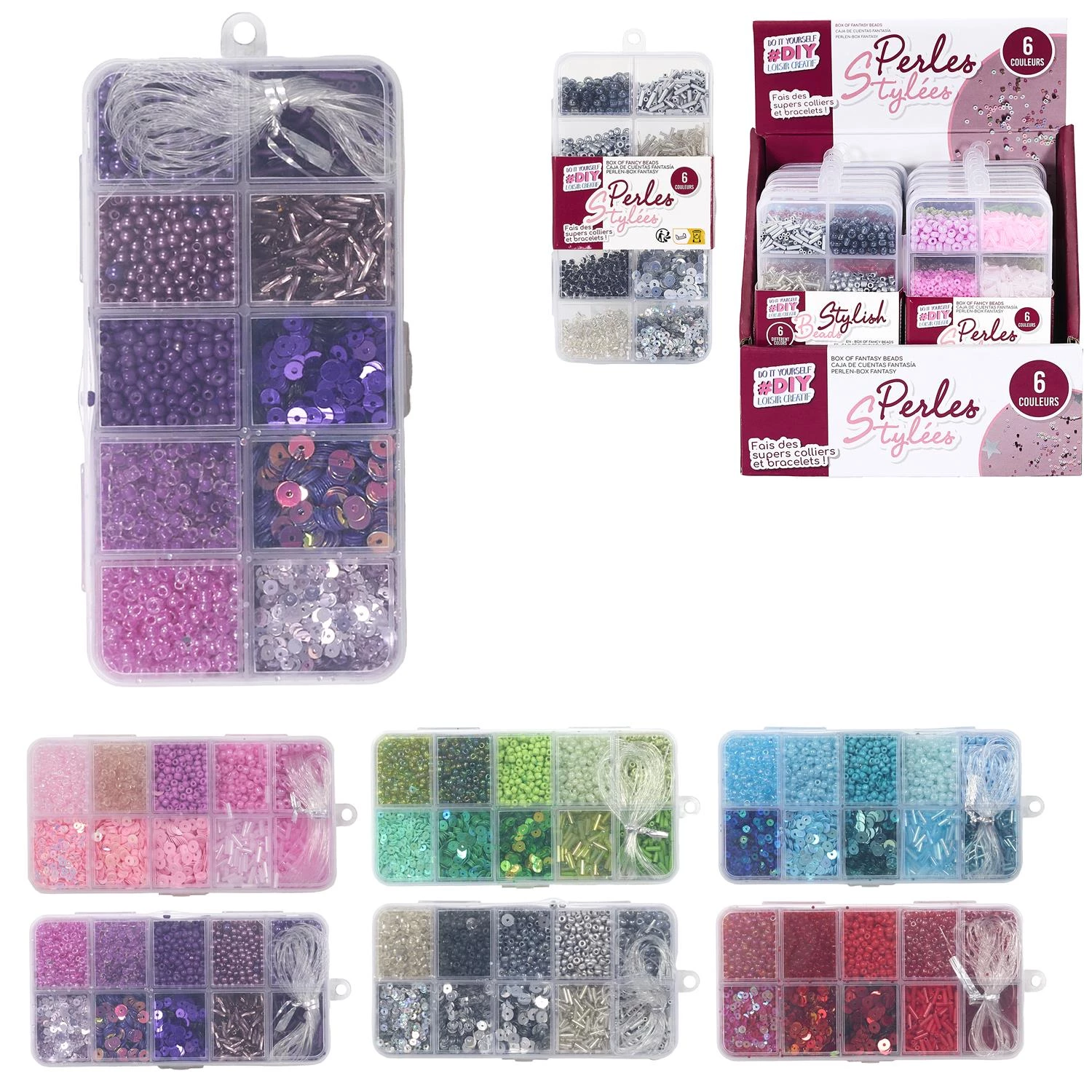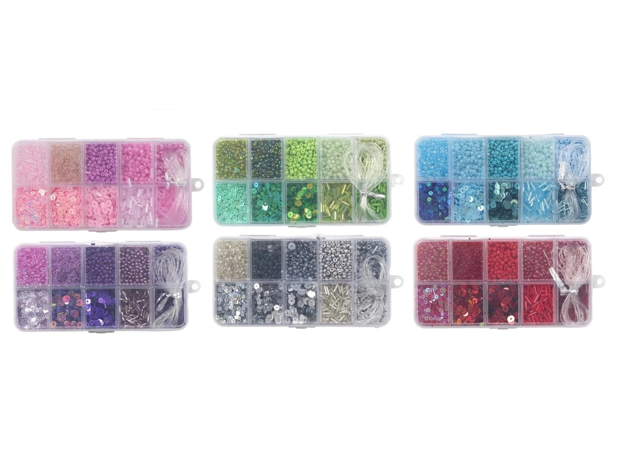 Obsah balení: 6 boxů s 10 přihrádkami – různé druhy korálků, flitrů, elastický provázek