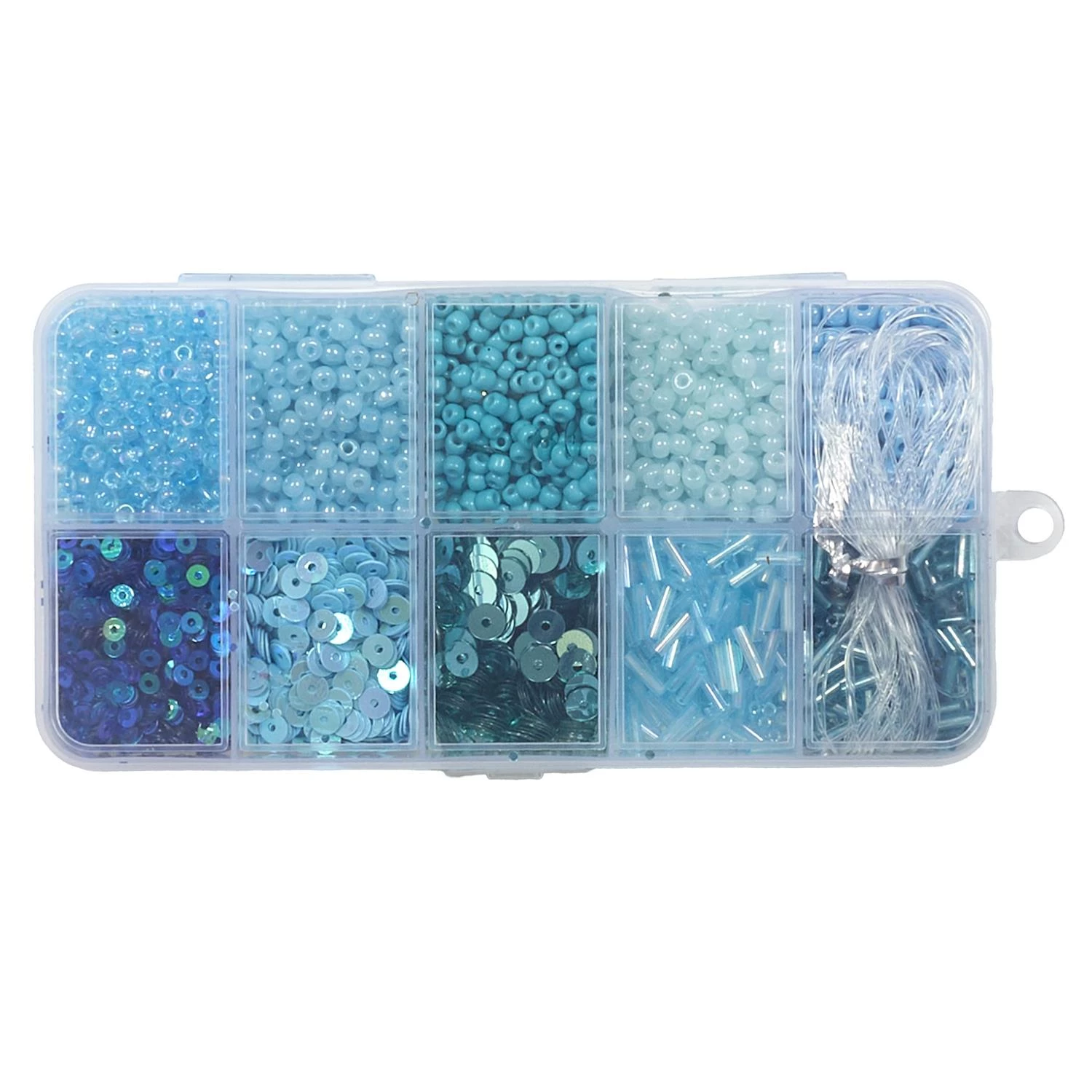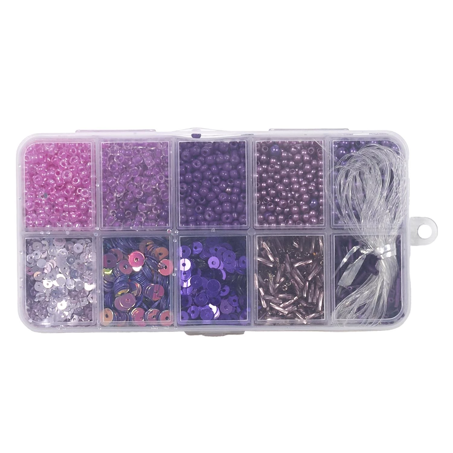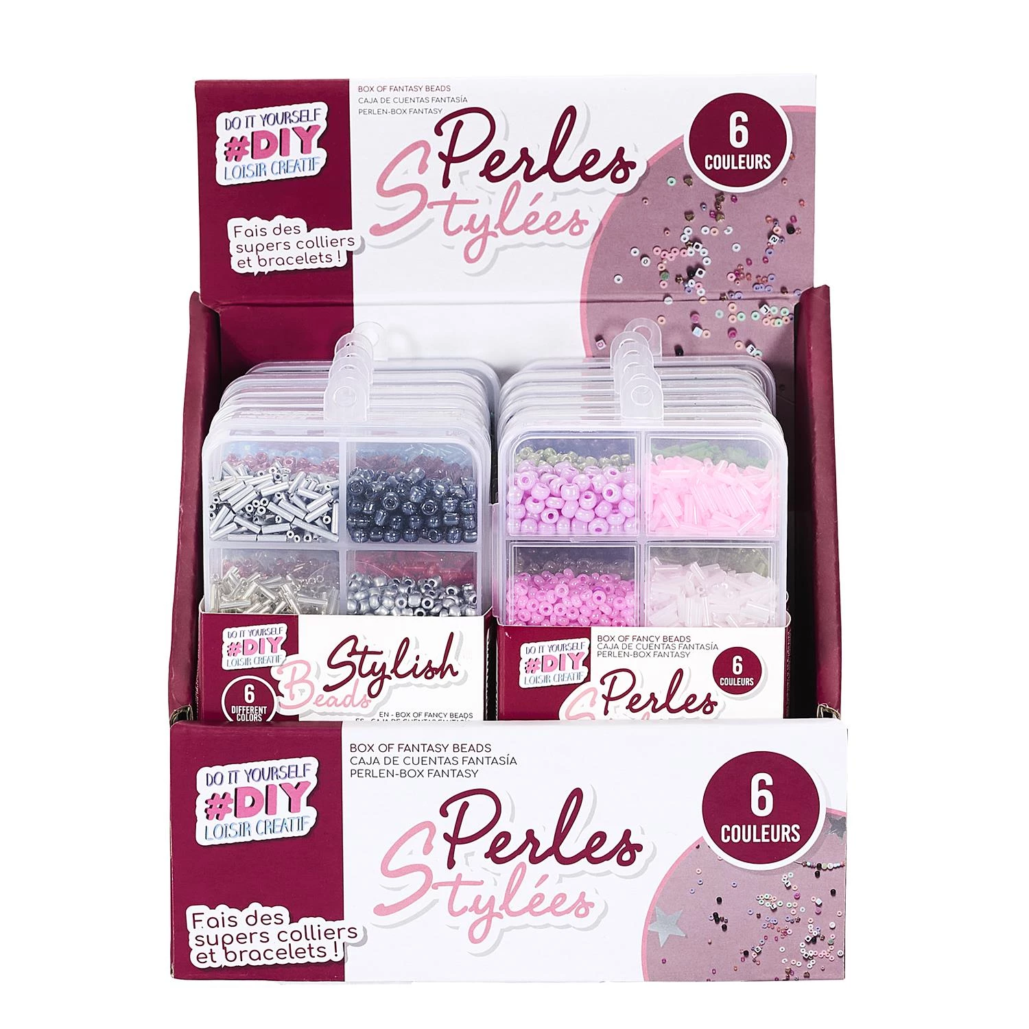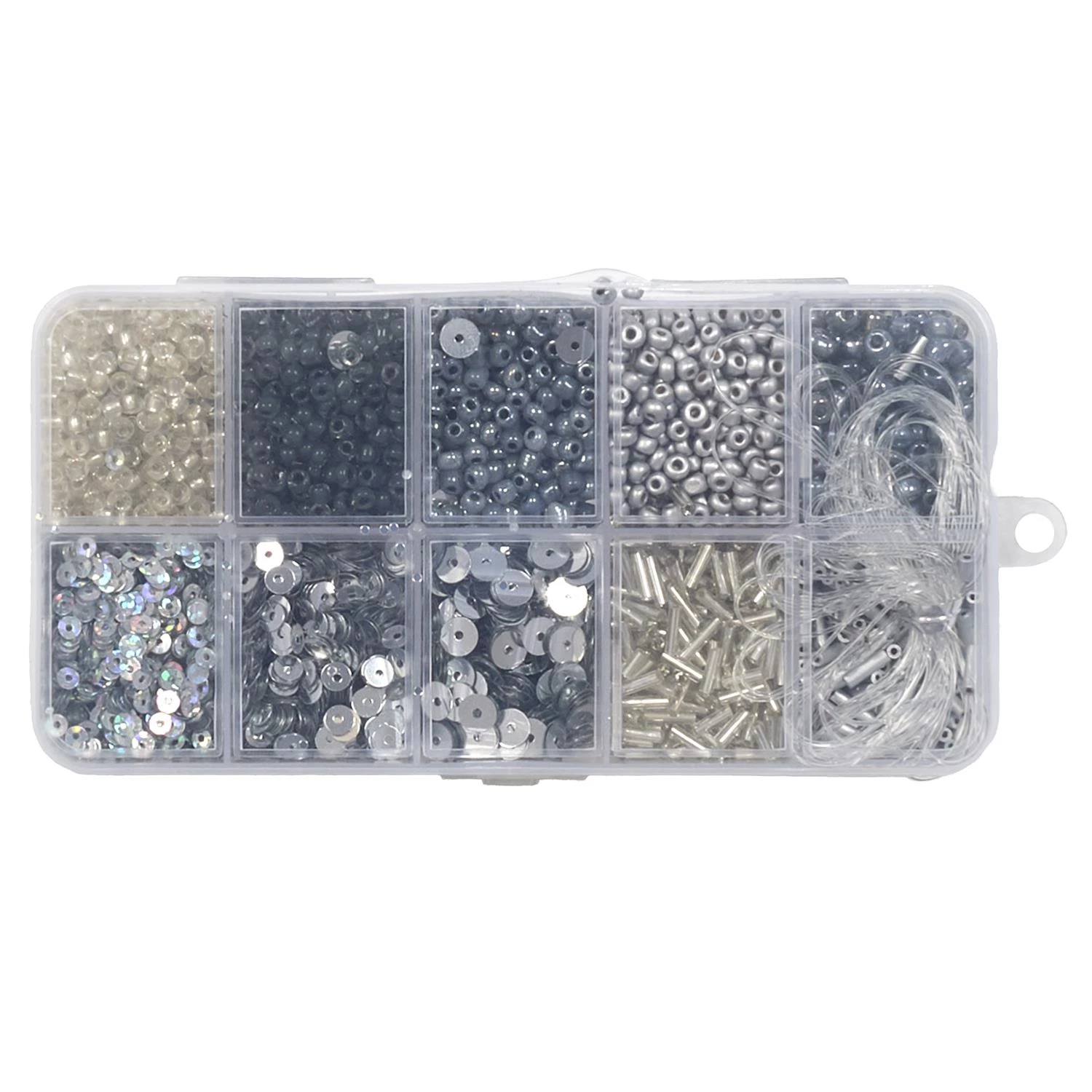 Obsah balení: 6 boxů s 10 přihrádkami – různé druhy korálků, flitrů, elastický provázek