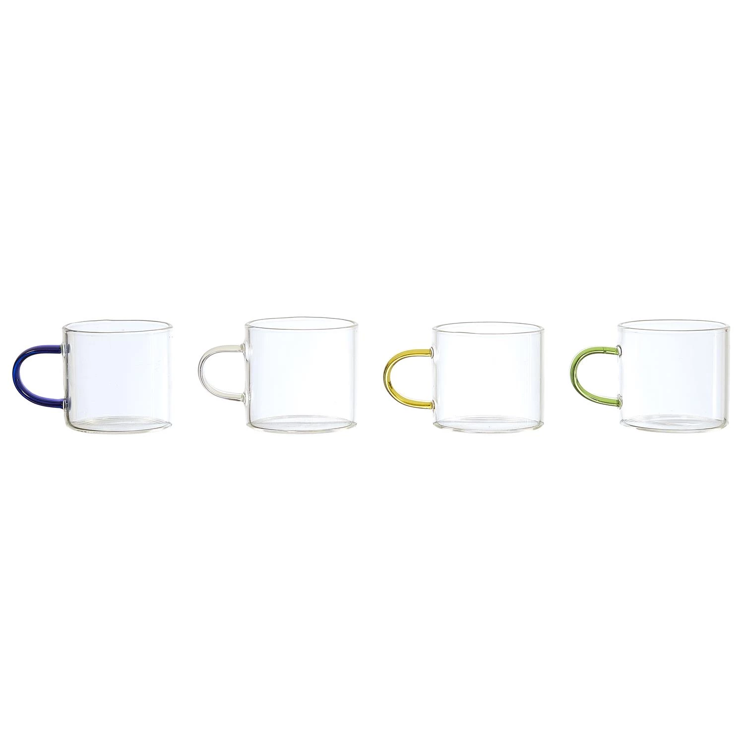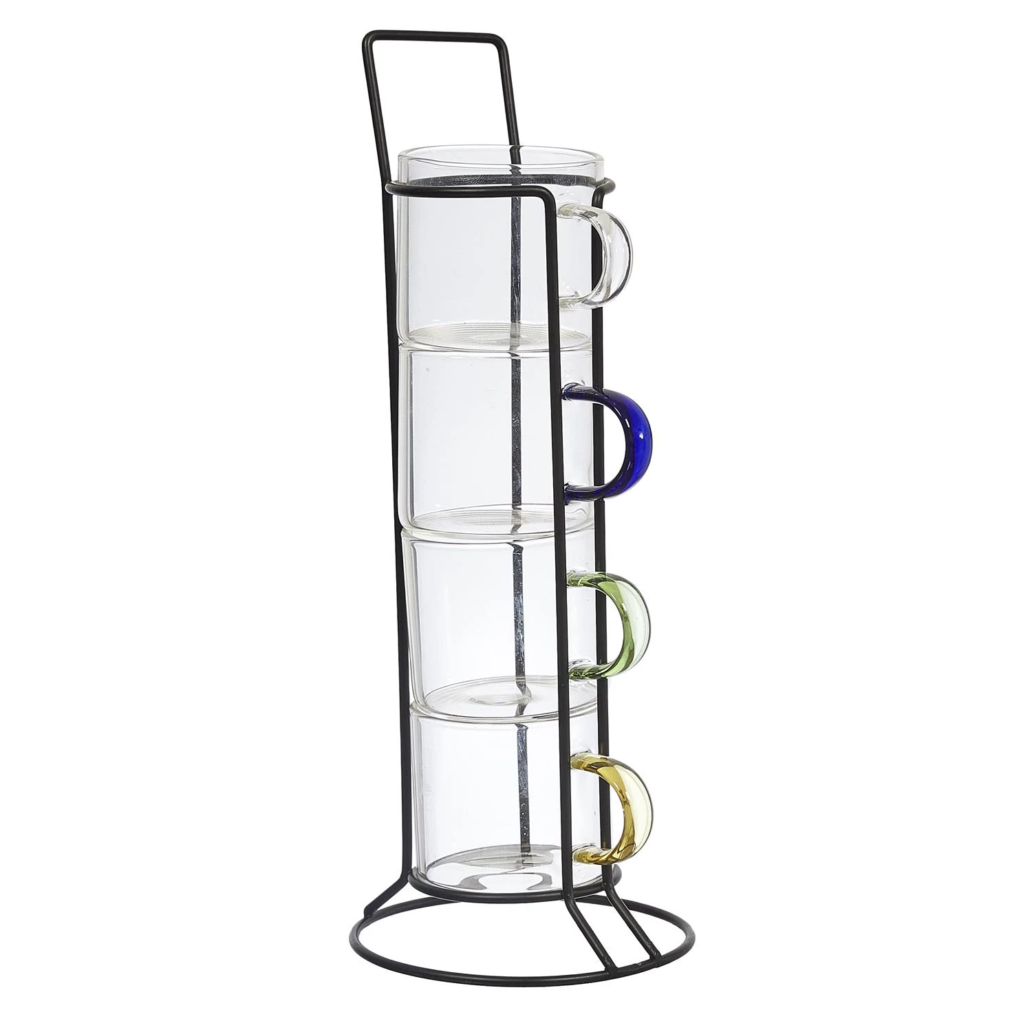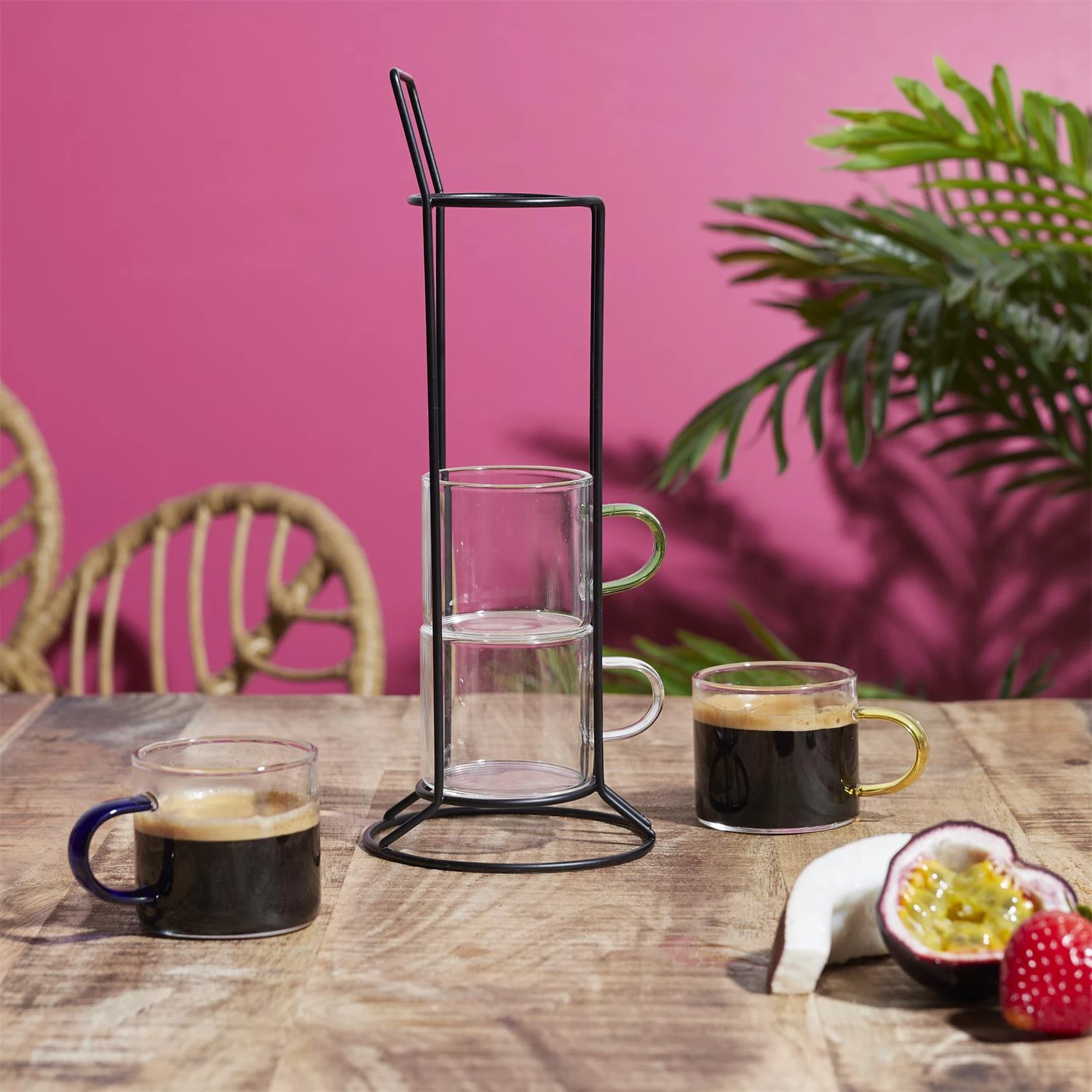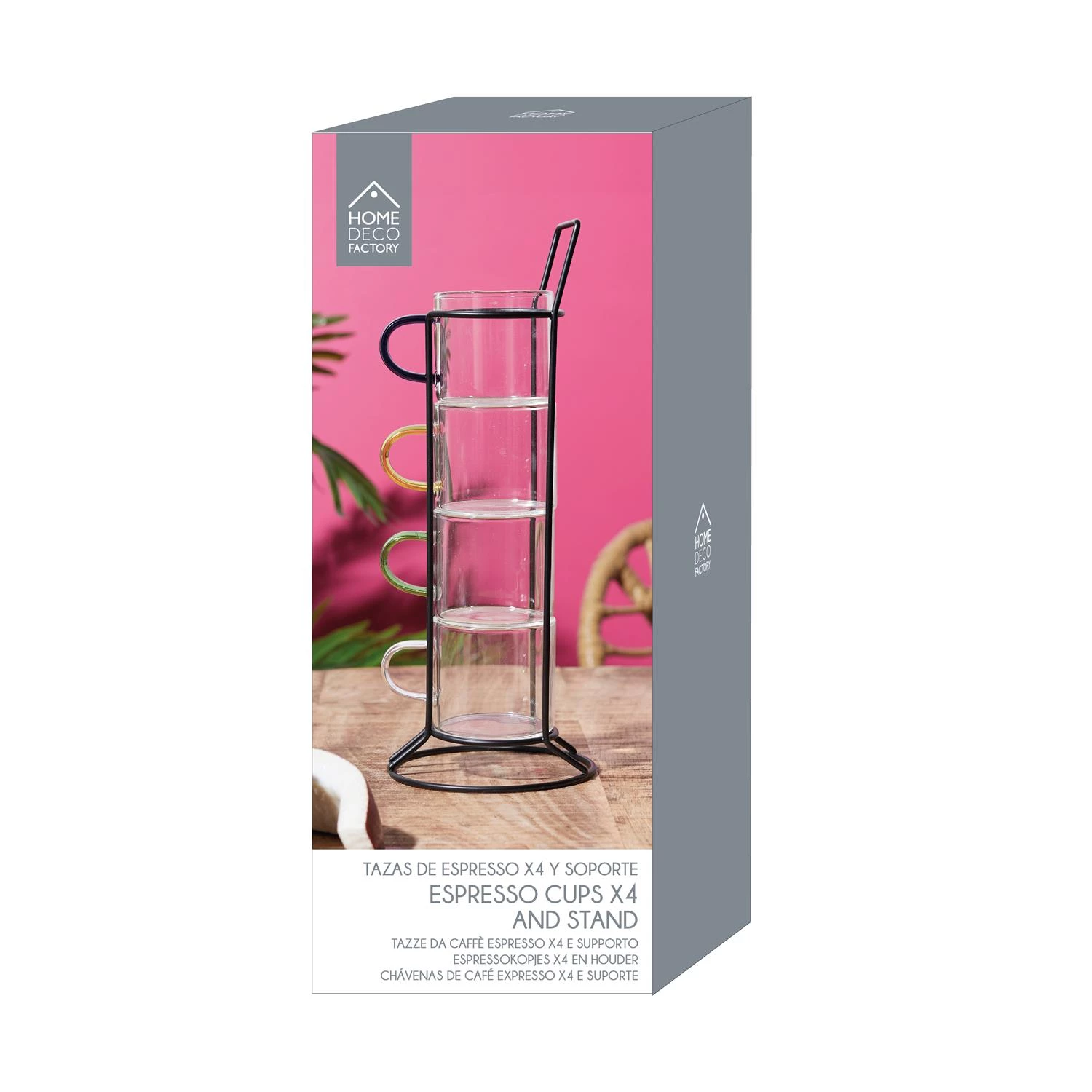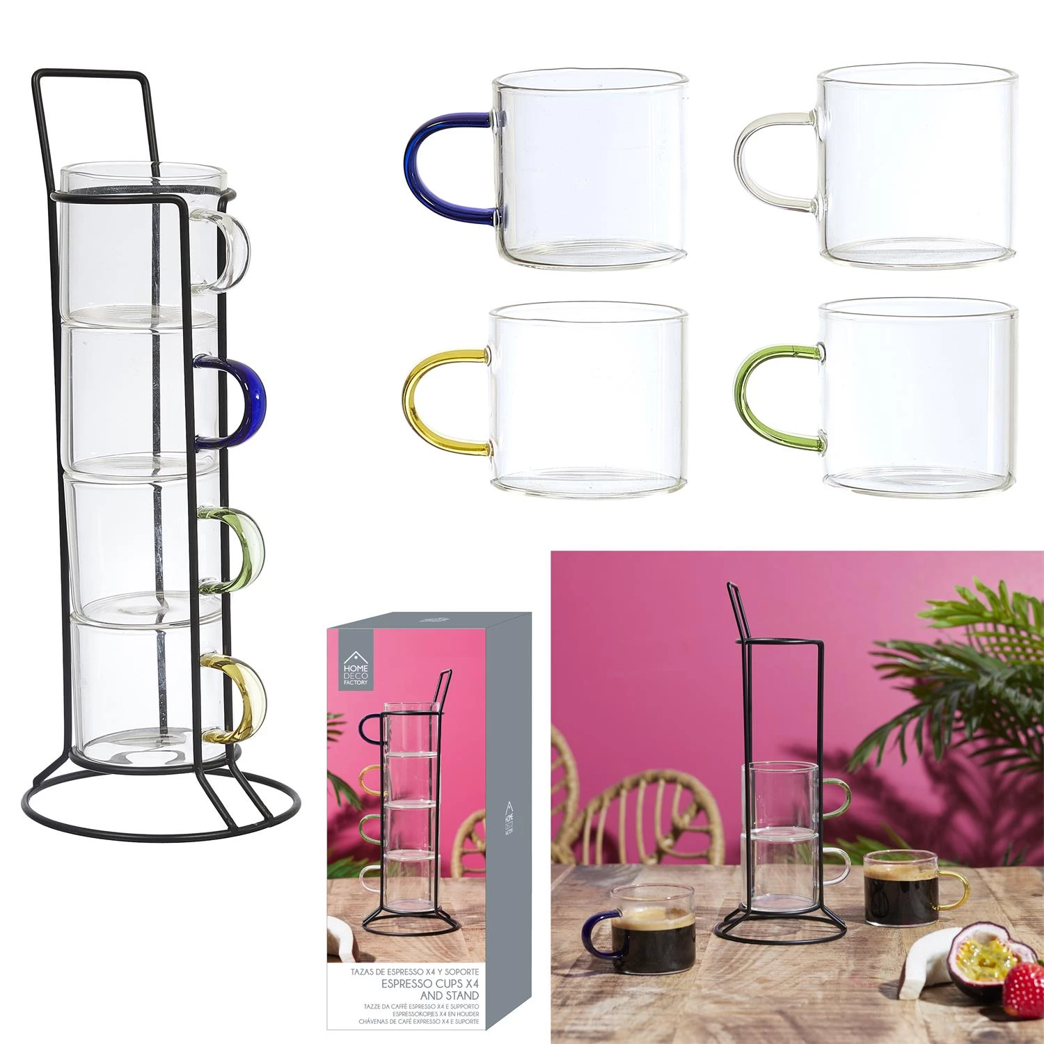 Dodejte své kávové chvilce styl s elegantní sadou 4 skleněných espresso šálků s barevnými oušky a kovovým stojanem. Ideální pro milovníky espressa, kteří ocení moderní design, úsporu místa a praktické uspořádání. Skleněné šálky s oušky v modré, bílé, žluté a zelené barvě se snadno skladují ve svislém stojanu, který šetří místo a zároveň působí jako dekorativní prvek ve vaší kuchyni.