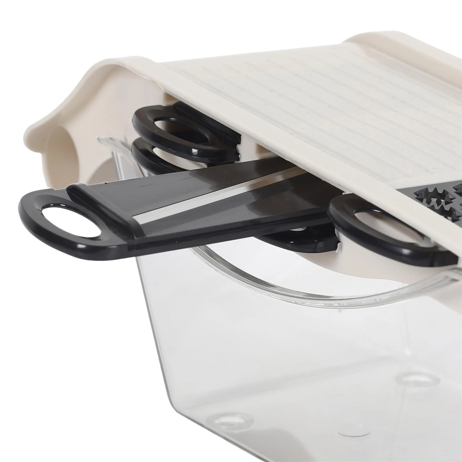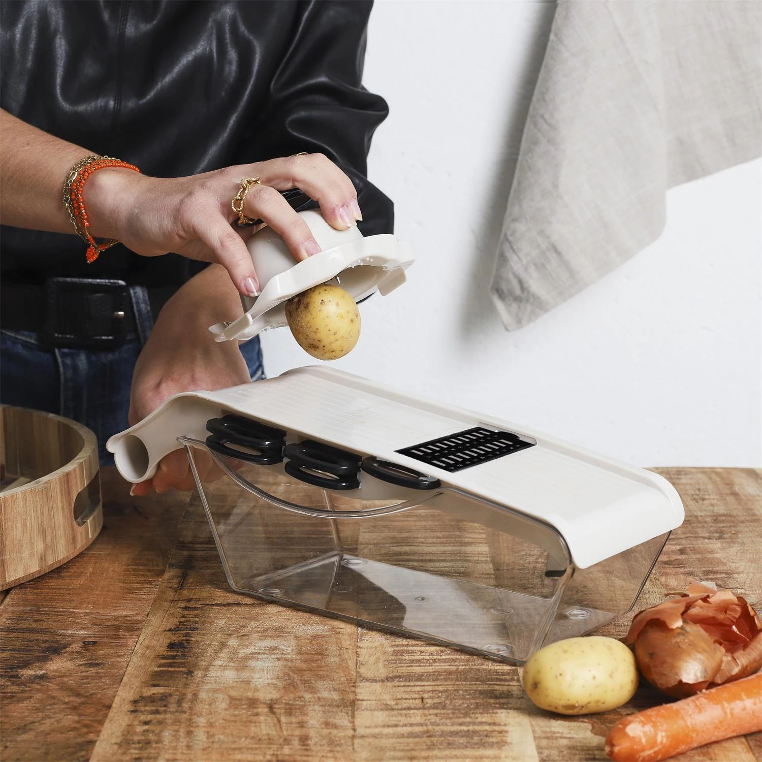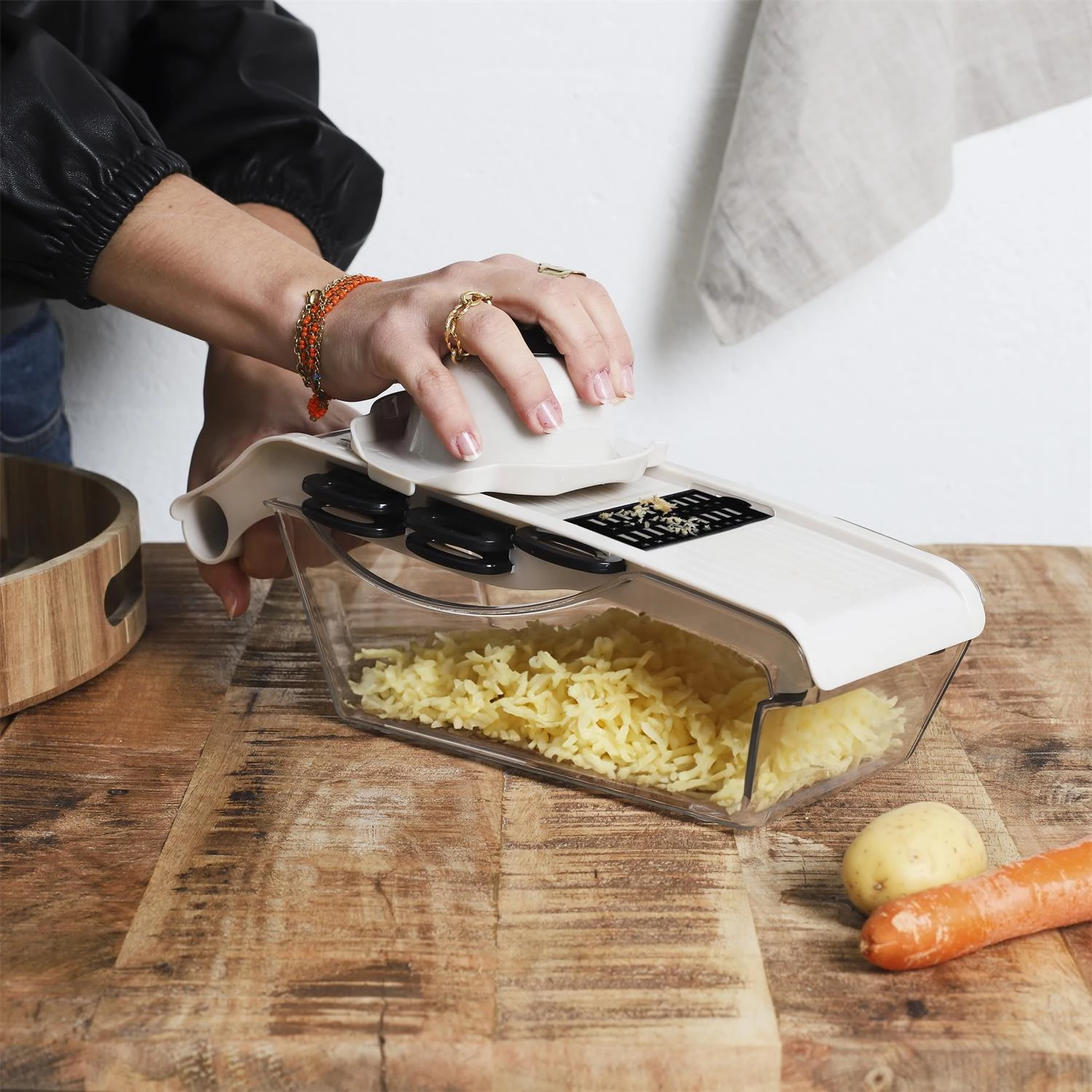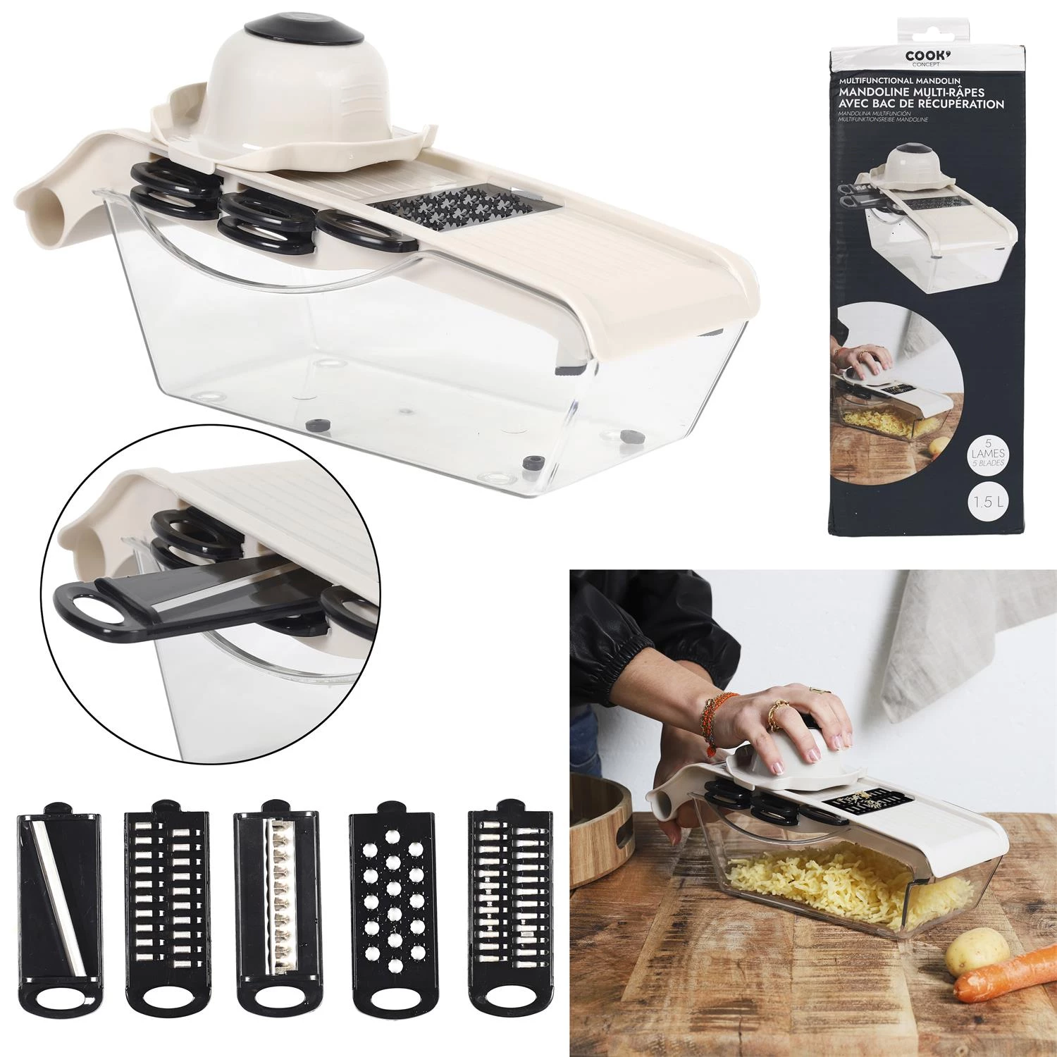 Ušetřete čas a usnadněte si přípravu jídel s touto praktickou multifunkční mandolínou. Tento kuchyňský pomocník nabízí 5 různých výměnných čepelí, které vám umožní krájet, strouhat, nebo plátkovat zeleninu a ovoce s naprostou lehkostí. Mandolína je vybavena integrovanou nádobou o objemu 1,5 litru, která zachytí všechny nakrájené nebo nastrouhané suroviny bez nepořádku na pracovní ploše.