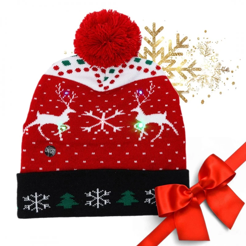 Vánoční zimní čepice s LED světýlky. Čepice v moderním provedení s bambulí a vánočními dárky po obvodu spodního lemu. Integrovaná LED světla vytvářejí blikající efekt, který dodá sváteční atmosféru na večírku, venkovní akci nebo vánočním setkání. Perfektní jako originální dárek nebo doplněk k vánočnímu outfitu.