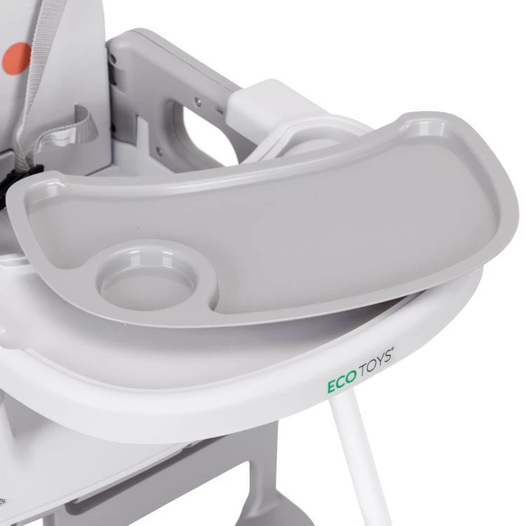 Součástí je dvouvrstvý (dvojitý) tác s možností nastavení vzdálenosti a snadného sejmutí; horní vrstvu lze mýt v myčce. O pohodlí dítěte se stará podnožka, zábrana proti sklouznutí mezi nožičkami a 5bodové bezpečnostní pásy s regulací. Maximální nosnost židličky je 25 kg.