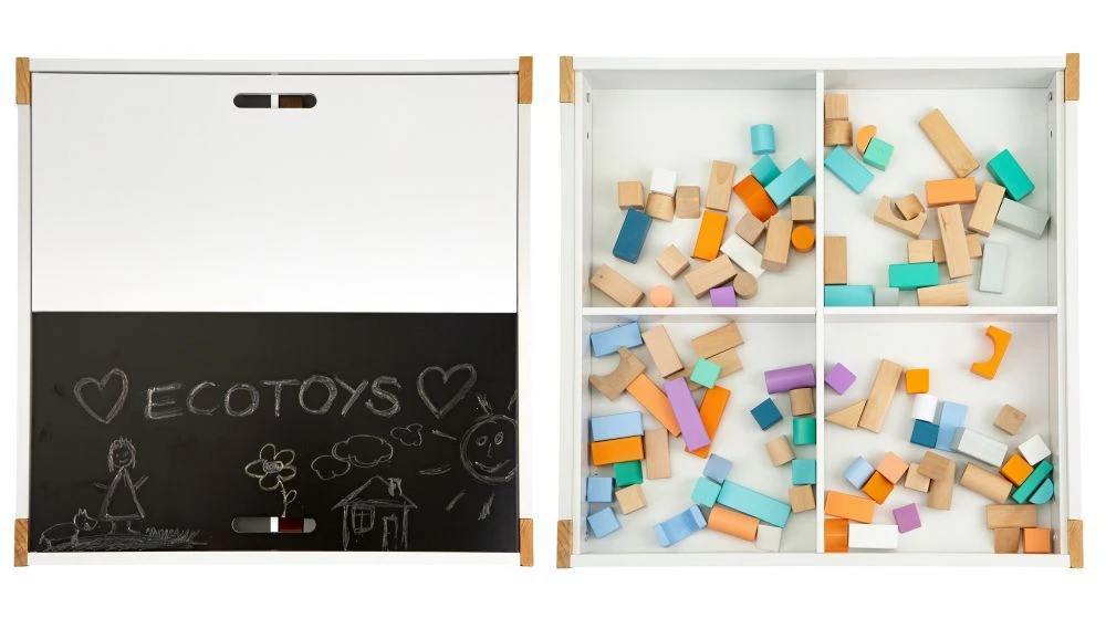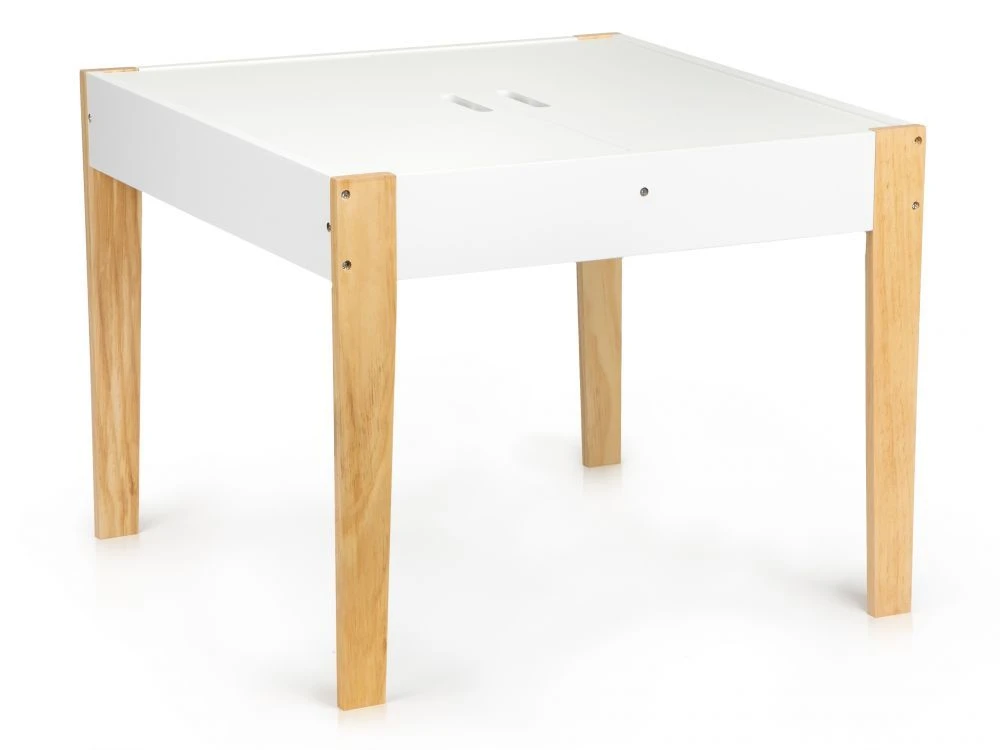 Stůl má dvoudílnou, odnímatelnou desku – pod ní se nachází 4 úložné přihrádky, které pomohou rychle uklidit pastelky, kostky nebo jiné drobnosti. Jedna část desky může sloužit také jako tabule na psaní křídou. Výrobce uvádí odolnost vůči běžnému dětskému používání a hladce zaoblené hrany pro bezpečnější manipulaci.
