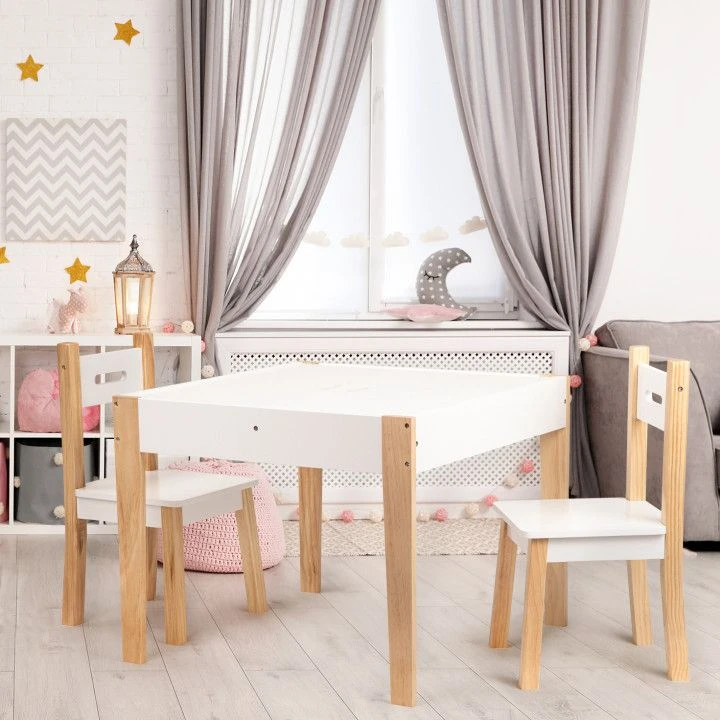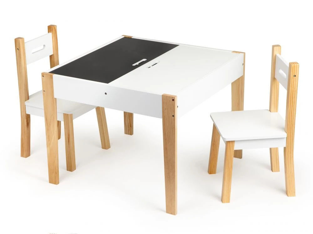Praktická dětská sada nábytku obsahuje stolek a 2 židle a je ideální pro každodenní kreslení, hraní, tvoření i svačinu. Sada je vyrobená z lakované MDF desky v kombinaci s borovicovým dřevem (nohy), díky čemuž působí stabilně a zároveň dobře zapadne do moderního interiéru.