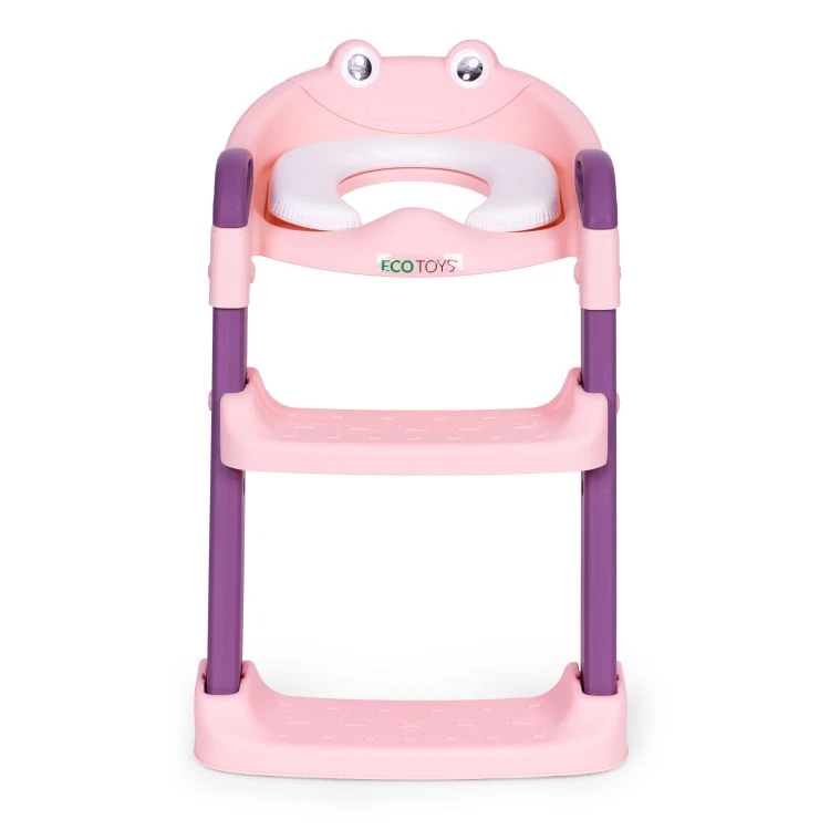 Konstrukce je navržená pro stabilní postavení u toalety, nechybí madla pro přidržení a protiskluzové prvky pro lepší bezpečnost na podlaze i na schůdcích. Roztomilý design a růžové provedení pomáhají, aby si dítě na používání toalety zvykalo přirozeněji.