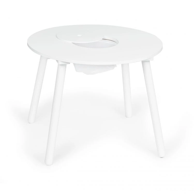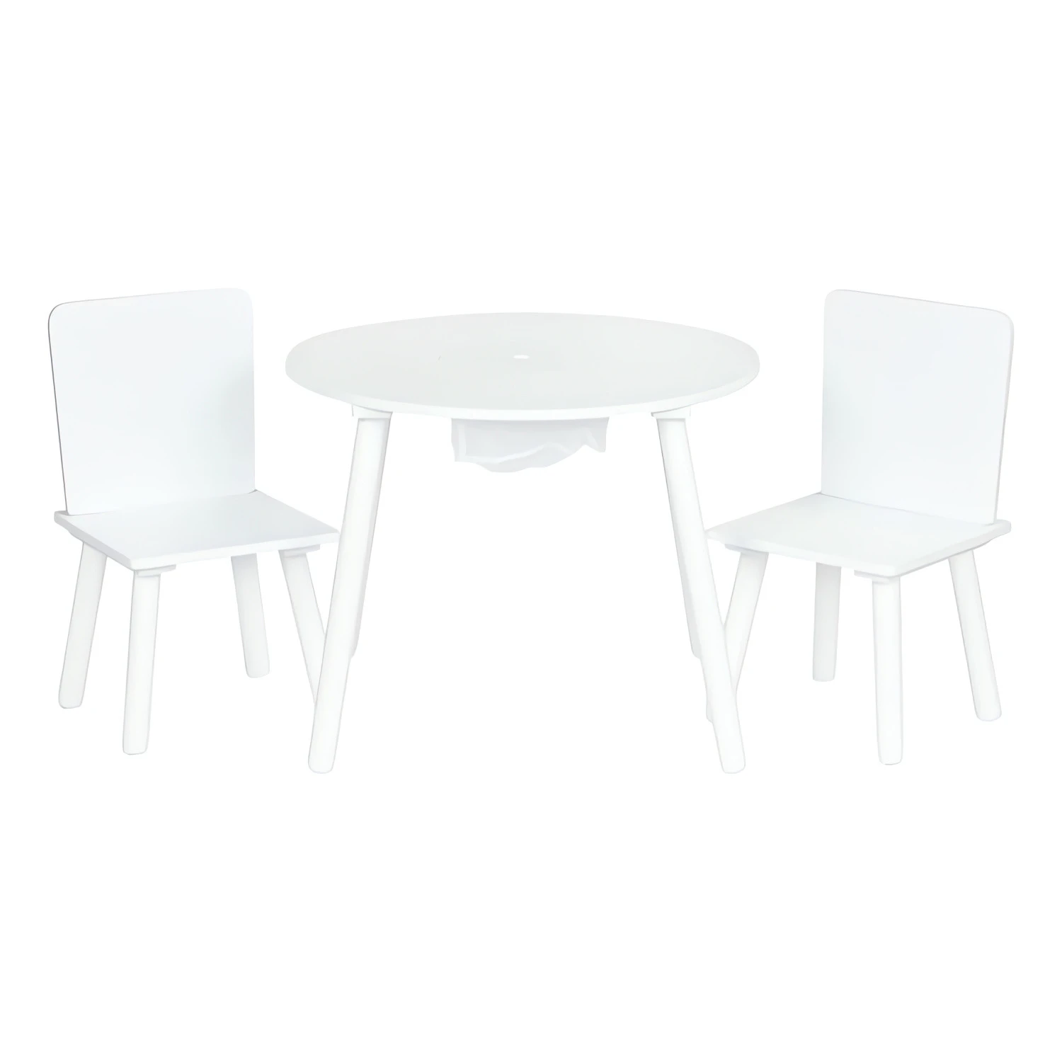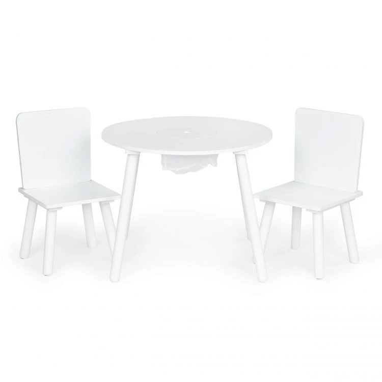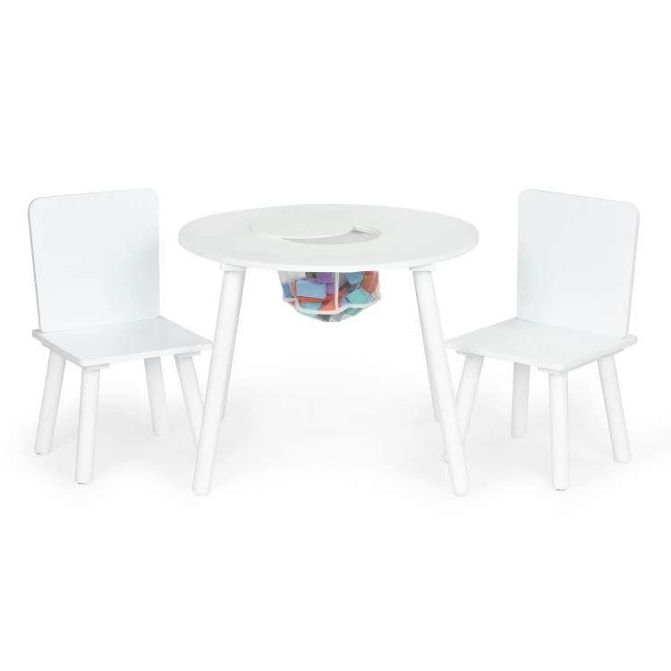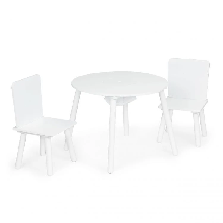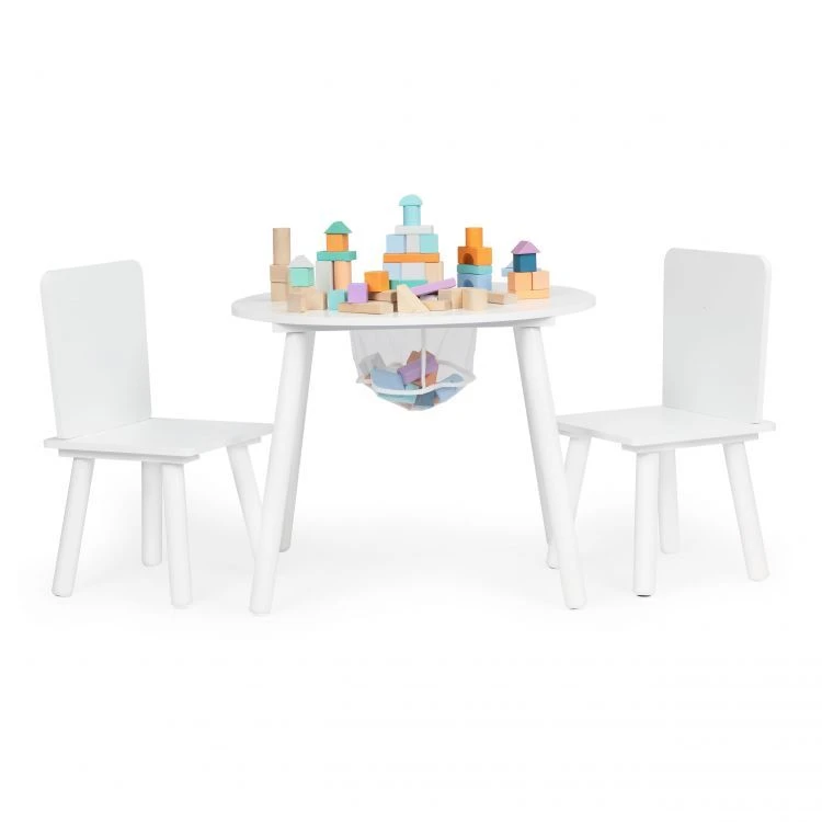 Dětská sada nábytku obsahuje kulatý stolek a 2 židle a je ideální pro každodenní kreslení, tvoření, hraní i na svačinu. Nábytek je vyrobený z kombinace MDF a dřeva, má hladce zaoblené hrany a je navržený tak, aby odolal běžnému dětskému používání. Stolek má praktický otvor v desce (např. pro ukládání hraček/drobností) a pod deskou je umístěný síťovaný úložný košík, který pomůže udržet pořádek v dětském koutku.