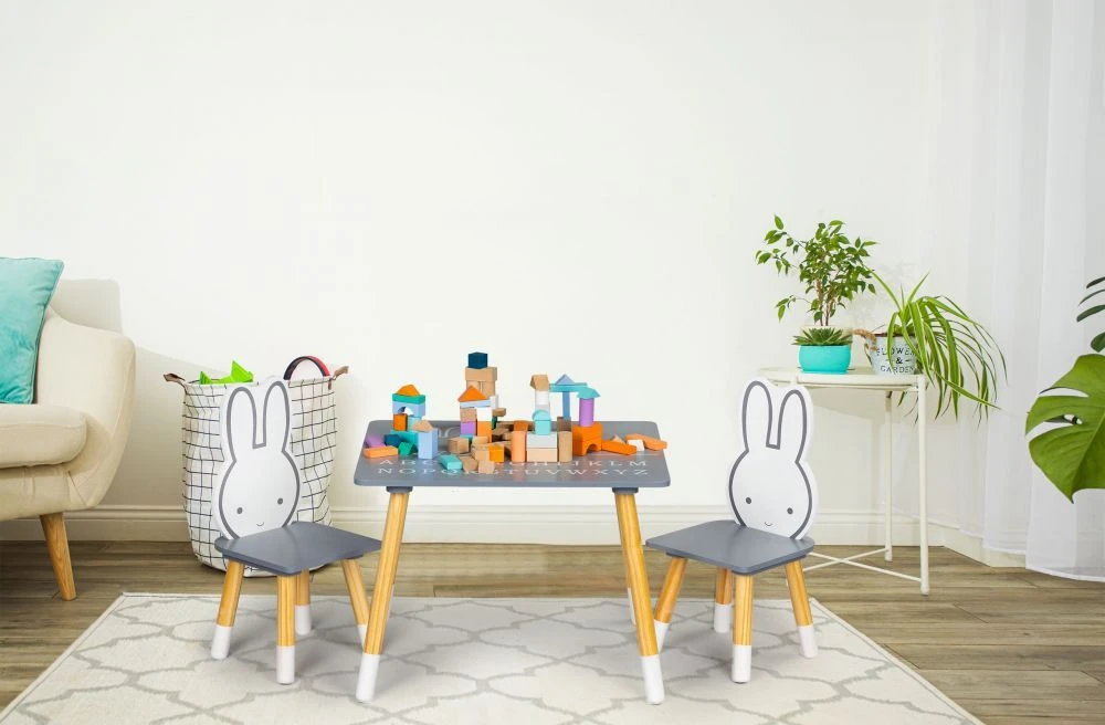 Stylová dětská sada nábytku obsahuje stolek a dvě židle a je ideální pro kreslení, hraní, učení i svačinu. Roztomilý motiv a tvarovaná opěrka židle podporují hravou atmosféru v dětském pokoji.