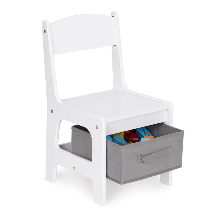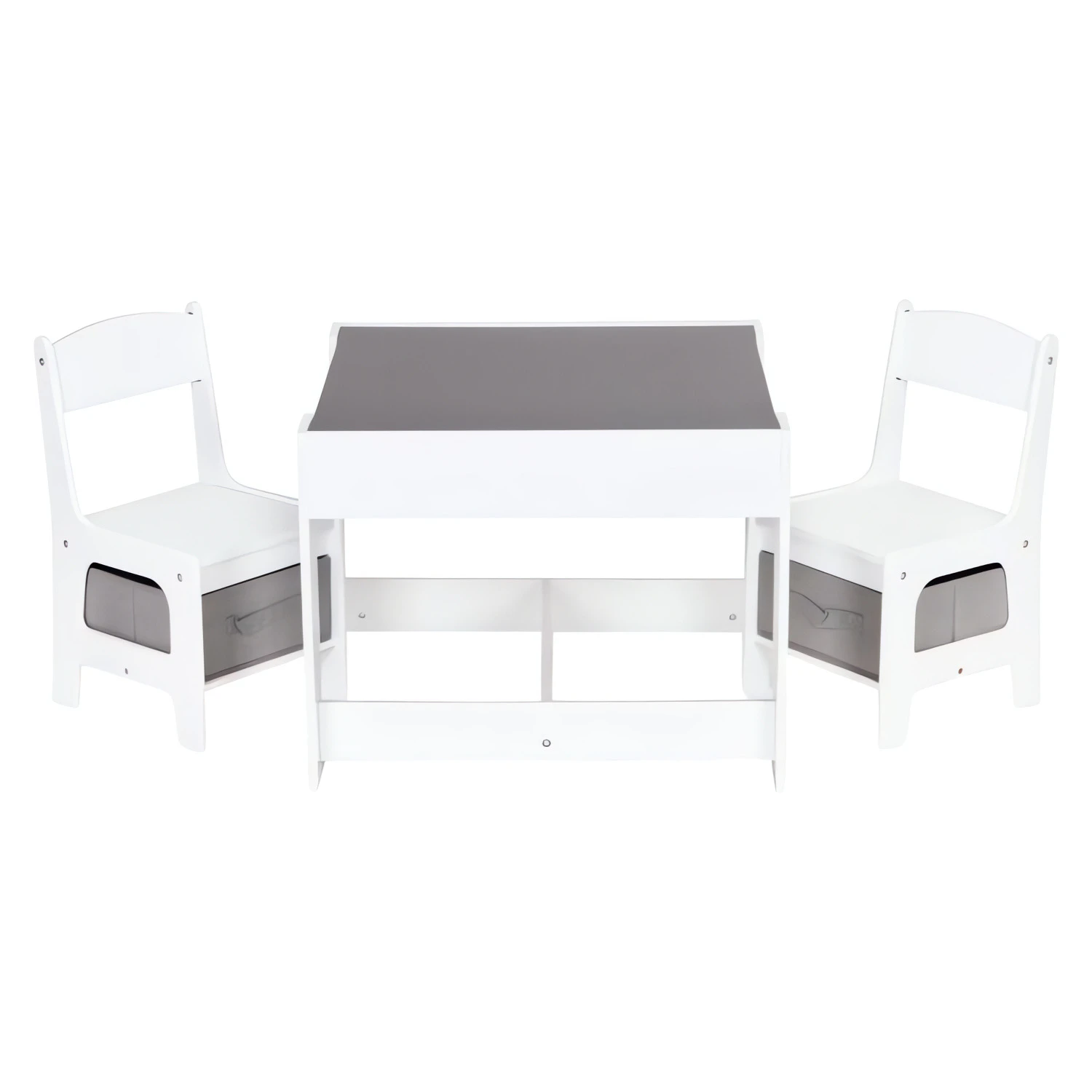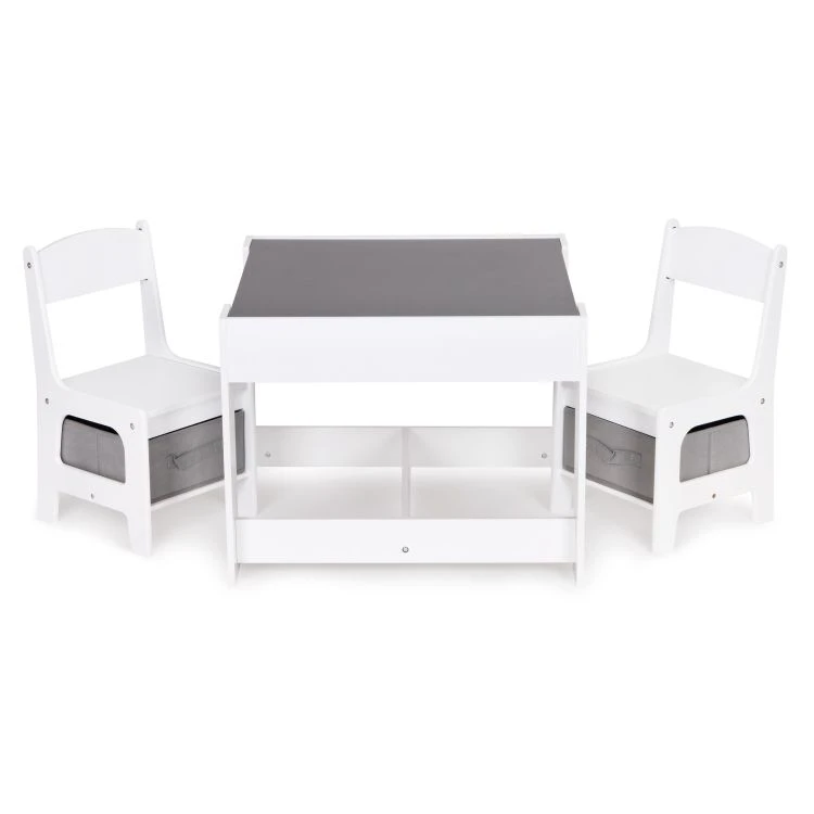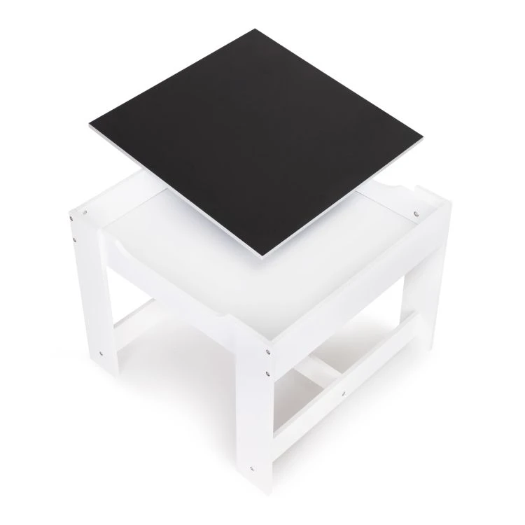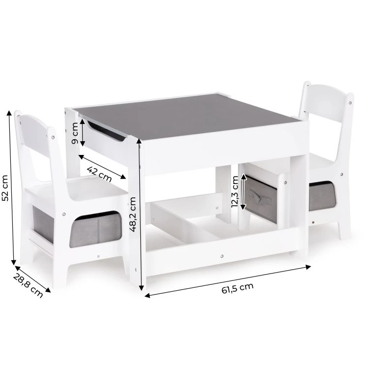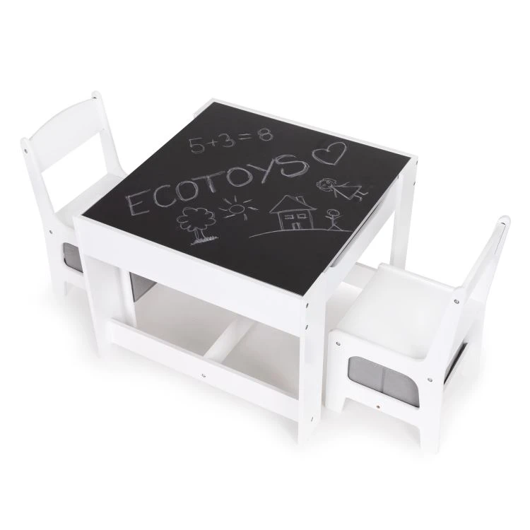 Praktická dětská sada nábytku obsahuje stůl a 2 židle a je ideální pro každodenní kreslení, hraní, učení i na svačinu. Celá sada má pevnou a stabilní konstrukci z MDF, která je vhodná pro běžné dětské používání. Stůl je vybaven oboustrannou, odnímatelnou deskou, jejíž jedna strana slouží jako tabule na psaní křídou. Pod deskou se nachází úložný prostor na kostky, pastelky a další drobnosti.