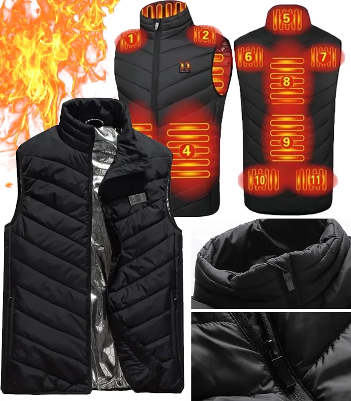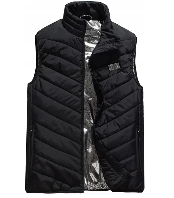 Naše vesta má 11 topných panelů umístěných na strategických místech, aby uživateli poskytly pocit pohodlí. Zahřeje se za 5 sekund a po 5 minutách se přepne do režimu nižší, konstantní teploty. Dvě tlačítka usnadňují výběr, kterou část těla chcete zahřívat. Klasická černá barva je univerzální a estetická, nikdo si nevšimne, že má vesta skrytou funkci vyhřívání. Zapínání na zip až ke krku, dodává teplo samo o sobě. Ideální pro lidi, kteří tráví hodně času venku a jejichž pohyb nemůže být omezen množstvím oblečení.