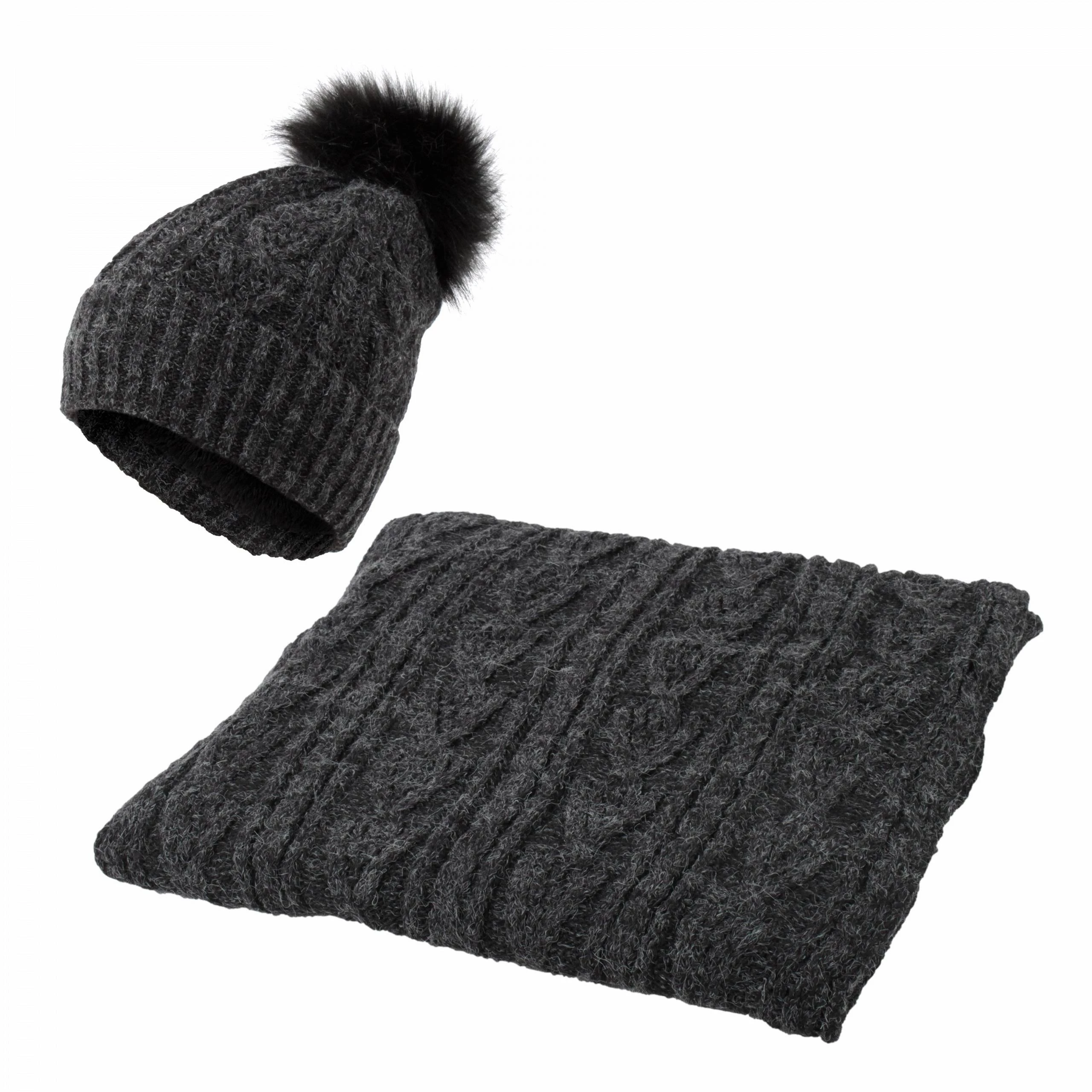 Teplá, dámská zimní dvoudílná souprava. Sada obsahuje pletenou čepici a šálu.