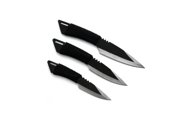 Sada 3 nožů s rukojetí pokrytou lanem, která zajišťuje pohodlí při používání a zároveň zajišťuje nízkou hmotnost. Nože jsou vyrobeny z jednoho kusu kovu, což zaručuje jejich odolnost. Nůž je pokryt černým ochranným povlakem.