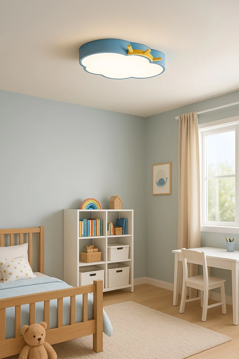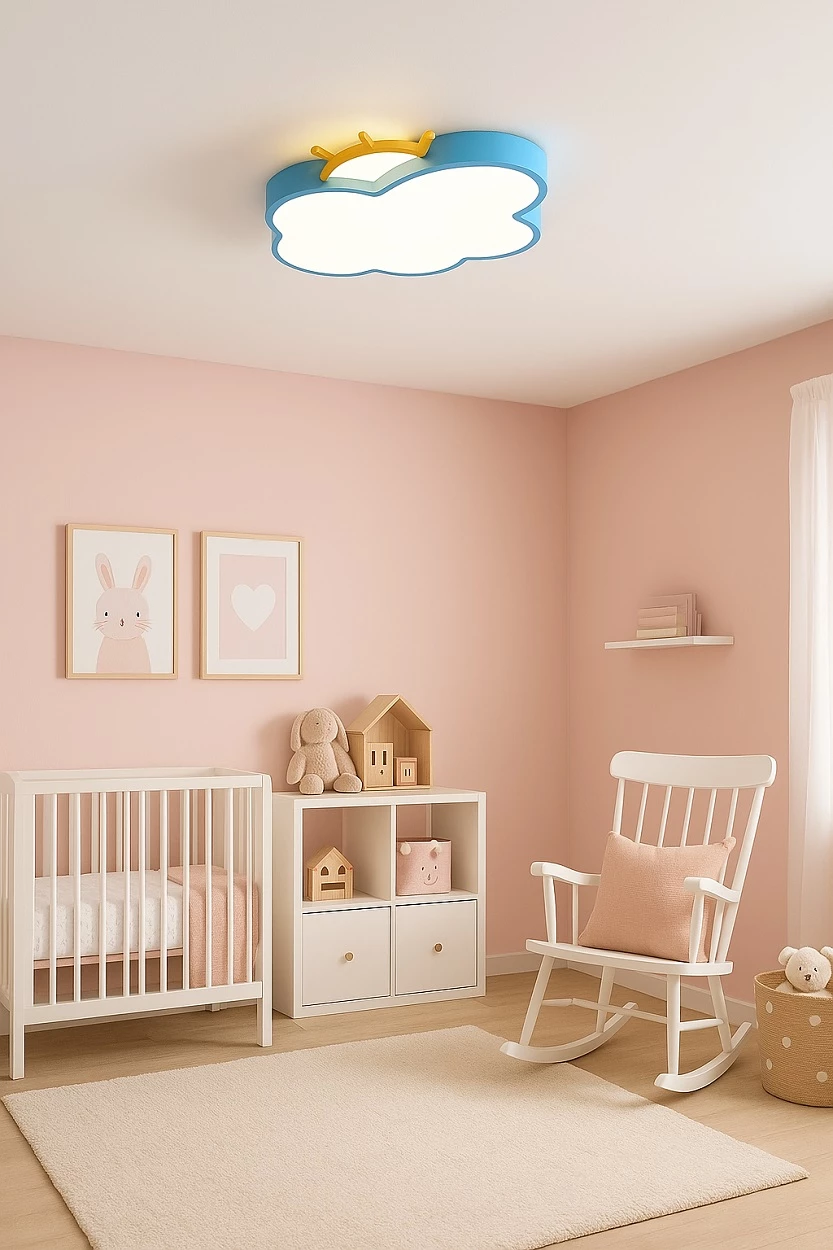 Stropní lampa v podobě mraku pro děti byla navržena s ohledem na nejmladší. Jemný tvar má uklidňující účinek a možnost nastavit barvu světla umožňuje přizpůsobit osvětlení různým denním dobám – od jasného, energického světla pro hraní až po teplé, útulné světlo pro usínání.