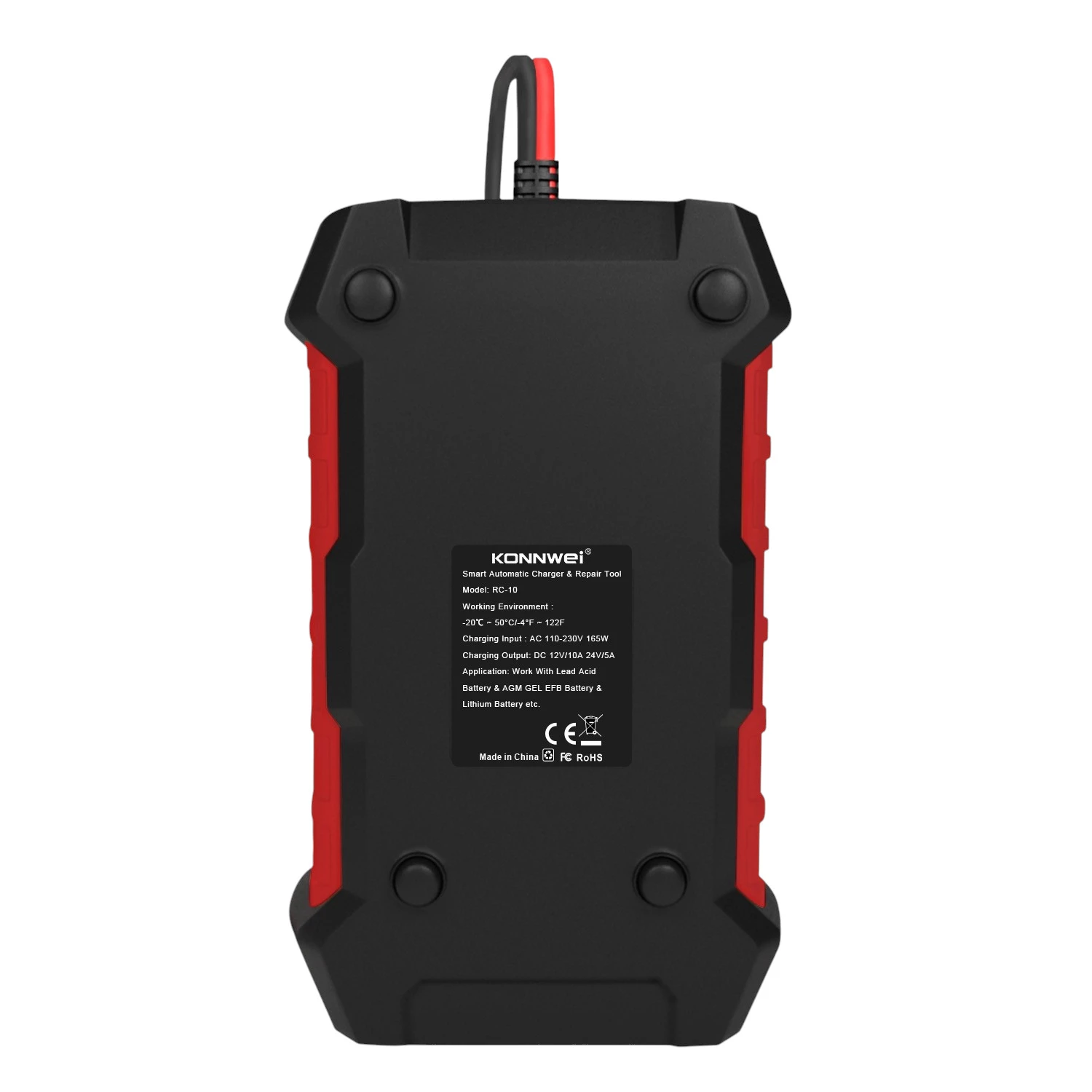 RC-10 je výkonný a spolehlivý nástroj pro nabití a obnovení stavu baterií v automobilech, motocyklech a jiných vozidlech. S RC-10 může nabíjet a opravovat všechny 12V i 24V olověné akumulátory včetně běžných zalitých, AGM plochých, AGM spirálových nebo gelových akumulátorů nebo lithiových akumulátorů o kapacitě 4Ah až 150Ah. Nabíječka je vybavena velkým LCD displejem, který zobrazuje stav a lze ho snadno číst i za slunečného dne.
