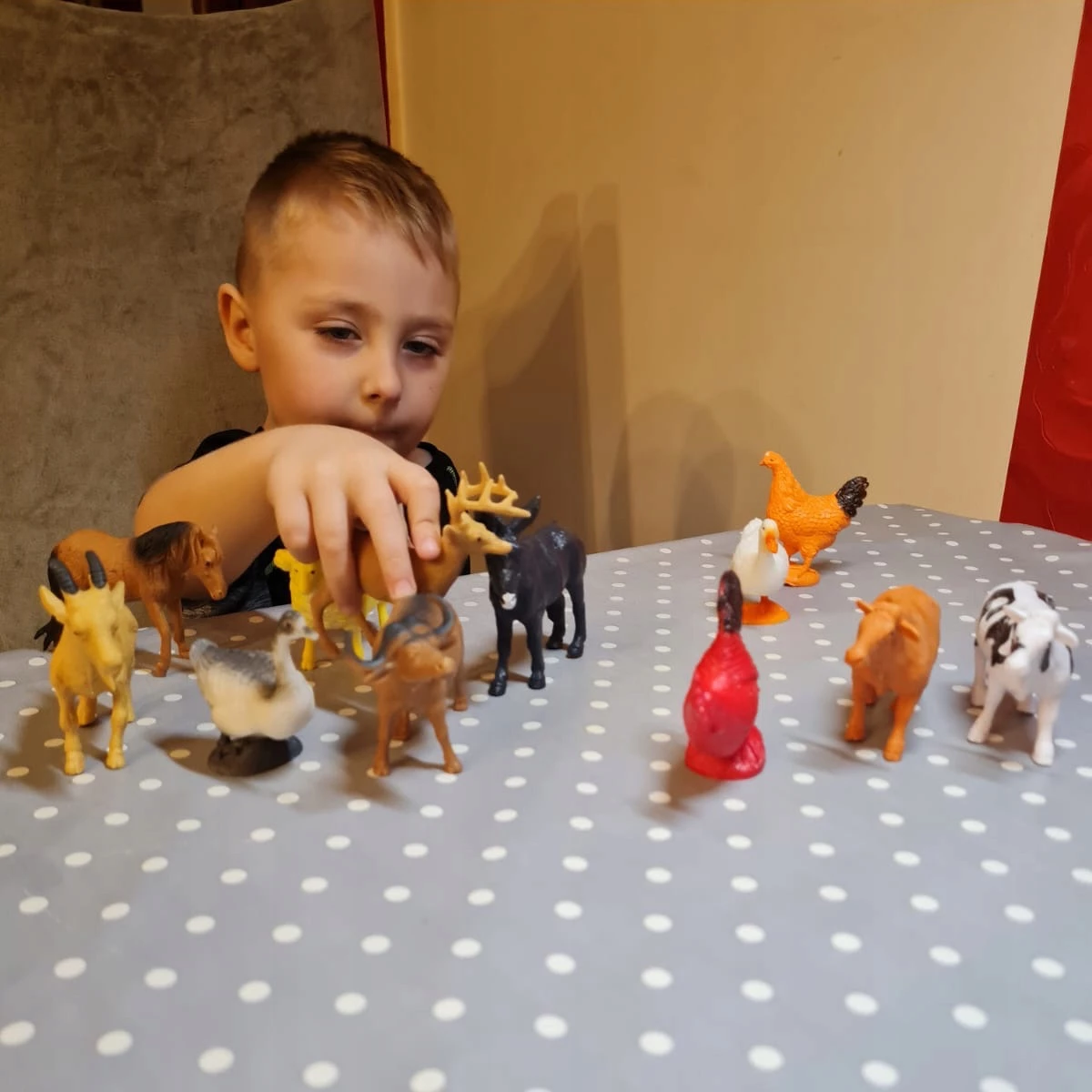 figurky: ovce, kůň, krávy 2 různých plemen, koza, osel, slepice, kachna, buvol, husa, kohout, jelen