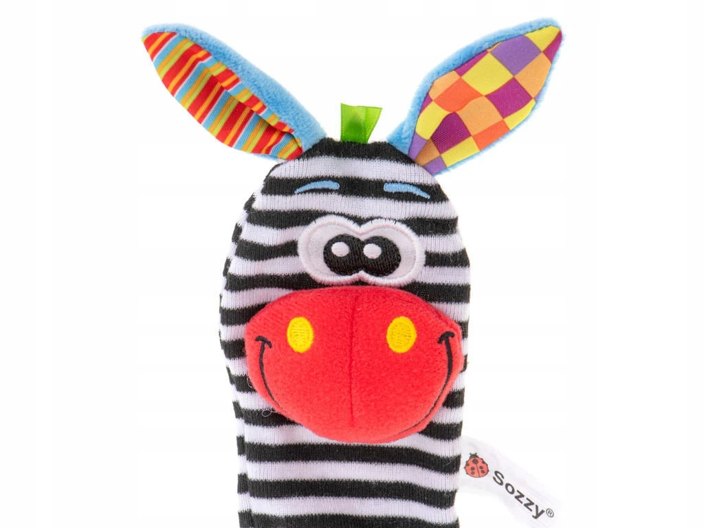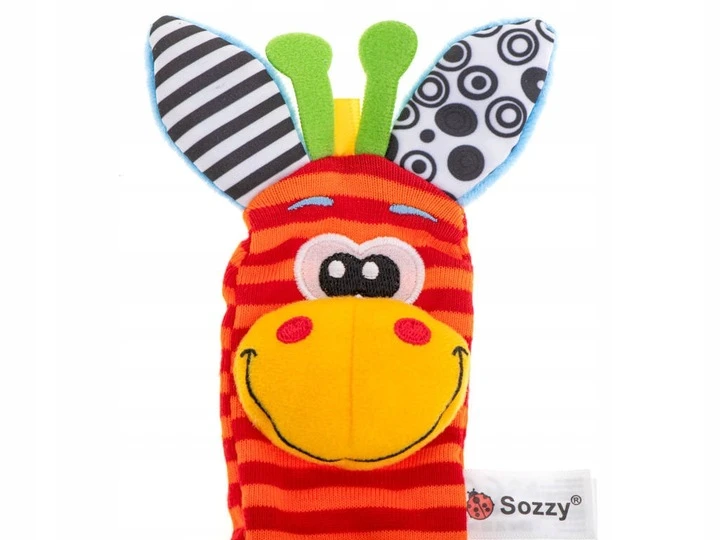 Zářivé barvy a kontrastní vzory povzbuzují dítě, aby se soustředilo na vzor, zatímco měkké materiály a různé textury stimulují hmat dítěte. Přední chrastítko je trojrozměrné a vydává jemný zvuk, když dítě pohne nohou.