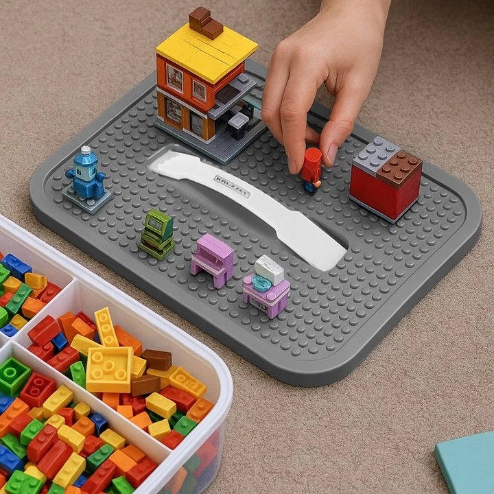 Víko organizéru má dvojí funkci - neslouží jen k uzavření, ale také jako kompatibilní základna s nejoblíbenějšími kostkami dostupnými na trhu. Díky tomu si dítě může stavět své konstrukce přímo na krabici, což z organizéru dělá mobilní hřiště.Je toskvělé řešení na cesty, do malých místností a při kreativních výzvách.