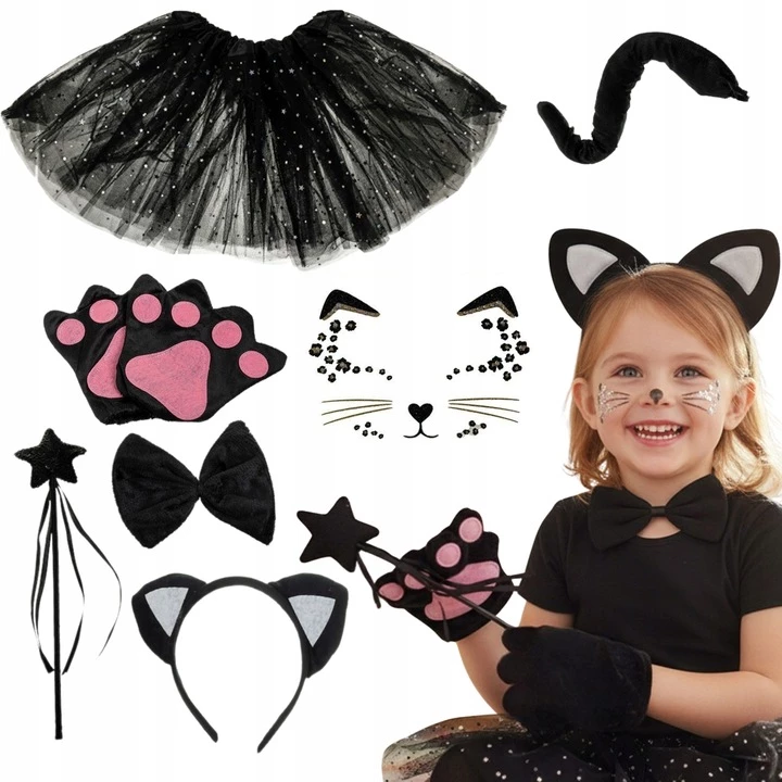 Souprava obsahuje vše potřebné pro dokonalou proměnu v kočičku – nadýchanou tylovou sukýnku, čelenku s oušky, mašli, tlapky, ocásek, kouzelnou hůlku a ozdobné samolepky na obličej.