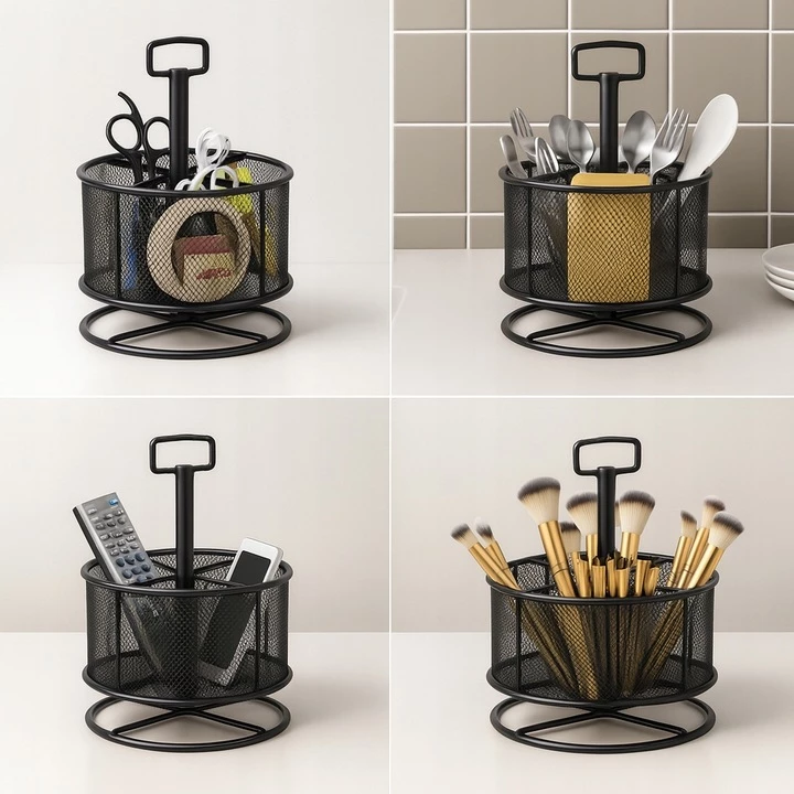 Praktický a moderní multifunkční držák na psací potřeby, který je ideální pro organizaci vašich kancelářských nebo školních pomůcek. Díky otočné základně o 360° je snadno přístupný ze všech stran. Vyroben z odolného a vzdušného kovu, který zajišťuje pevnost a dlouhou životnost. Perfektní pro udržení pořádku a přehlednosti na pracovním stole.