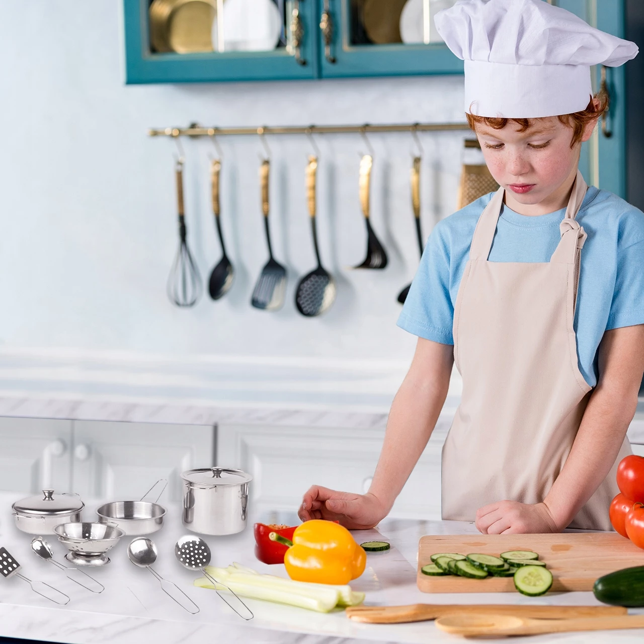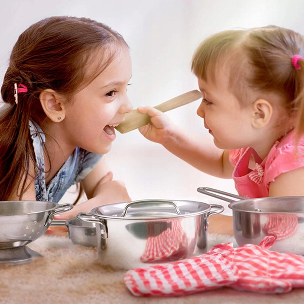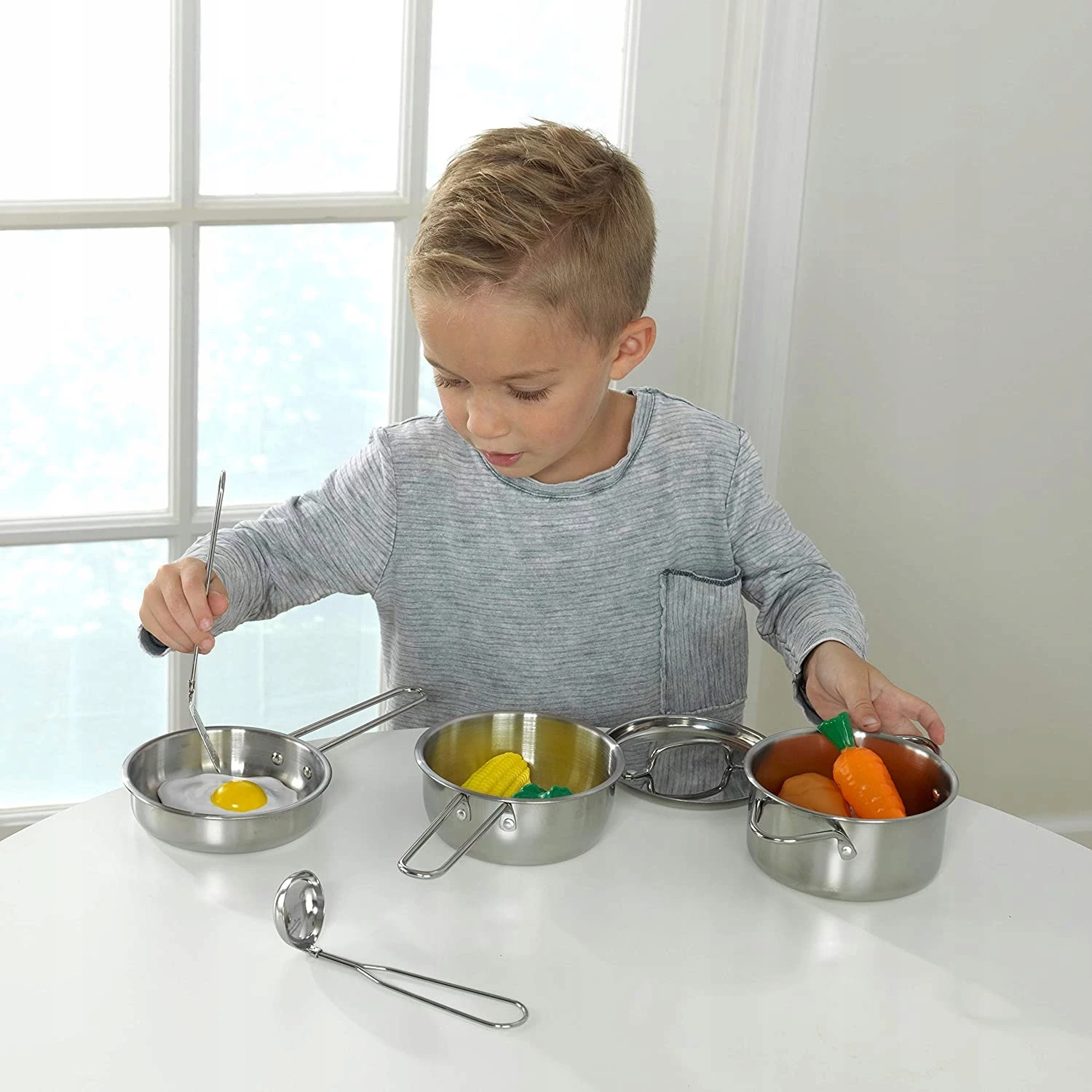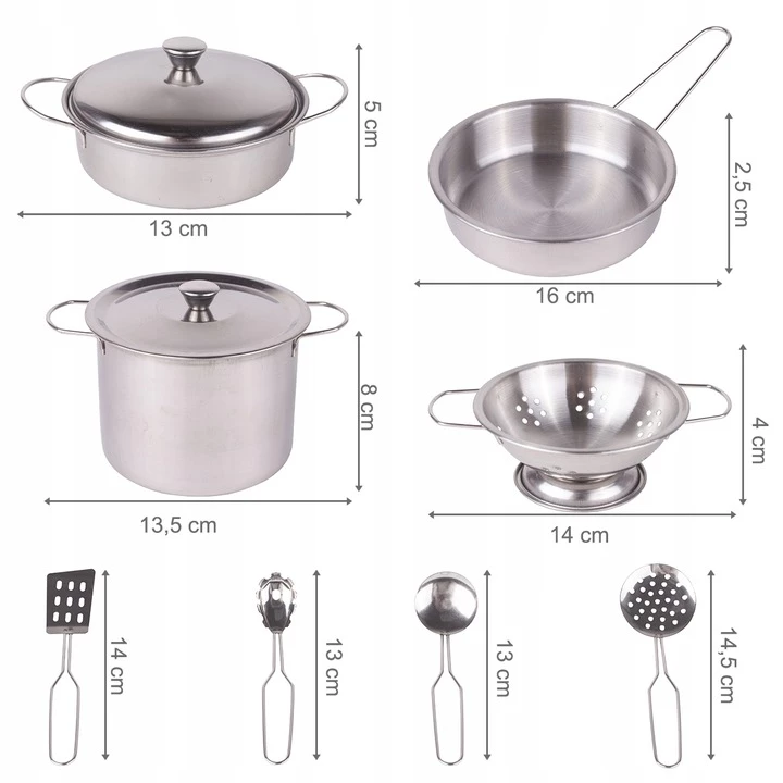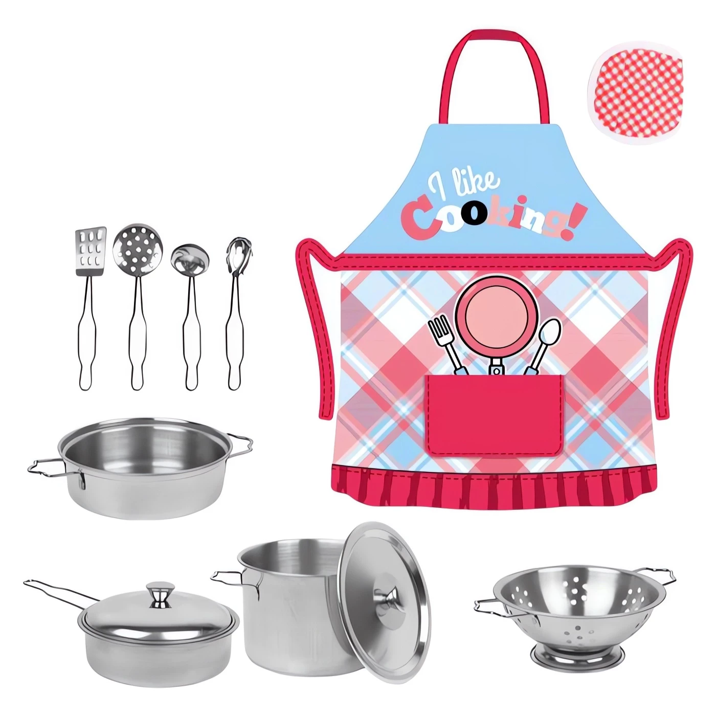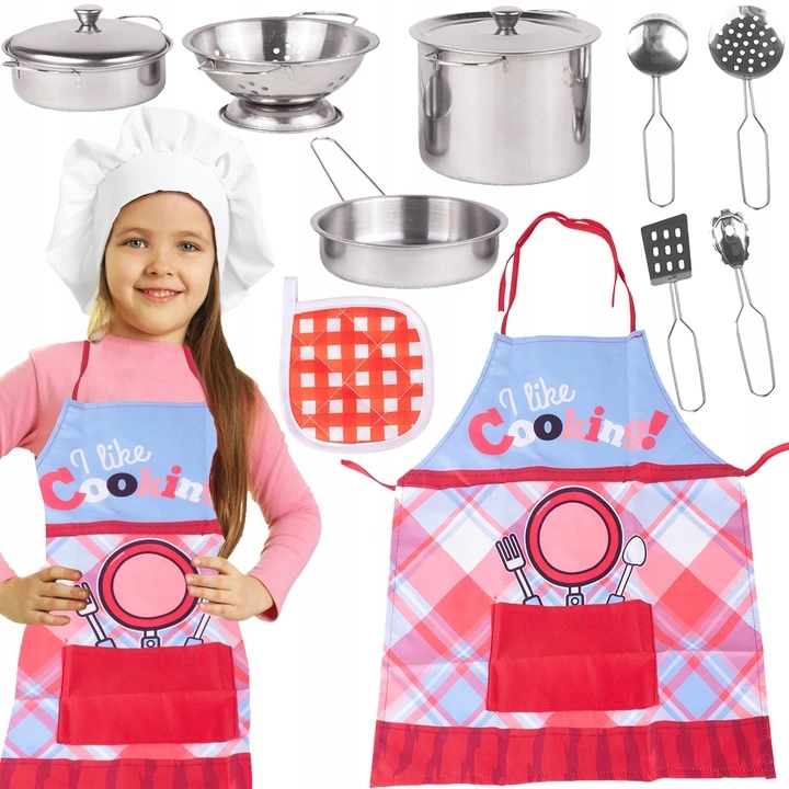 Tento kovový kuchyňský set přináší dětem spoustu zábavy při napodobování vaření, smažení a míchání – stejně jako dospělí. Sada obsahuje hrnce, pánve, cedník, kuchyňské náčiní, chňapku a krásnou barevnou zástěru s nápisem “I like cooking!”.