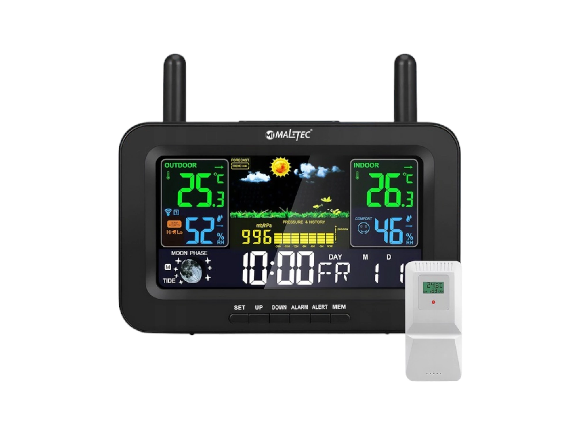 Meteorologická stanice je všestranné zařízení vybavené předpovědí počasí, fázemi měsíce, indikátorem vnitřního komfortu a alarmem bodu mrazu. Díky řadě dalších funkcí je ideálním nástrojem pro sledování povětrnostních podmínek.