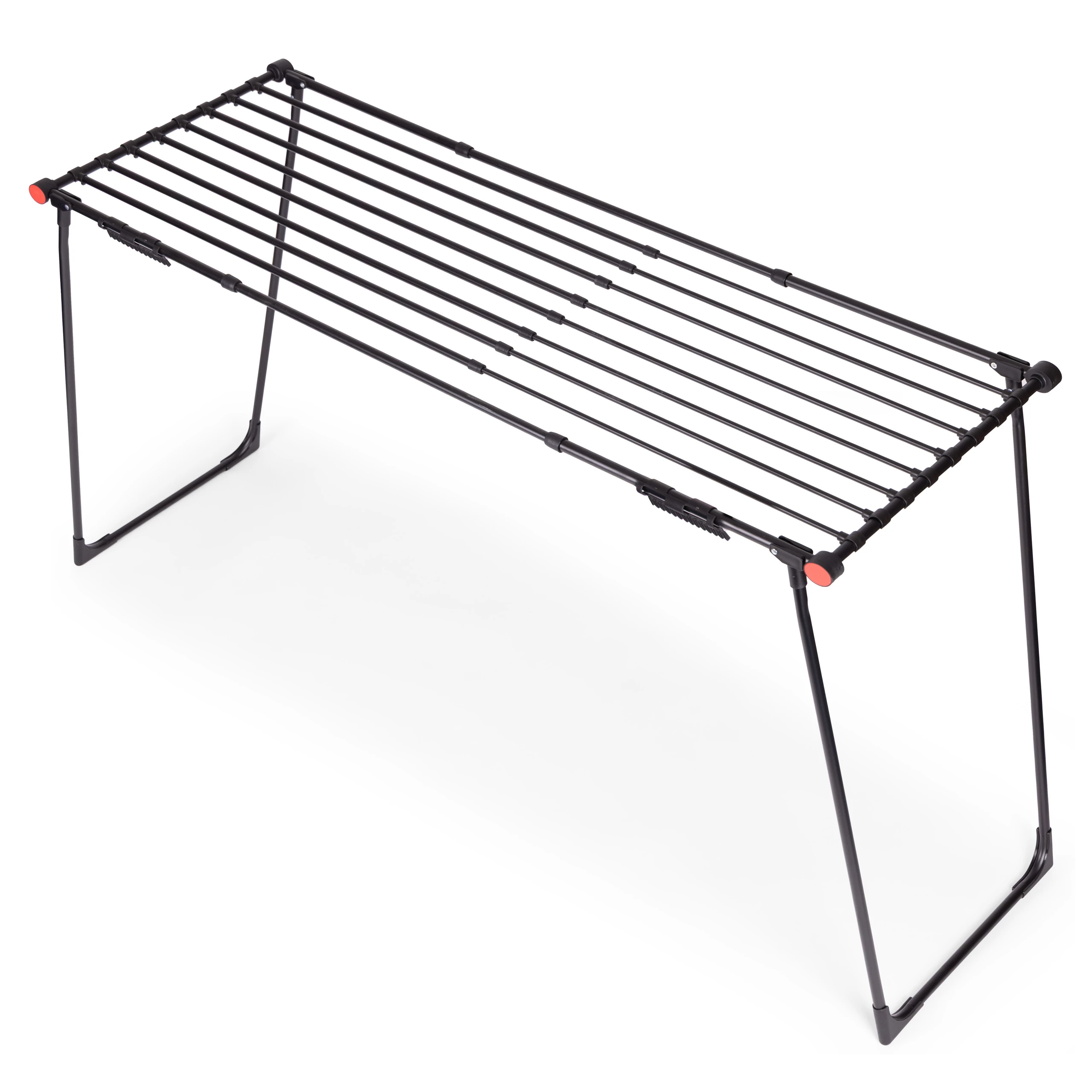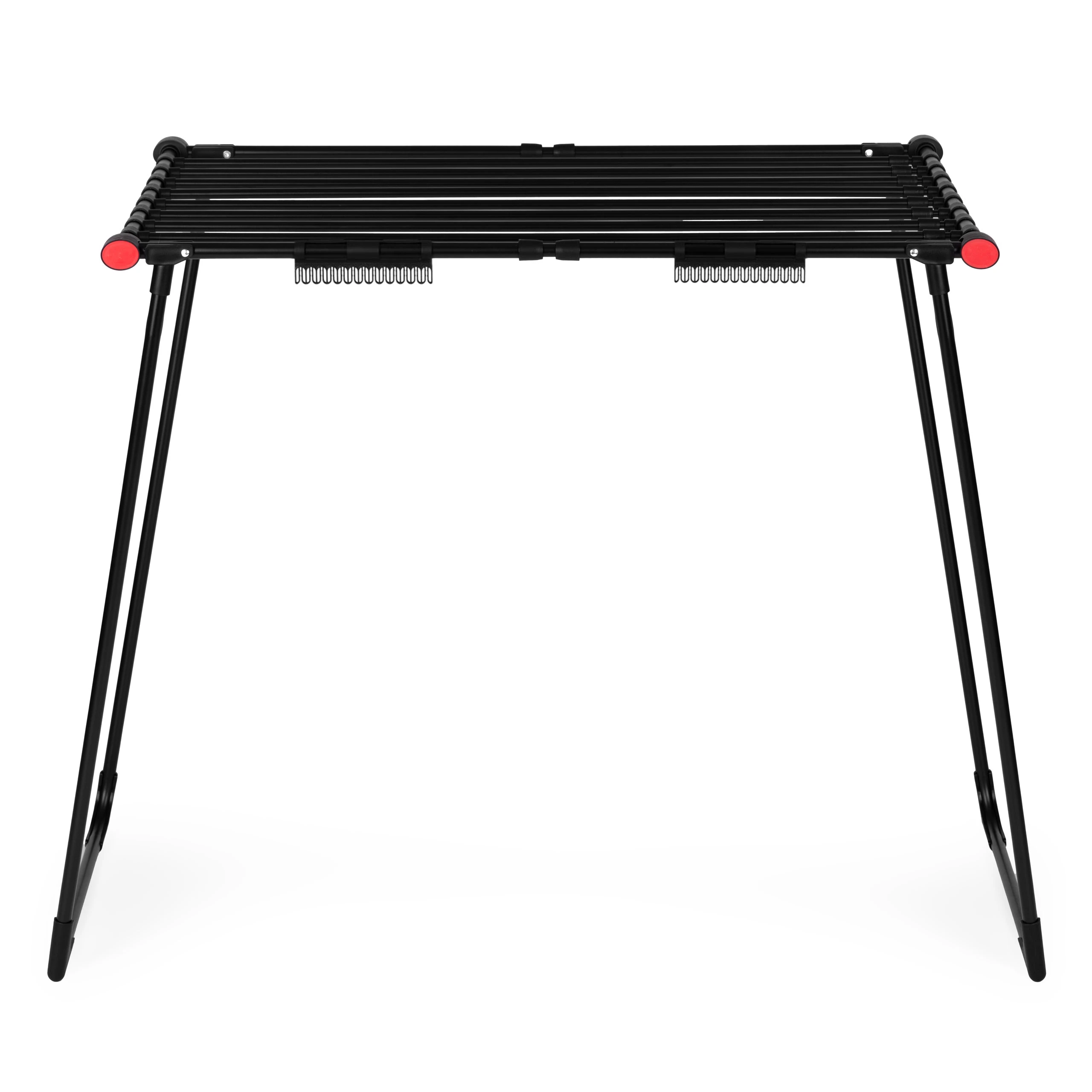 Nastavitelná délka 102–174 cm a možnost vyjmout jednotlivé tyče dávají volnost při sušení i větších textilií, jako jsou přikrývky, přehozy či závěsy. Integrované háčky umožňují praktické zavěšení spodního prádla a ponožek bez nutnosti kolíčků. Protiskluzové koncovky nohou zajišťují stabilitu i na kluzkém povrchu a sušák se při používání neposouvá.