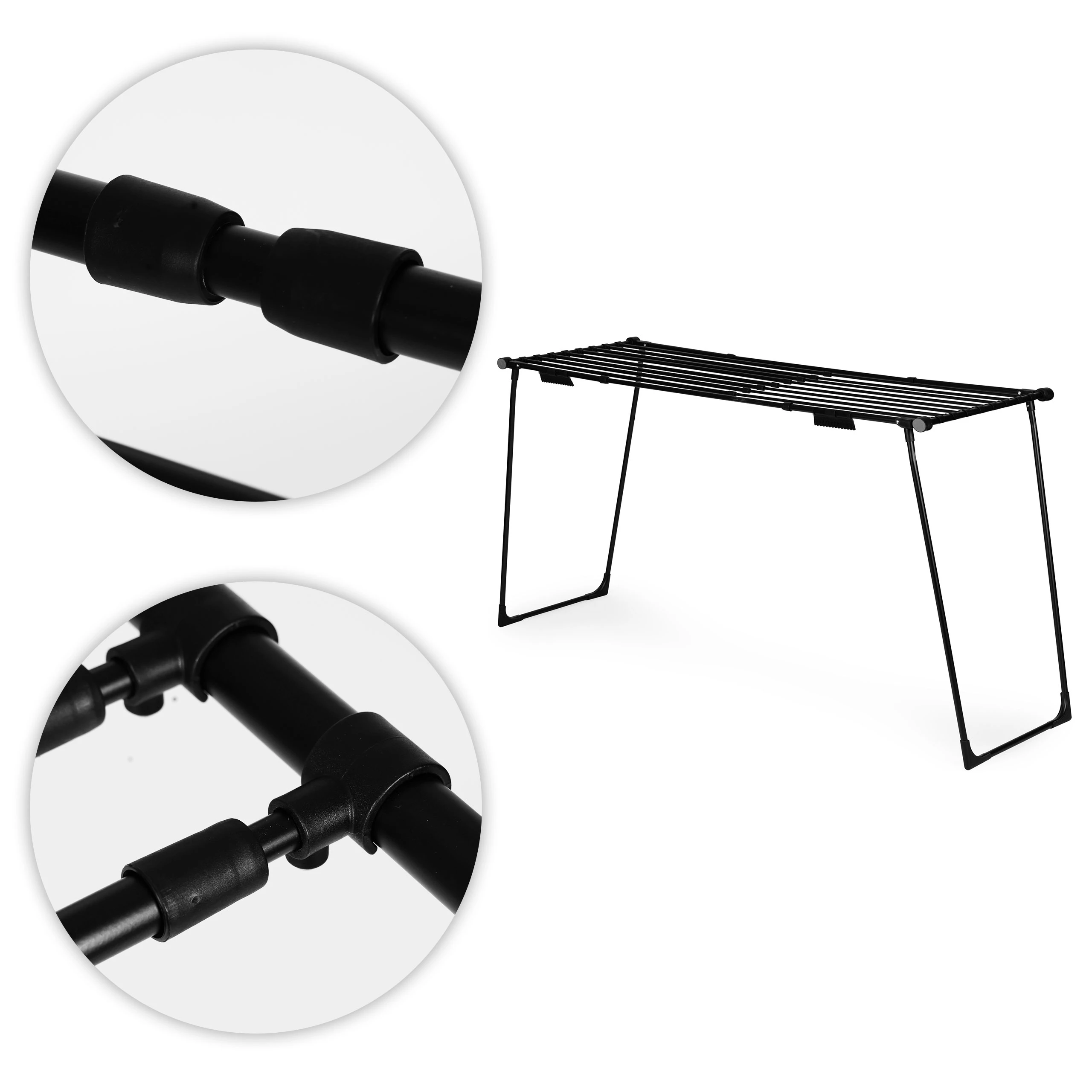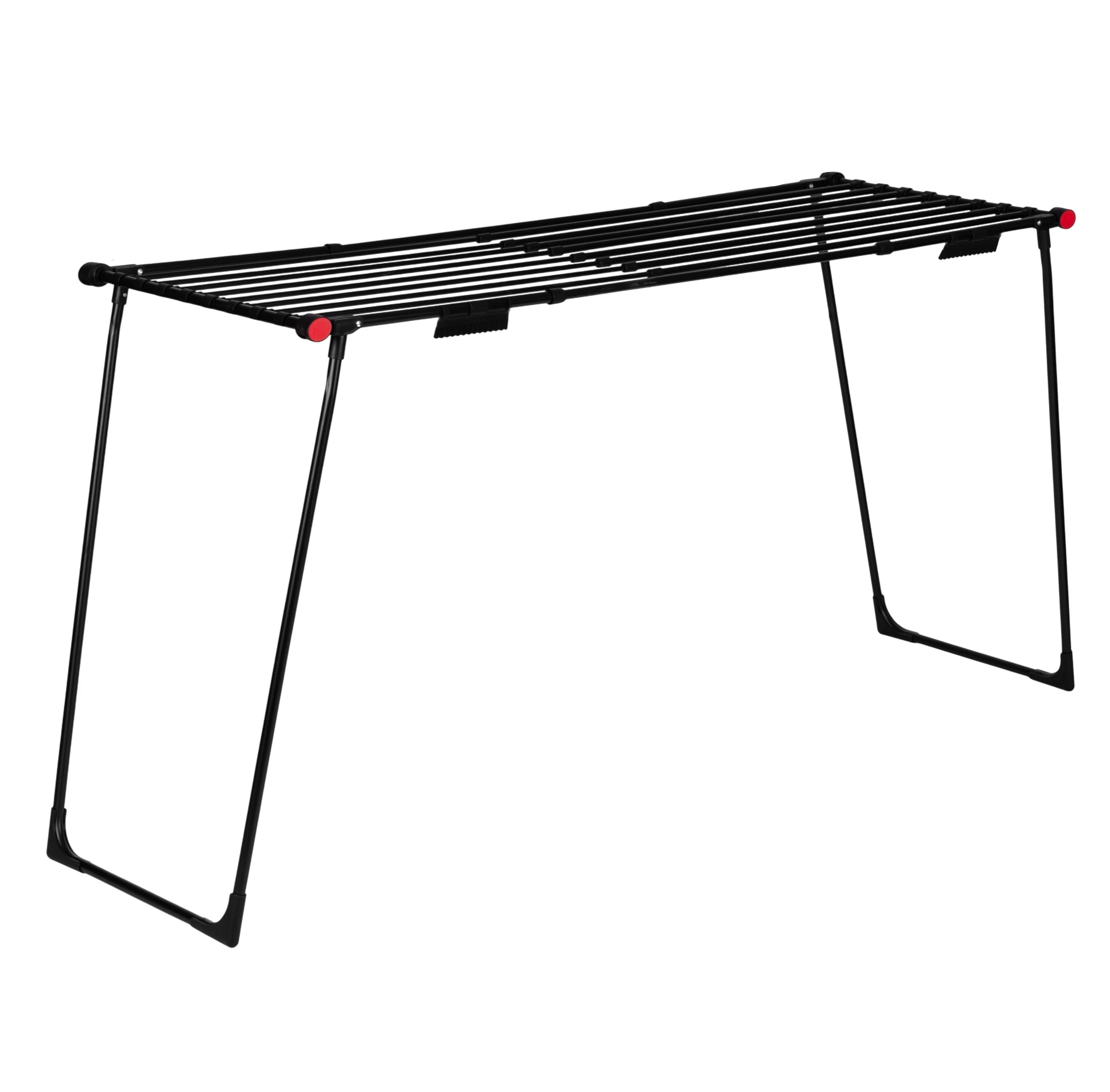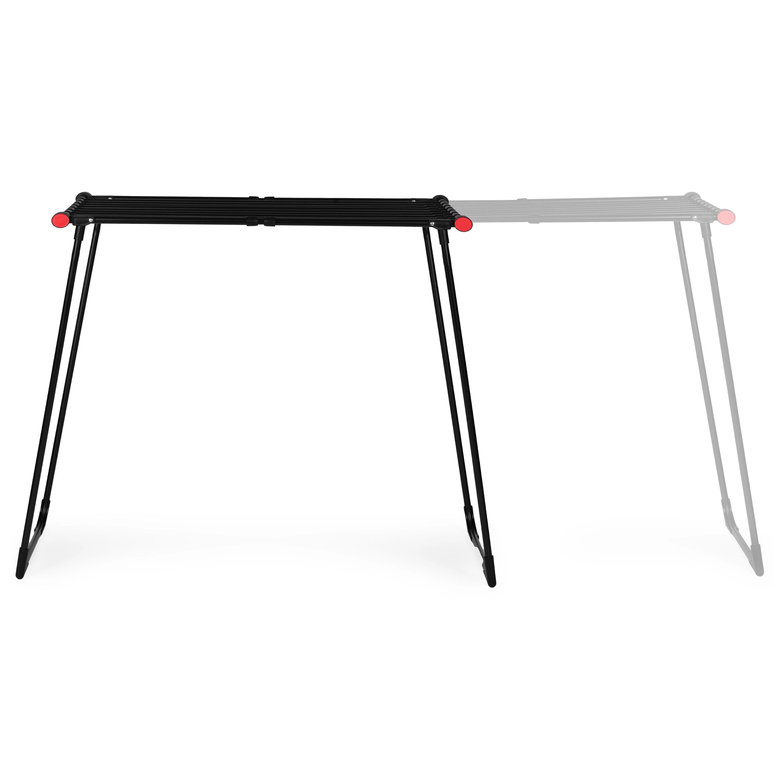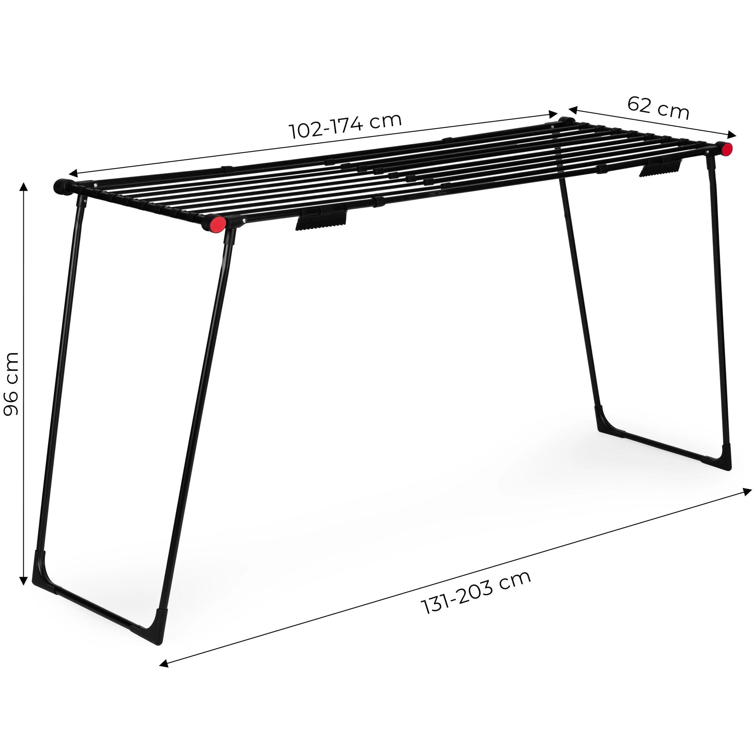 Sušák má rozměry vhodné pro každodenní provoz: šířka 131–203 cm, hloubka 62 cm a výška 96 cm. Maximální nosnost je až 15 kg, což pokryje běžné i větší dávky prádla. Černé provedení se hodí do moderních interiérů a odolná ocelová konstrukce přispívá k dlouhodobému používání.