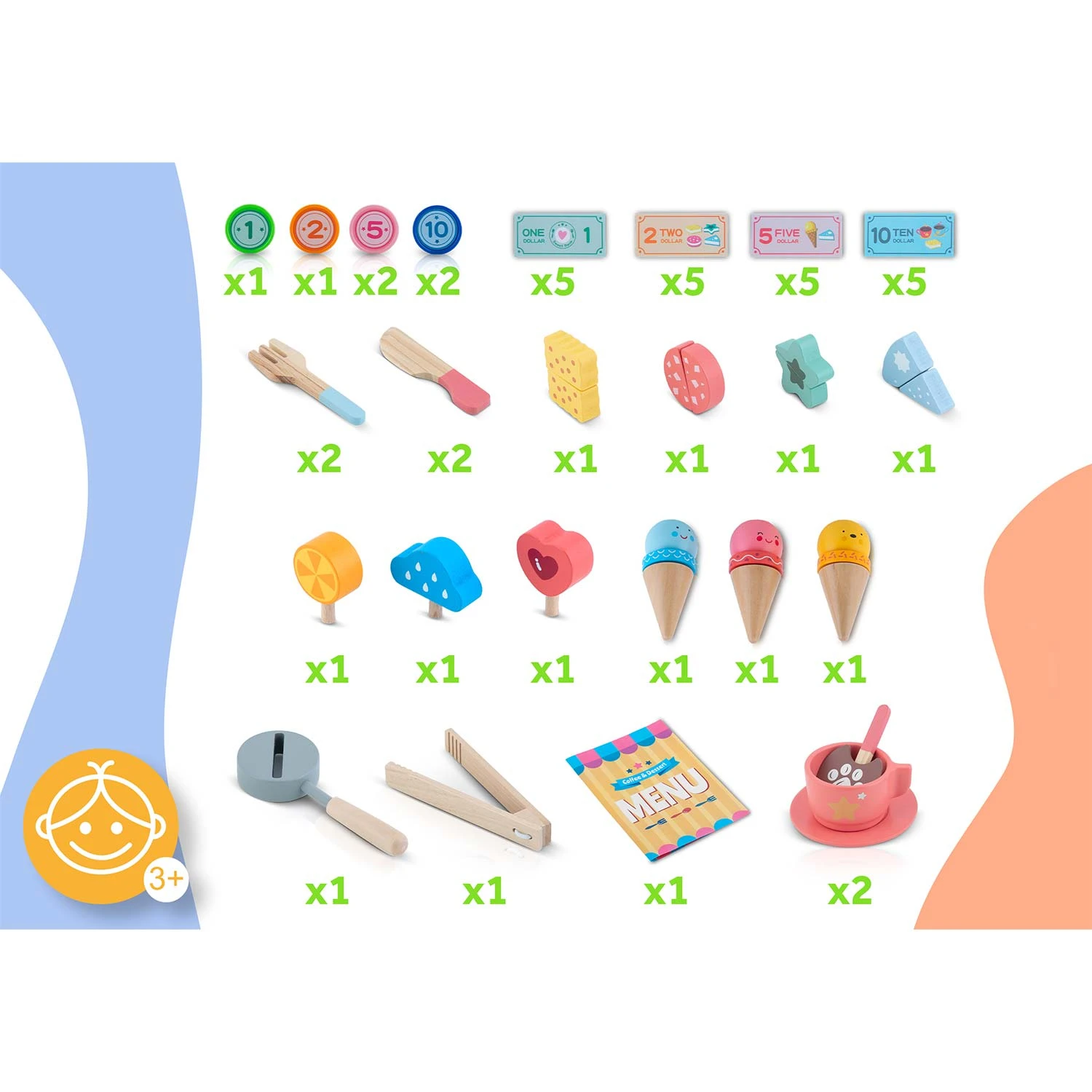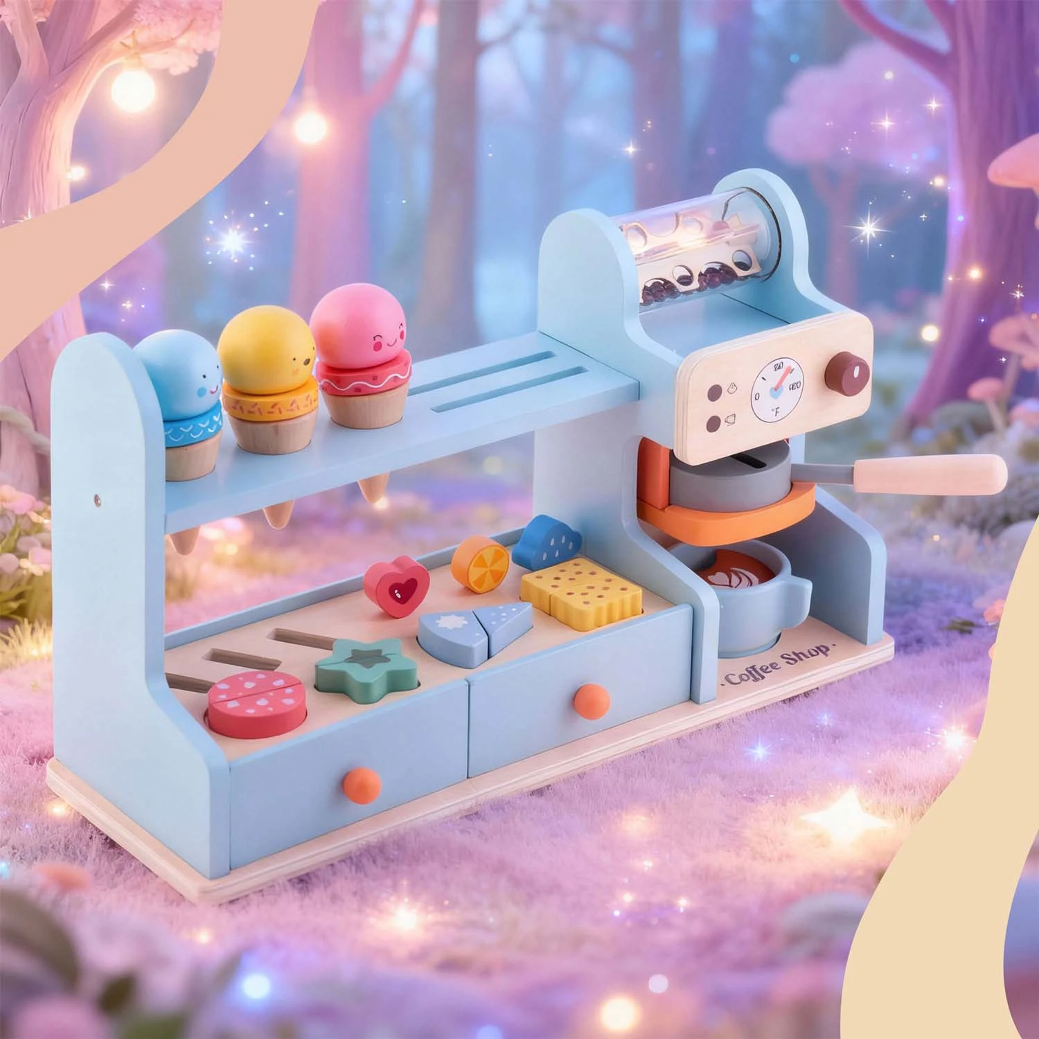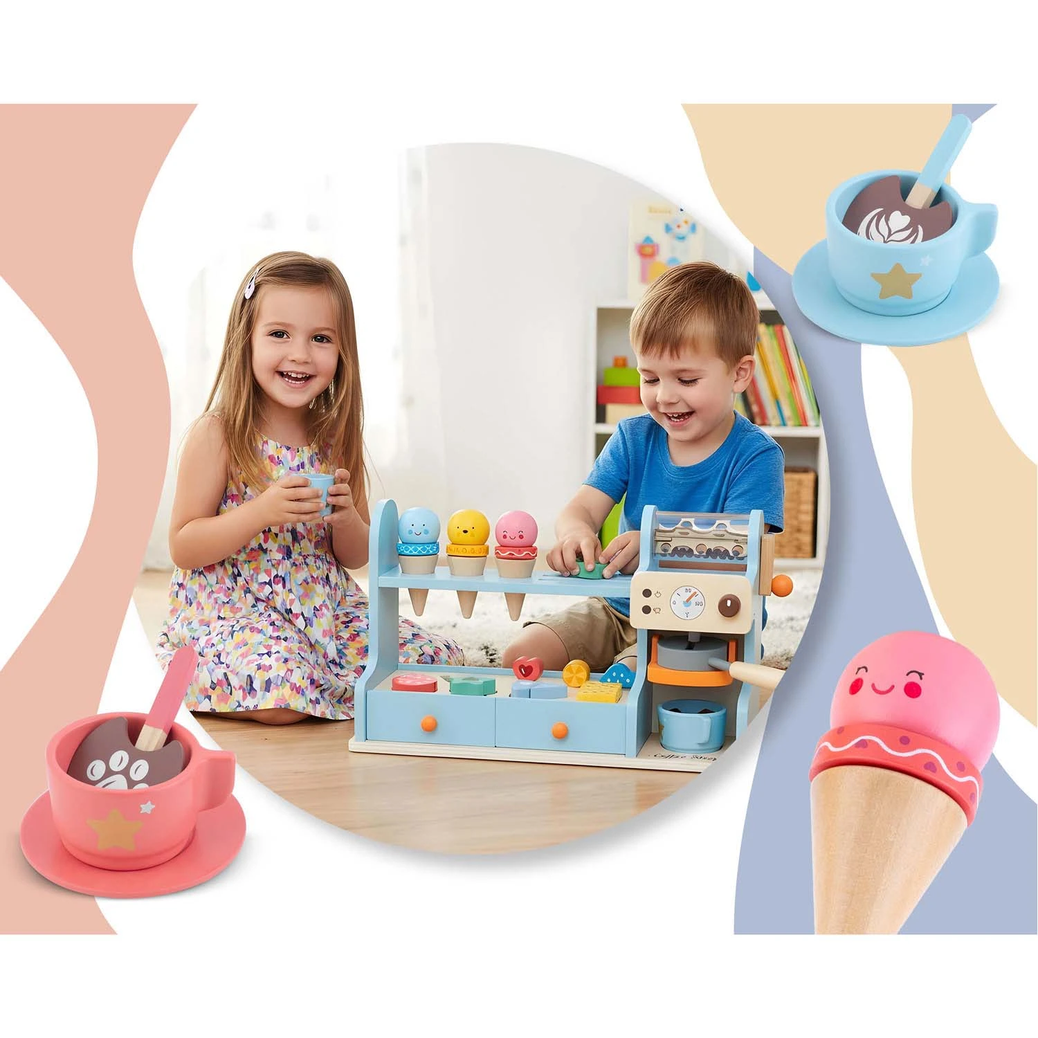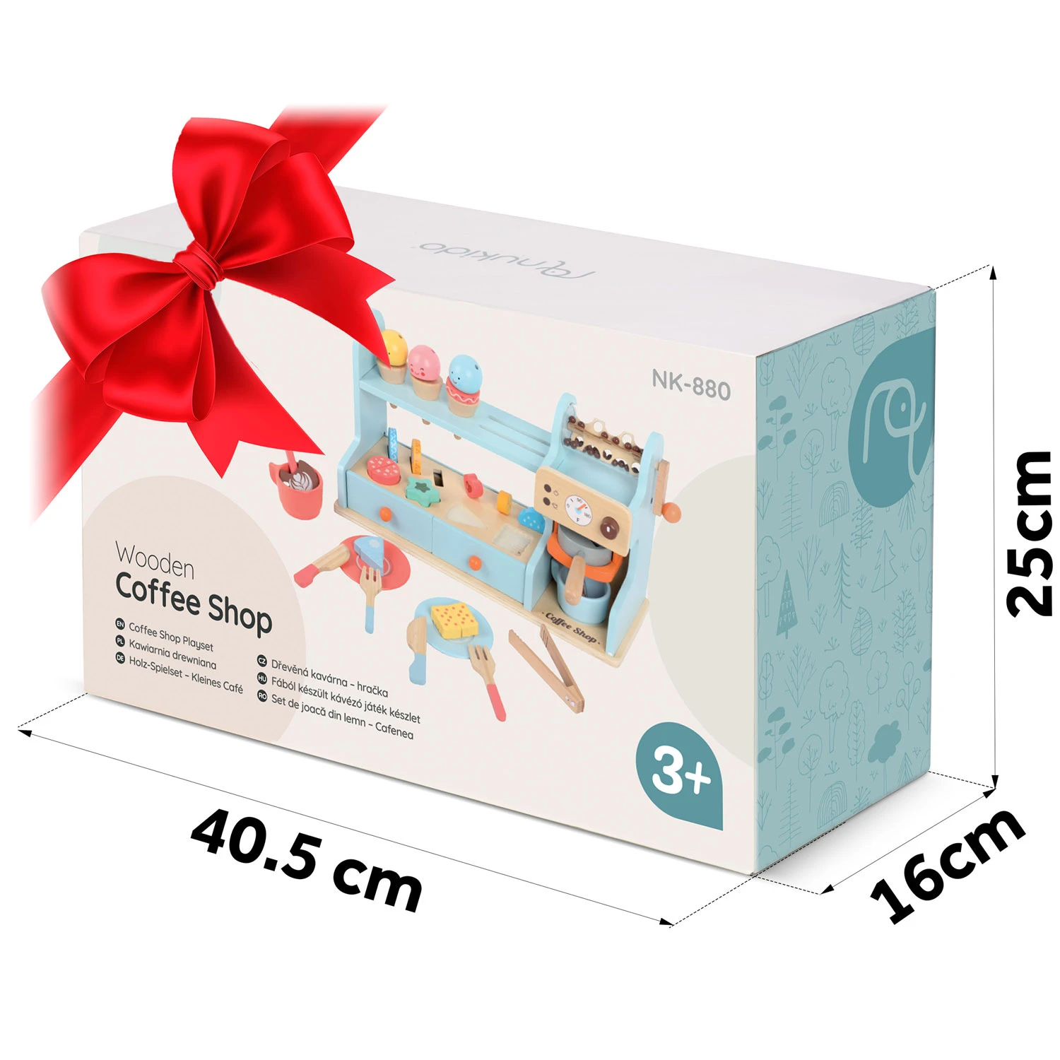Dřevěná kavárna a zmrzlinárna Nukido NK-880 je barevná a funkční hračka z přírodního dřeva vysoké kvality. Intenzivní barvy stimulují zrak dítěte, usnadňují učení barev a podporují rozvoj vizuální percepce. Použité bezpečné barvy a odolné dřevo zajišťují, že set je vhodný pro malé hráče a vydrží dlouhé roky každodenního hraní.