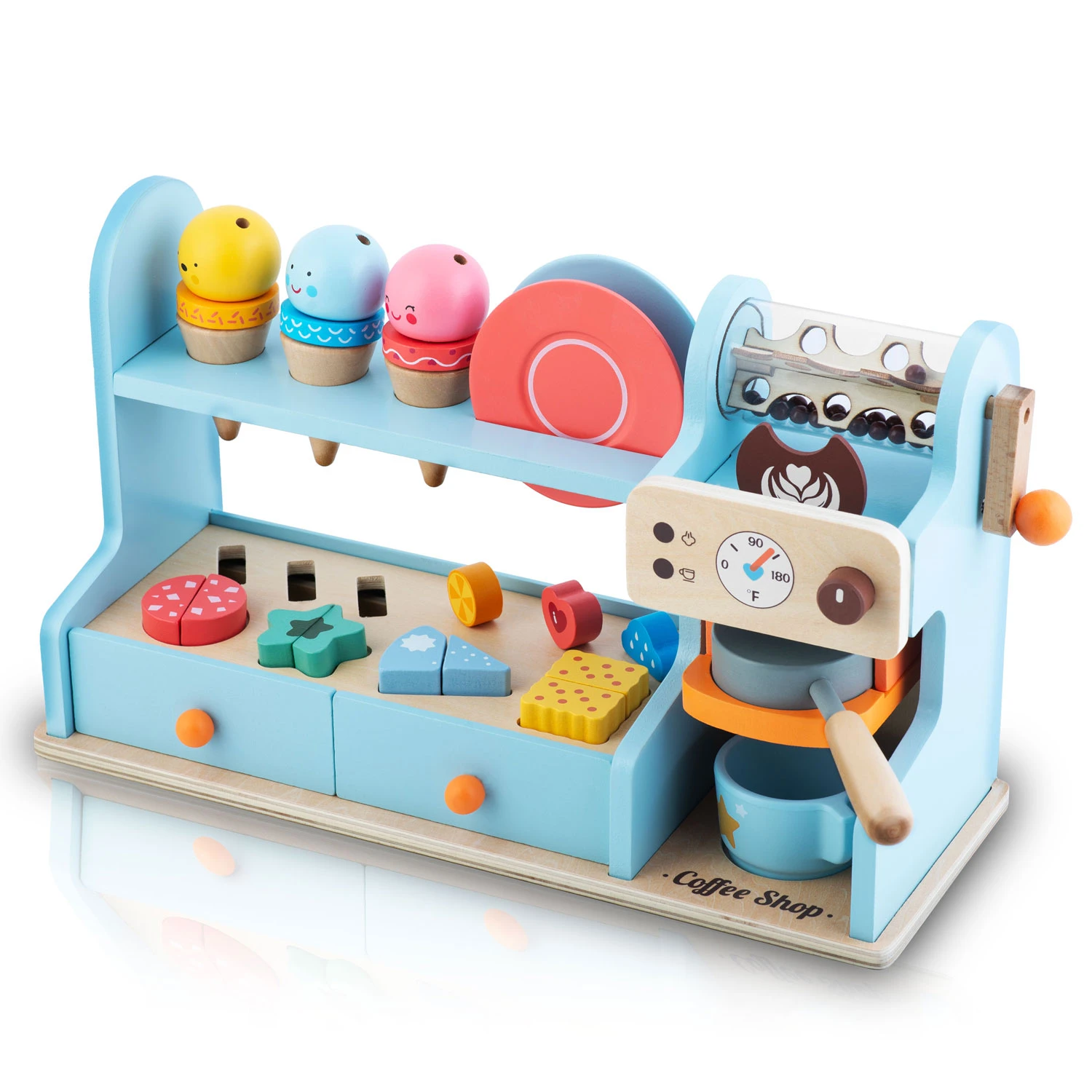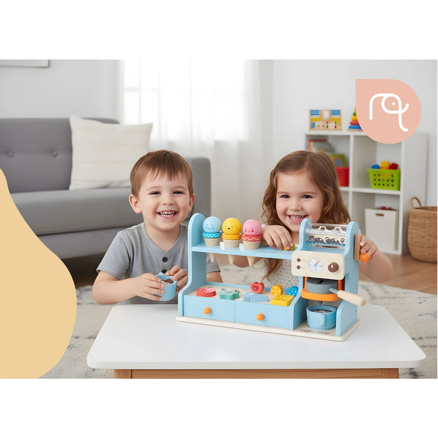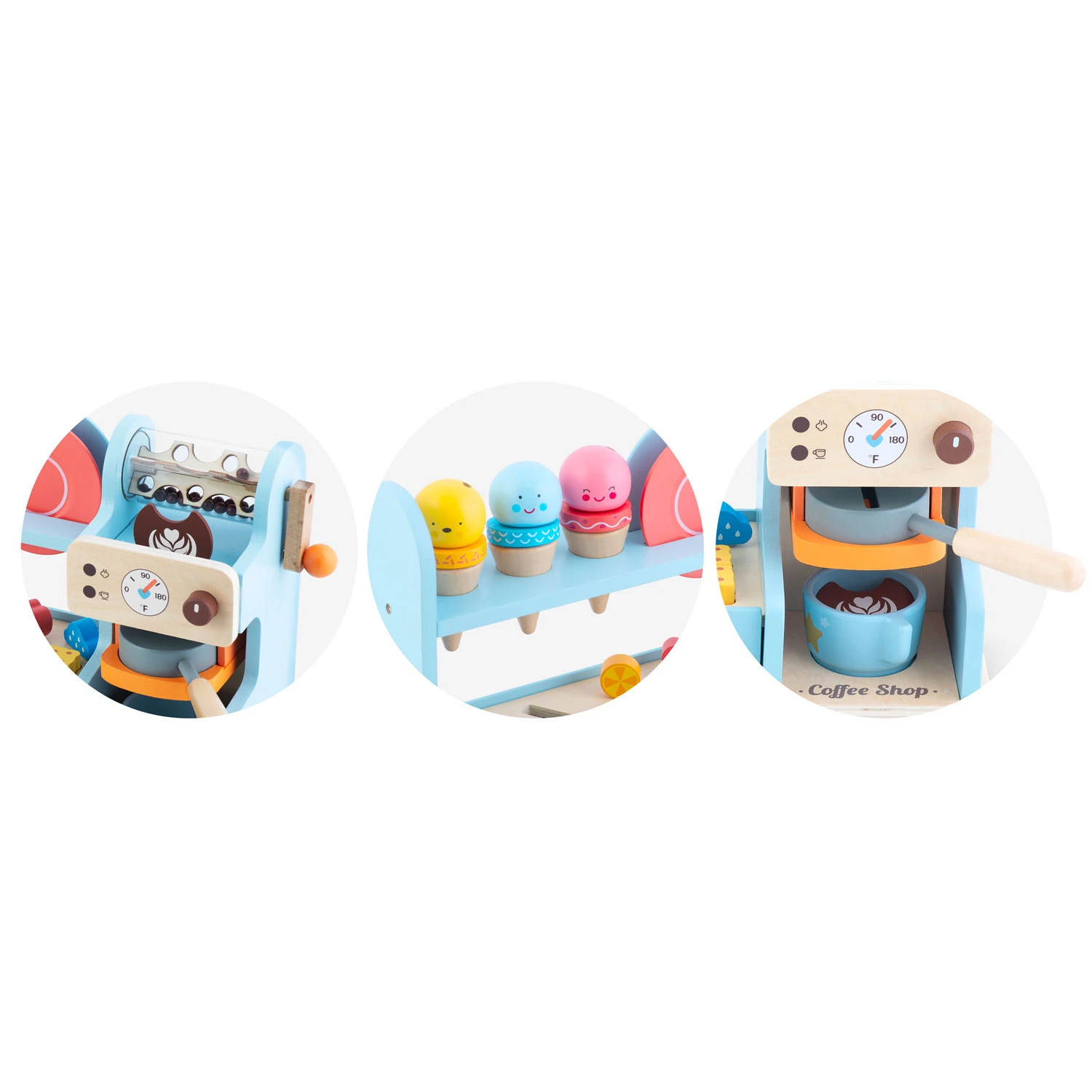 Součástí je pult s otevíratelnými zásuvkami, do kterých se vejdou bankovky a mince ze sady. Nechybí tlakový kávovar, šálky, talířky a příbory – vše připravené k obsluze „zákazníků“. Díky množství detailů a příslušenství umožňuje set hru na obchod, odvíjení scének a přebírání rolí, a tak poskytuje mnoho hodin skvělé zábavy. Originální balení z něj dělá ideální dárek.