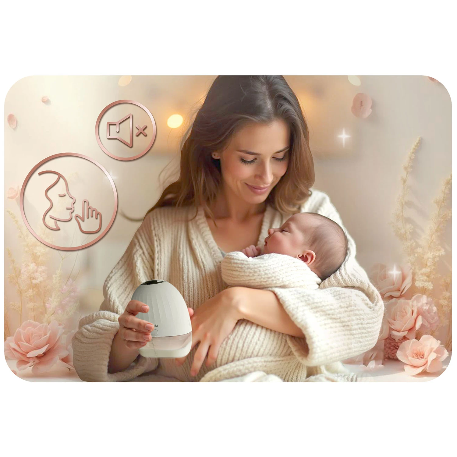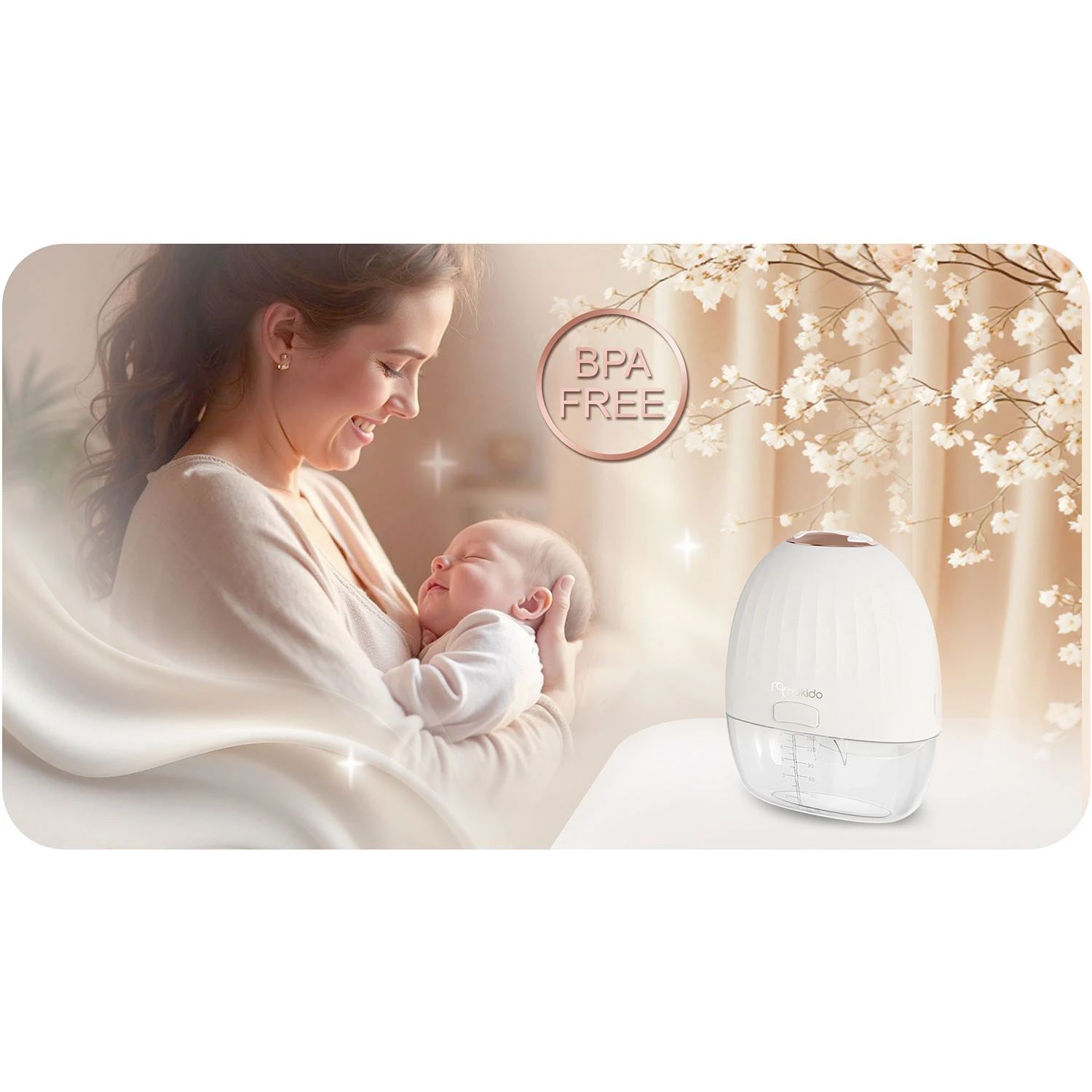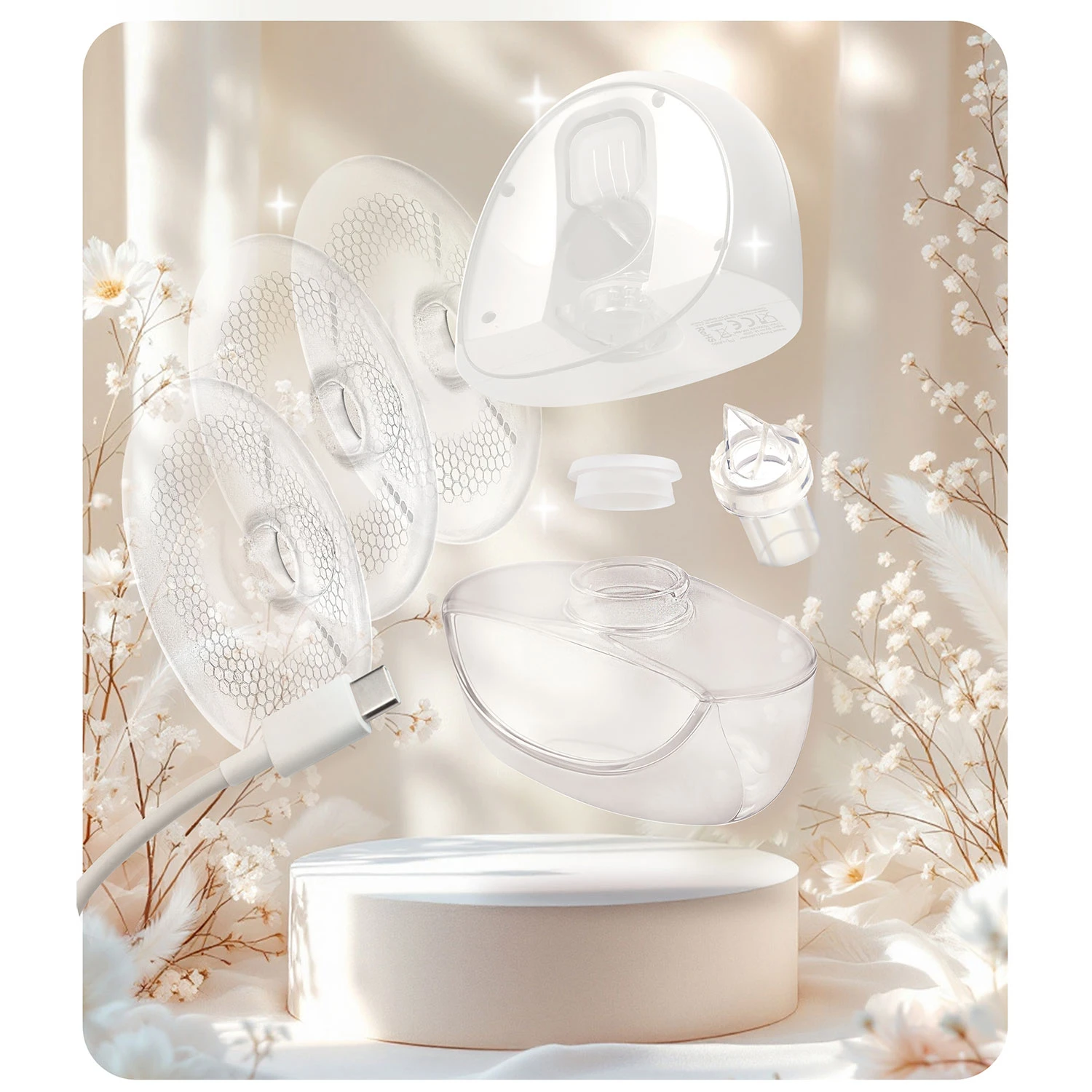 Výrobek je určen k odsávání mateřského mléka. Uchovávejte mimo dosah dětí. Před a po použití očistěte části, které přicházejí do styku s mlékem. Nepoužívejte poškozené či opotřebené díly. Elektrickou část ani motor neponořujte do vody. Nabíjejte přes vhodný USB‑C kabel a kompatibilní nabíječku, nenechávejte bez dozoru během nabíjení. Chraňte před teplem a vlhkostí. Při potížích s kojením nebo bolestivosti prsou kontaktujte zdravotníka.