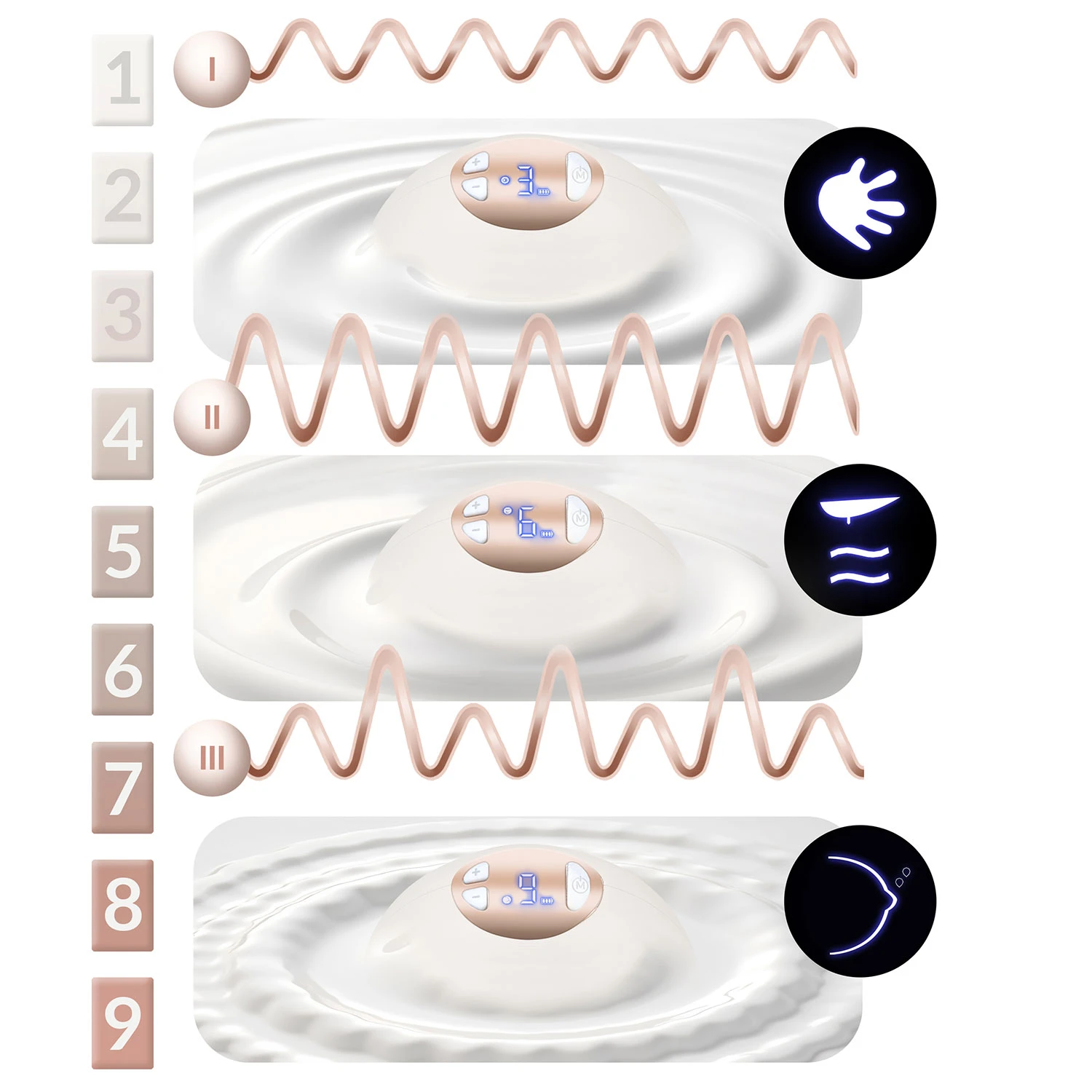 - Třífázový režim: Fáze I – stimulace (9 úrovní), Fáze II – pomalé hlubší sání (9 úrovní), Fáze III – hluboké odsávání (9 úrovní)