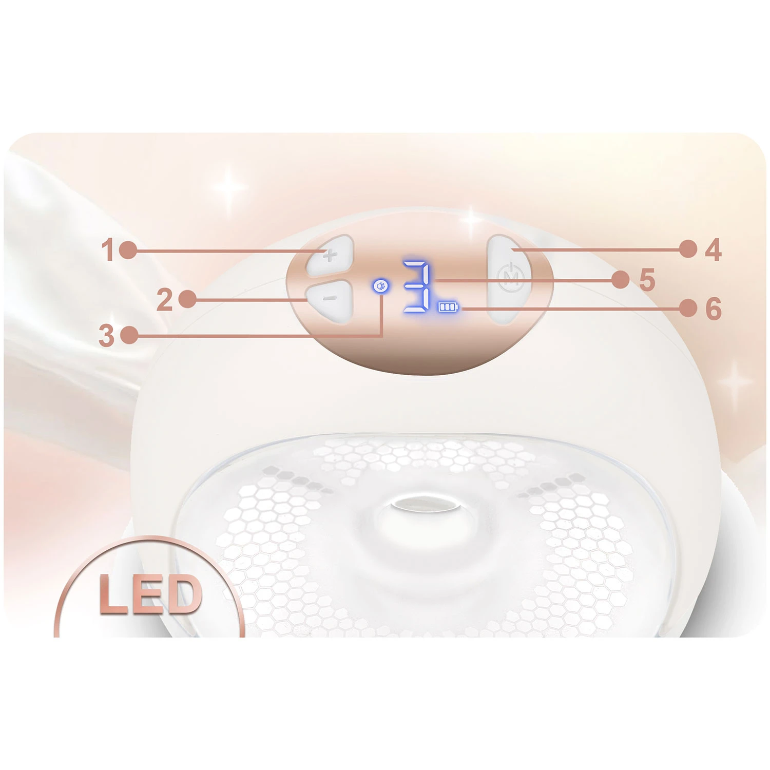 Anatomicky tvarované silikonové masážní nástavce ve třech velikostech jsou jemné k pokožce a podporují spuštění mléka. Součástí je přehledný LED displej vhodný i pro noční používání, který umožňuje přepínat režimy, nastavovat úrovně a sledovat stav baterie.