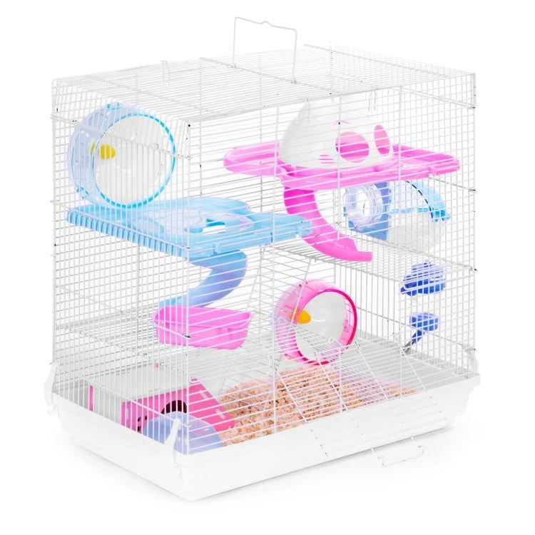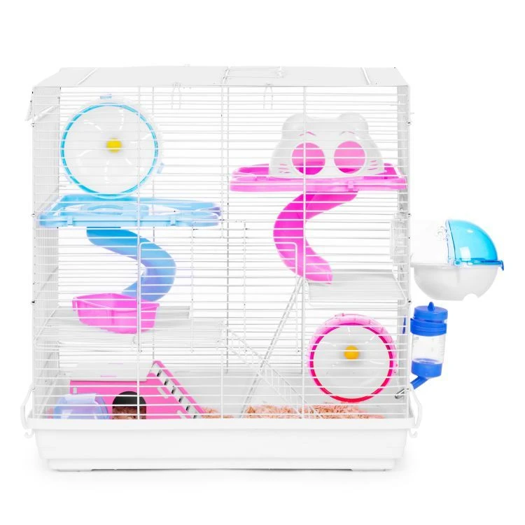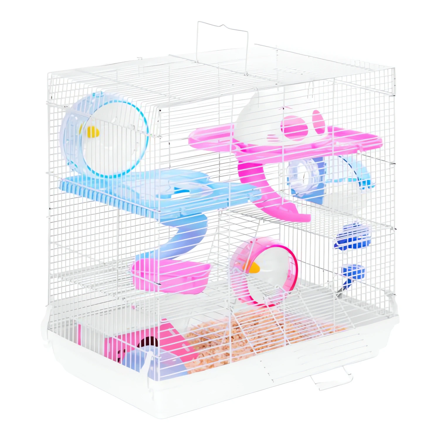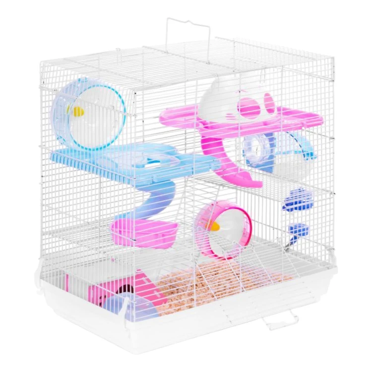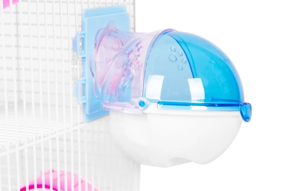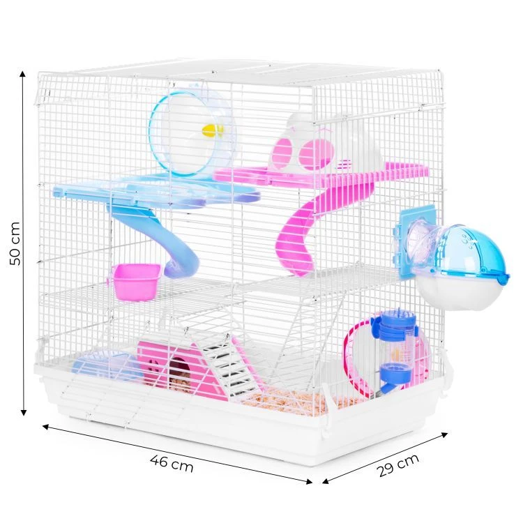 Plně vybavená klec je praktické „hotové bydlení“ pro křečky, morčata, potkany a další malé hlodavce. V balení najdete kompletní sadu příslušenství pro zábavu i odpočinek – 2 skluzavky, domeček, kolotoč, 4 patra a misku. Klec je vyrobená z odolných a pro zvířata vhodných materiálů, konstrukci doplňuje práškově lakovaná ocel, která zvyšuje pevnost. Pro snadnou manipulaci má klec madlo nahoře a praktické boční vstupní dvířka pro pohodlný kontakt se zvířetem. Montáž je jednoduchá – klec je zajištěná na 4 západky.