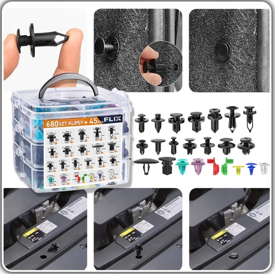 Udržujte své auto nebo motocykl ve vynikajícím stavu pomocí ultra praktické sady spon. Neuvěřitelný výběr velikostí a tvarů uspokojí všechny vaše potřeby. Praktická sada klipů udrží auto nebo motorku ve výborném stavu. Všechny základní velikosti v jedné krabici.