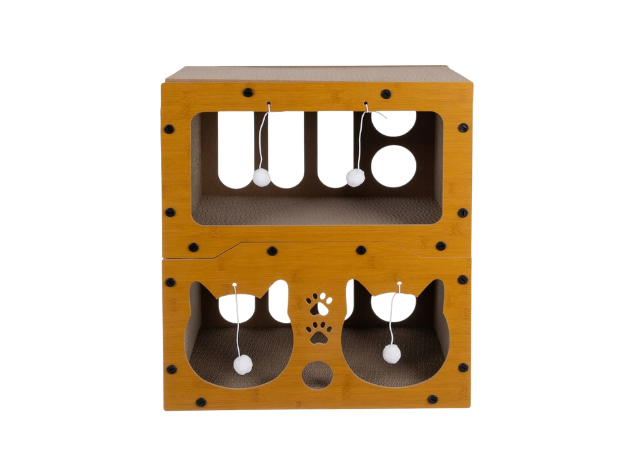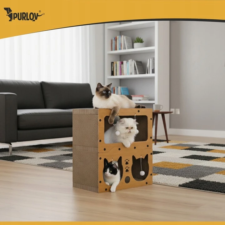 Škrabadlo Purlov je dvoupatrový dům vyrobený z odolné vlnité lepenky a pevné HDF desky, které zajišťují stabilitu a dlouhou životnost. Konstrukce poskytuje kočkám ideální prostor ke škrábání, hraní, schovávání i odpočinku.