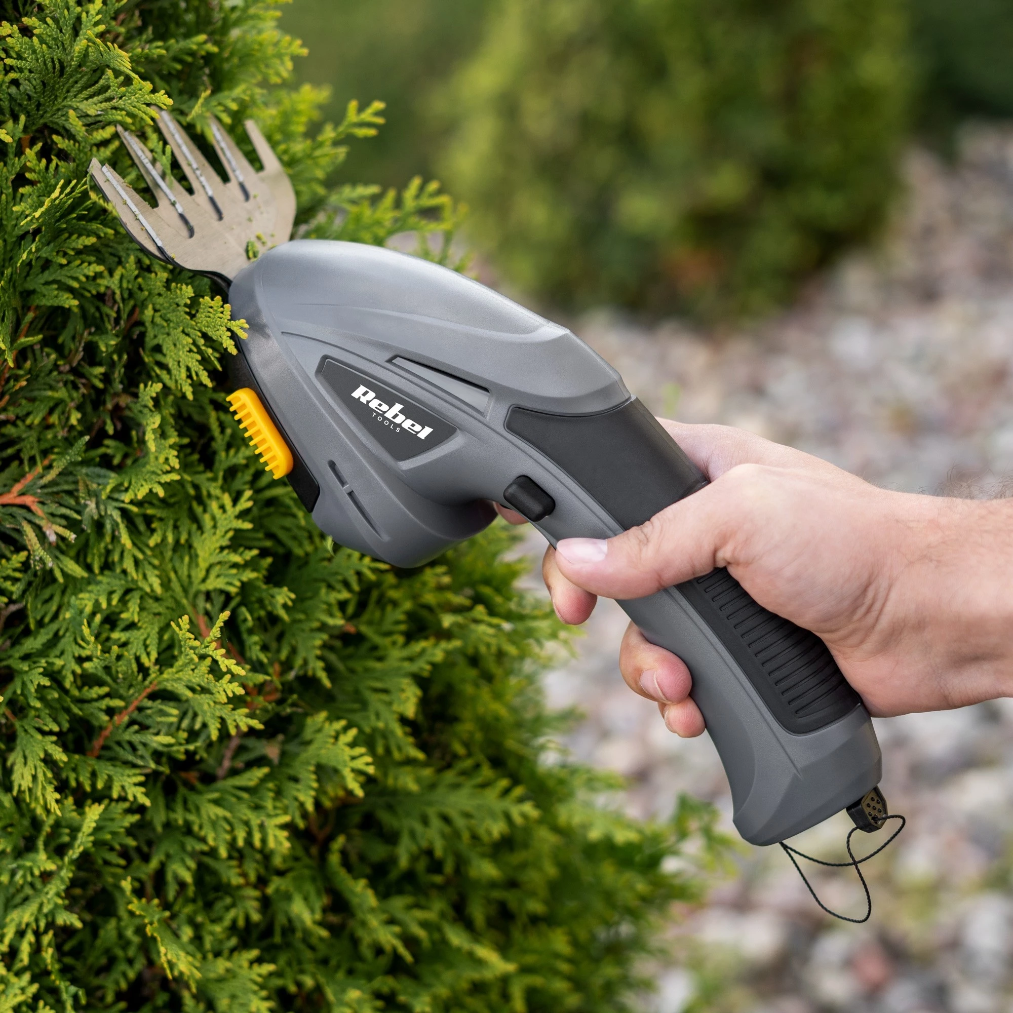 Před použitím si důkladně přečtěte návod k obsluze. Nůžky používejte pouze k účelu, pro který jsou určeny – tedy ke stříhání keřů a živých plotů. Nepoužívejte zařízení v dešti, vlhkém prostředí ani v blízkosti vody. Před výměnou nástavců, čištěním nebo údržbou vždy odpojte zařízení od napájení. Během provozu držte nářadí pevně oběma rukama a vždy zaujměte stabilní postoj. Používejte vhodné ochranné pomůcky – ochranné brýle, rukavice a pevnou obuv. Uchovávejte mimo dosah dětí a nepovolaných osob. Nepřibližujte ruce k pohyblivým částem během chodu zařízení. Nikdy neodstraňujte bezpečnostní kryty ani se nepokoušejte o úpravy zařízení. V případě poškození baterie, krytu nebo čepelí přístroj dále nepoužívejte a obraťte se na autorizovaný servis. Zařízení není určeno pro profesionální použití. Po každém použití očistěte pracovní části a bezpečně uložte.Výrobce : Rebel