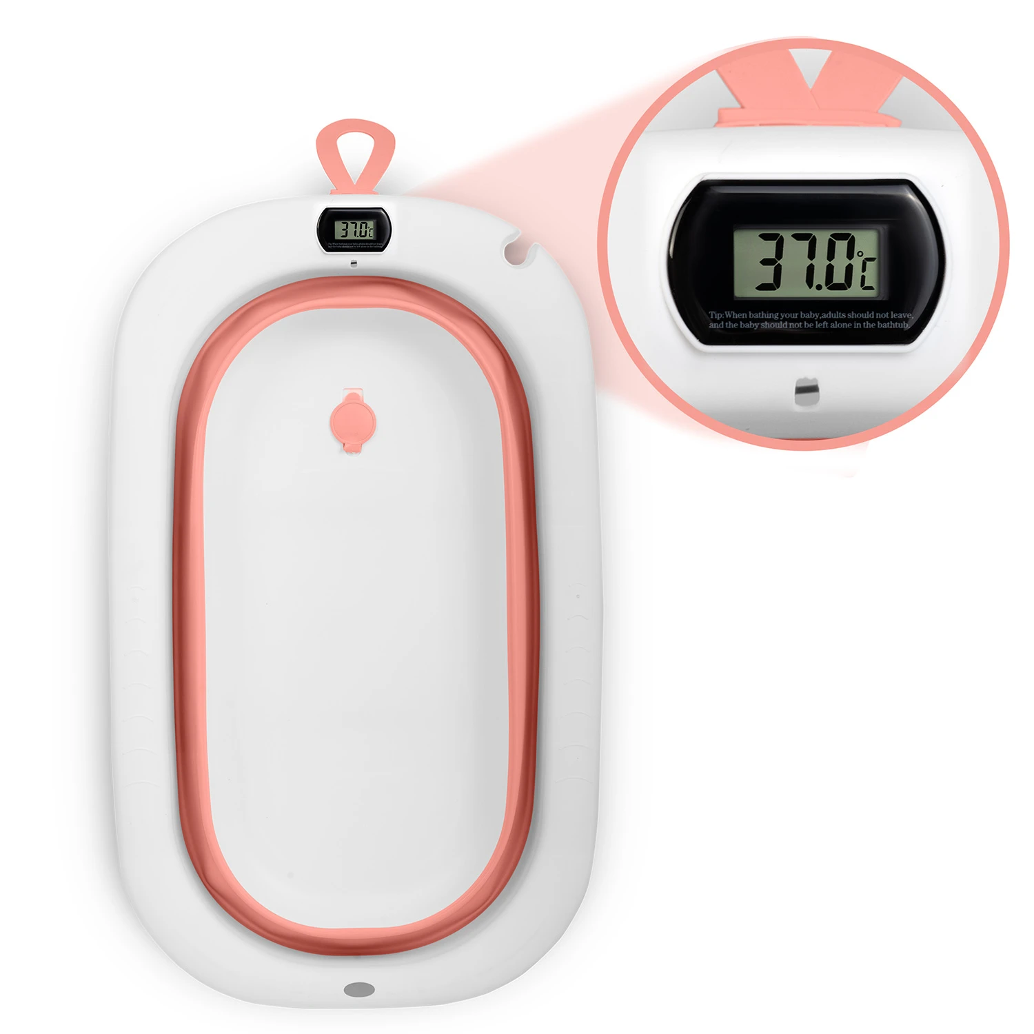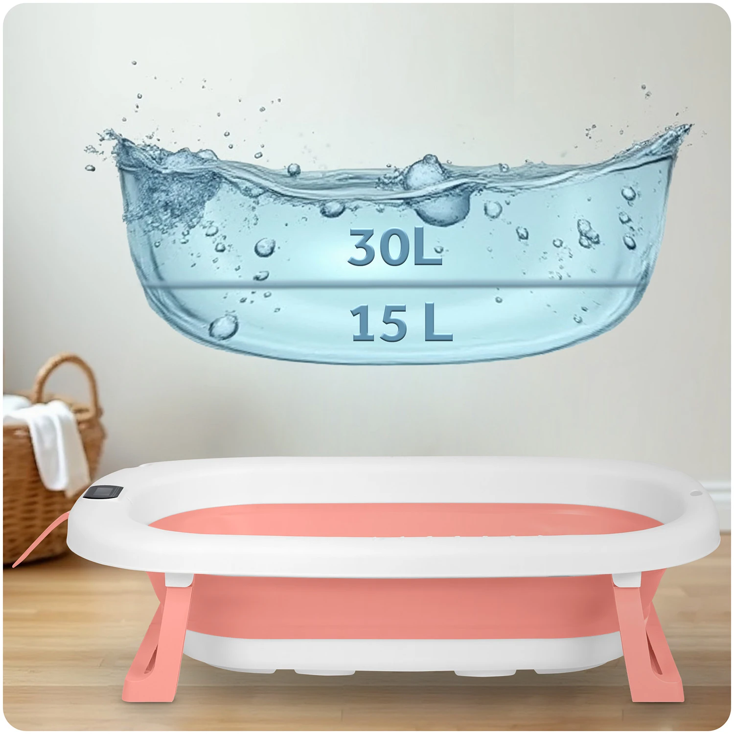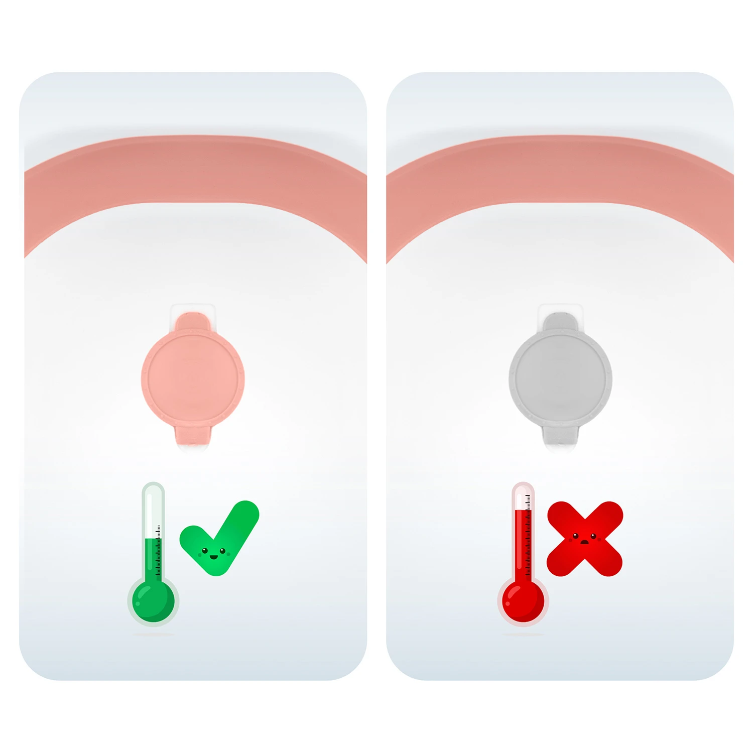 Integrovaný elektronický teploměr s přesnou sondou průběžně sleduje teplotu vody a zobrazuje ji na čitelném LCD. Špunt (korek) navíc při překročení 38 °C změní barvu z růžové na bílou. Praktický držák na sprchovou hlavici usnadňuje plnění i oplach bez zbytečného rozstřiku vody a nechává vám obě ruce volné pro péči o dítě.