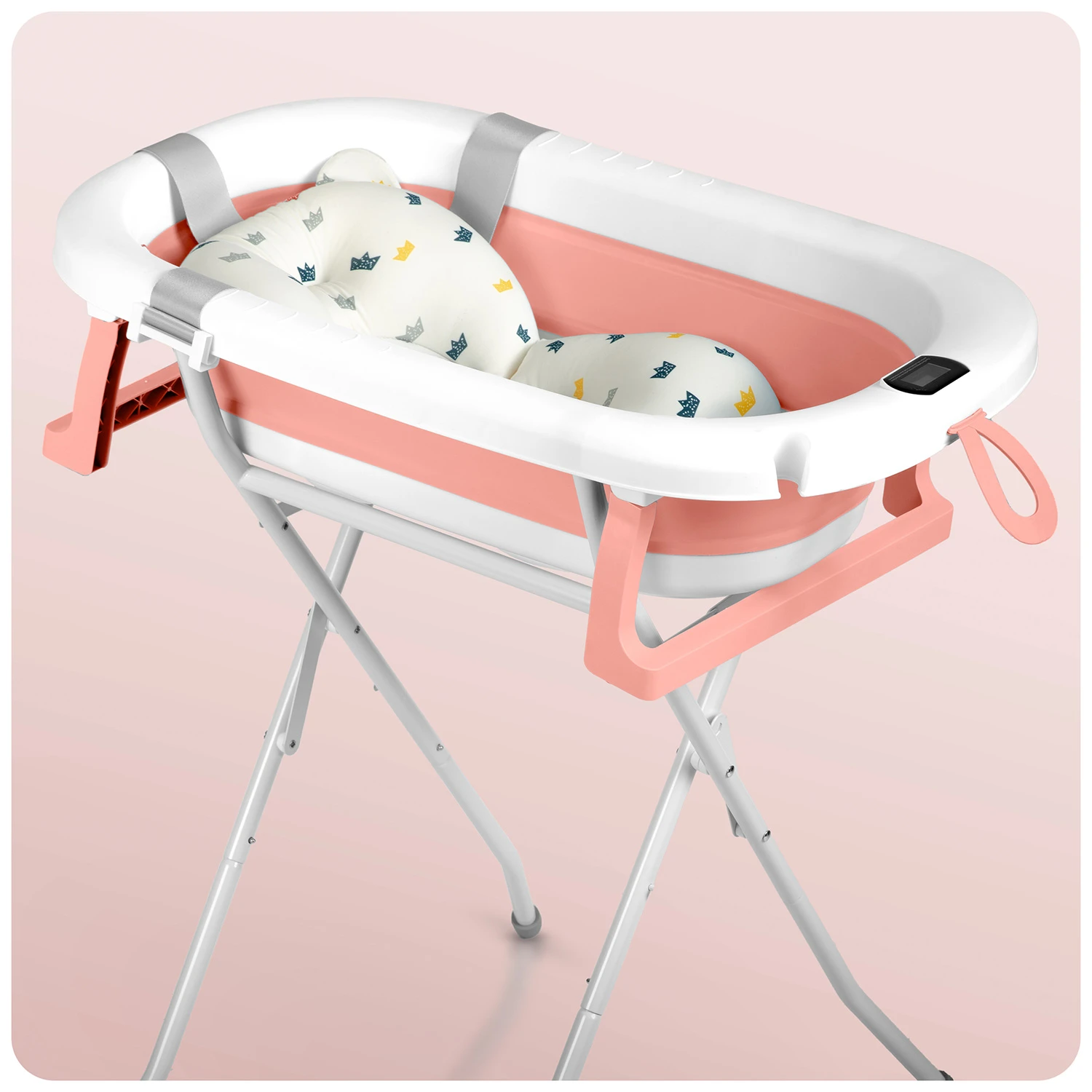 Součástí je jemná, rychleschnoucí a profilovaná vložka pro novorozence, která šetrně podpírá hlavičku i záda miminka. Vložka se pevně uchytí třemi odolnými úchyty na okrajích vaničky a fixuje se nastavitelnými pásy. Po koupeli ji jednoduše vyjmete a během chvilky osušíte. Pro vyšší stabilitu je vanička vybavena protiskluzovými nožkami a rozkládacími nohami, které se během koupele samovolně nesloží.