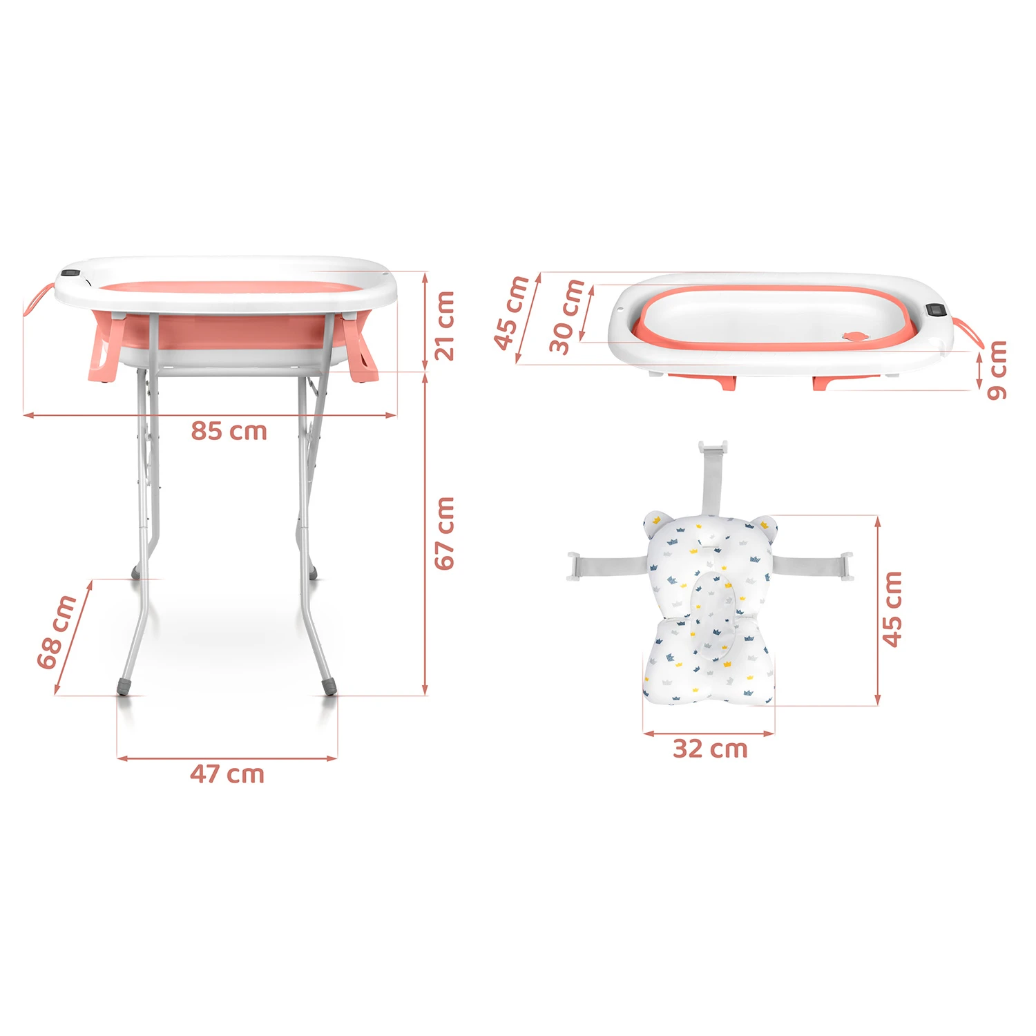 Pro pohodlné umístění můžete zvolit vysoké nožky dodávané v sadě, nebo pouze rozkládací podpěry na libovolné rovné ploše. Skládací konstrukce šetří místo doma i na cestách. Vanička je odolná, má velkorysou kapacitu 45 l a maximální nosnost 45 kg. Materiál je bez BPA a dalších škodlivých látek.