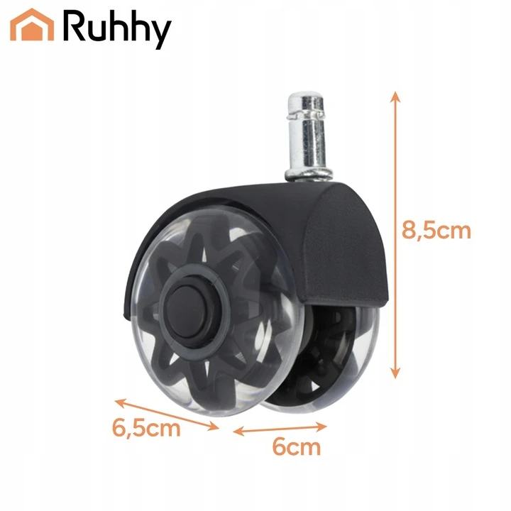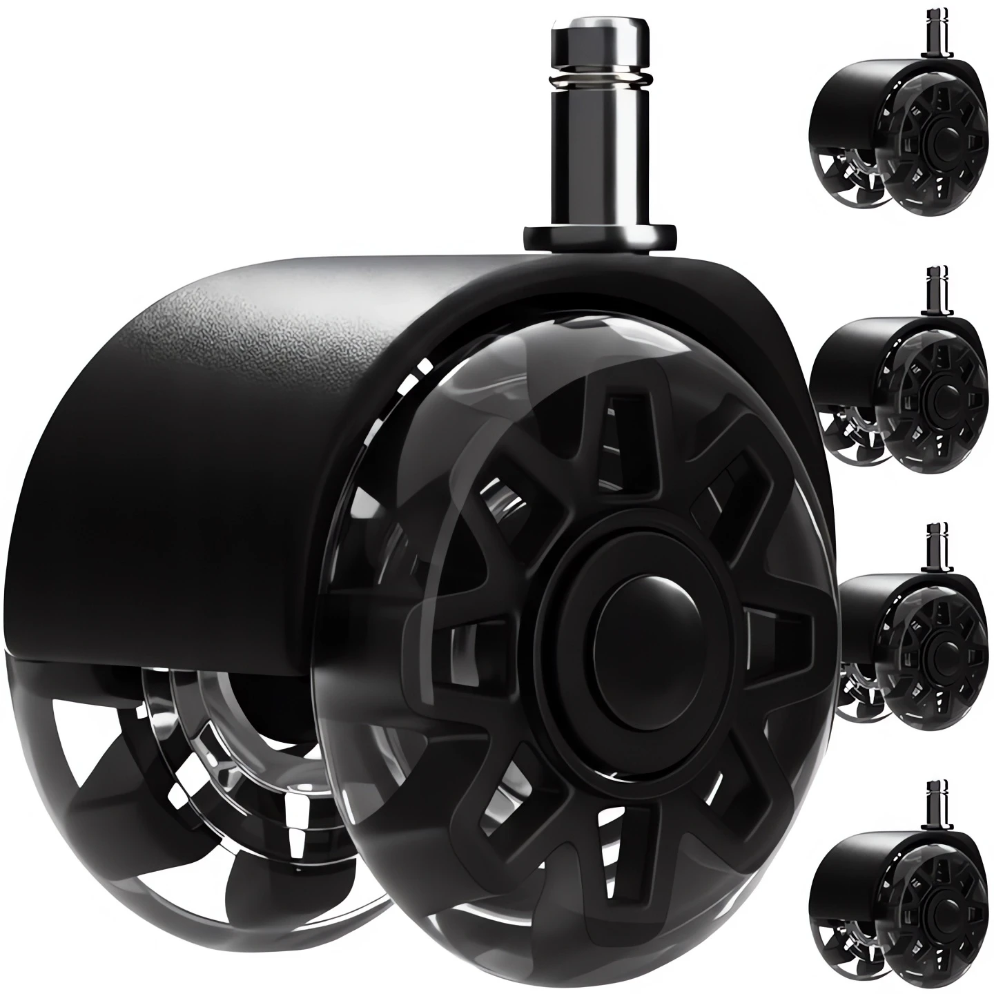 Tato sada pěti černých koleček je ideálním vylepšením pro váše kancelářské nebo domácí otočné křeslo. Kolečka jsou navržena s ohledem na tichý chod (méně než 25 dB), ochranu podlahy díky měkkému běhounu z PU (polyuretan), a snadnou montáž — stačí vyjmout stará kolečka a zasunout nová díky standardnímu rozměru 11×22 mm. Hodí se pro podlahy z panelů, parket, dlaždic i koberce. S průměrem kolečka cca 65 mm (2,5″) a nosností až pro celkovou hmotnost křesla do 160 kg, tato kolečka představují kvalitní a elegantní volbu pro moderní pracovní či herní prostředí.