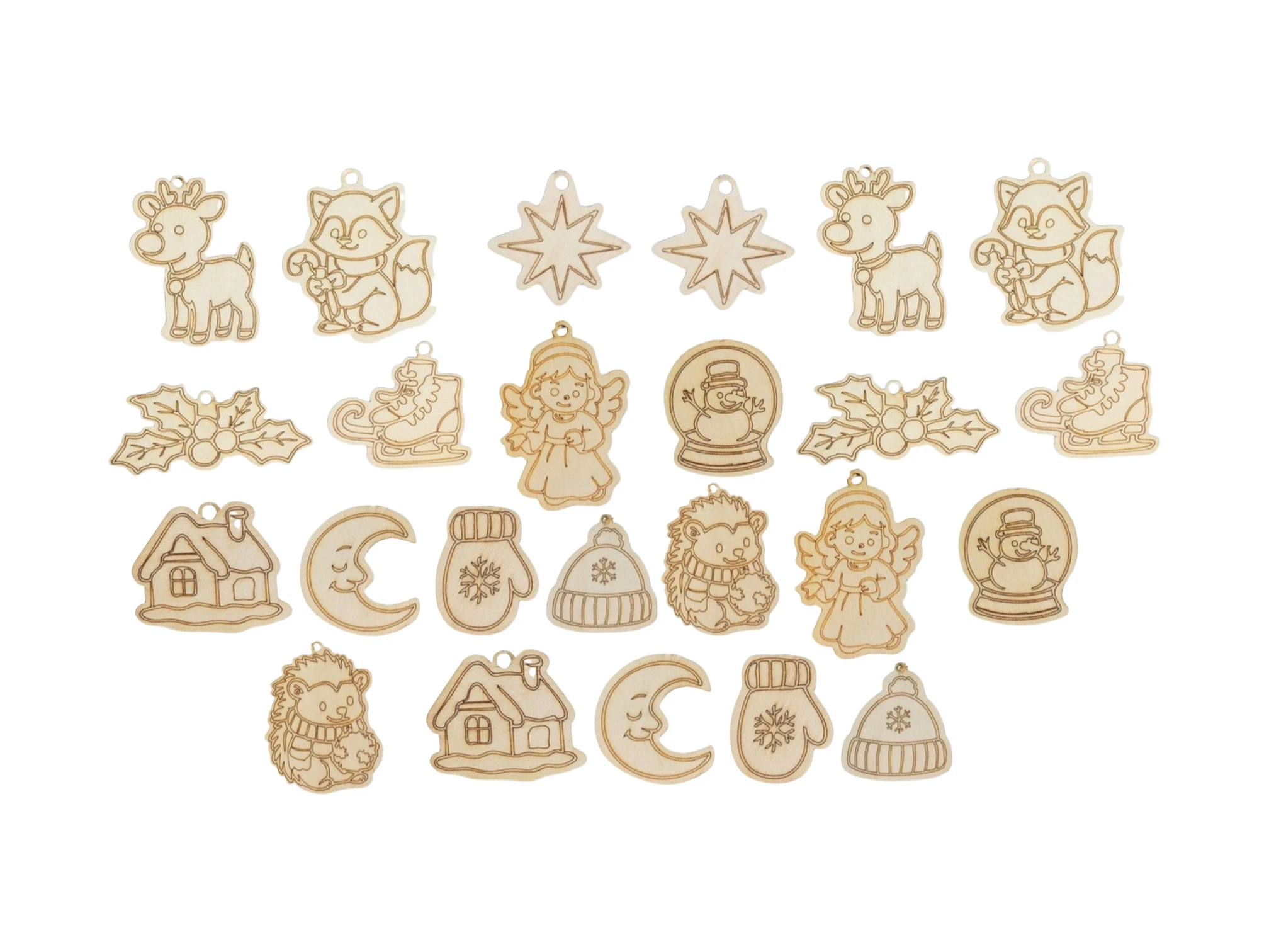 Tato sada obsahuje 24 dřevěných vánočních ozdob, které jsou ideální pro kreativní projekty. Každá ozdoba má otvor pro zavěšení a je dodávána se šňůrkami, což usnadňuje jejich zavěšení na stromeček, girlandu nebo okno. Jsou vyrobeny z přírodního dřeva, což jim dodává ekologický a přírodní vzhled.