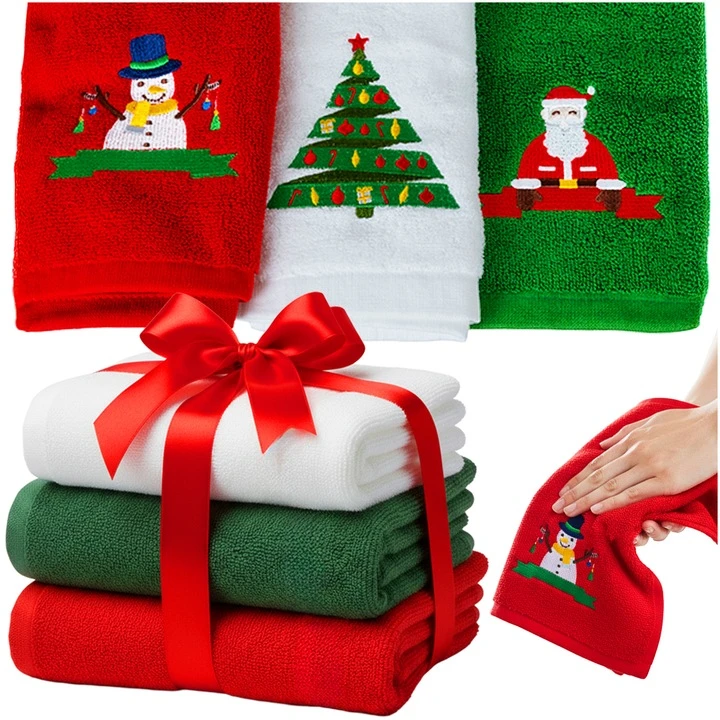 Tento vánoční set obsahuje tři ručníky v tradičních barvách Vánoc – červené, zelené a bílé – každý zdobený výšivkou. Jsou vyrobeny z kvalitní tkané bavlny, což zajišťuje jejich měkkost, savost a pohodlné použití. Ručníky jsou ideální pro vánoční výzdobu koupelny nebo kuchyně a mohou sloužit jako praktický dárek, protože jsou elegantně svázány dekorativní stuhou a připraveny k předání.