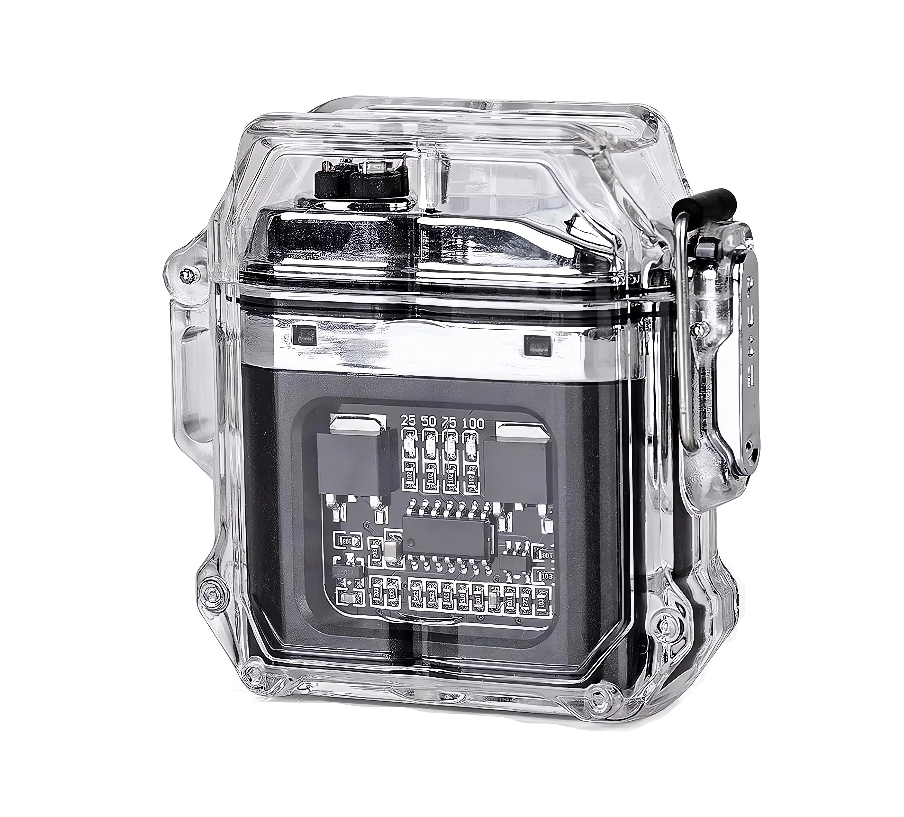 Zapalovač je vybaven těsněními, gumovým tlačítkem pro zapnutí svítilny a těsnícím uzávěrem - klipem. To vše znamená, že se zařízení nepoškodí, pokud spadne do mělké vody.