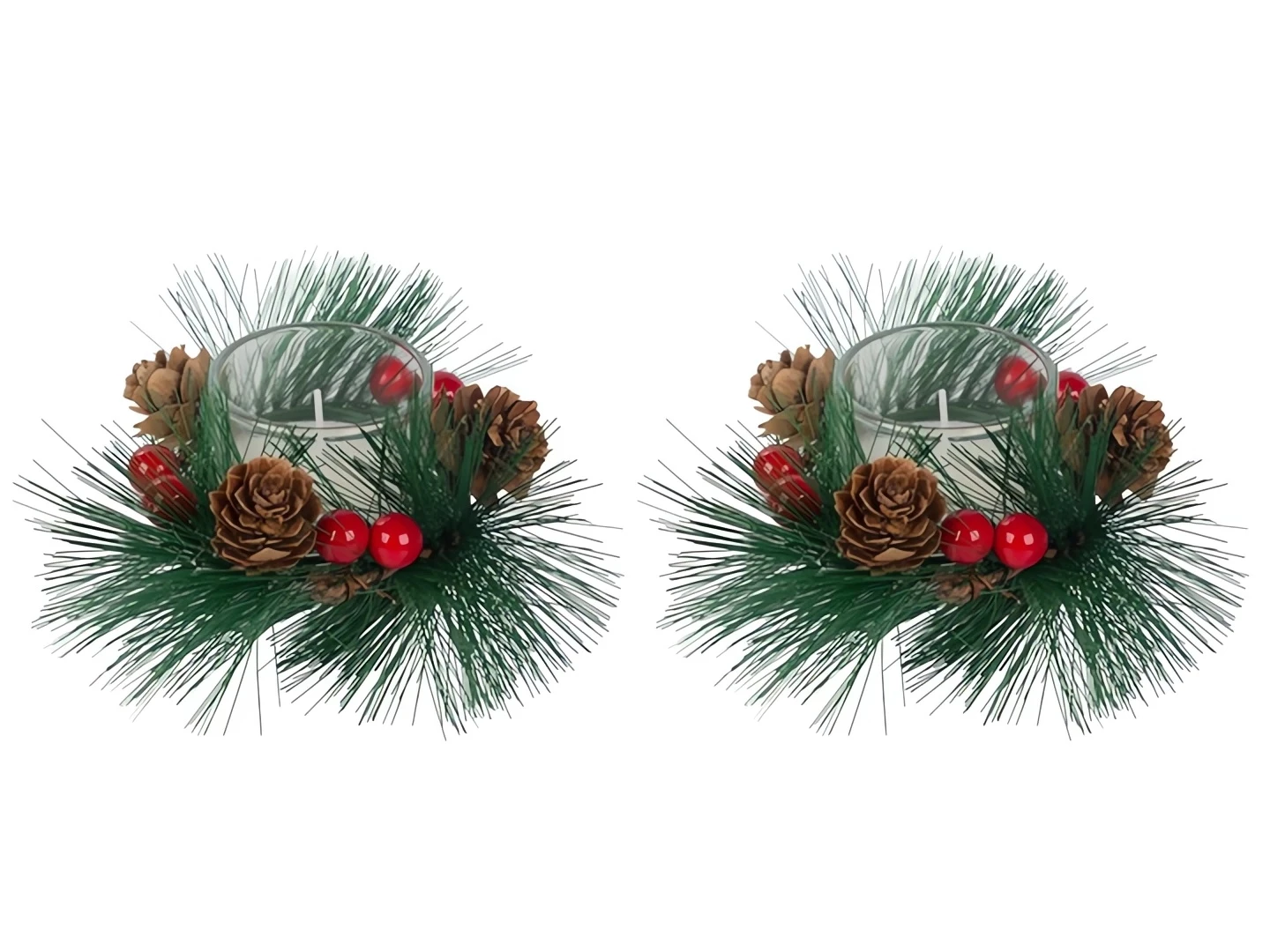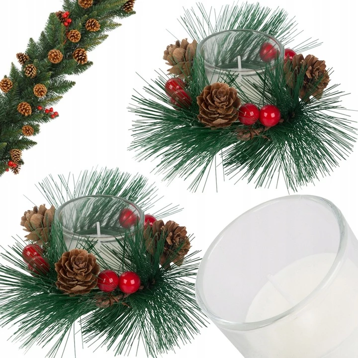 Mají elegantní, klasický vzhled, který se skvěle hodí k zimní atmosféře. Uprostřed každého svícnu je skleněná nádobka na malou svíčku obklopená umělými větvičkami borovic, šiškami a červenými plody. Borové větve a šišky dodávají přirozené kouzlo.