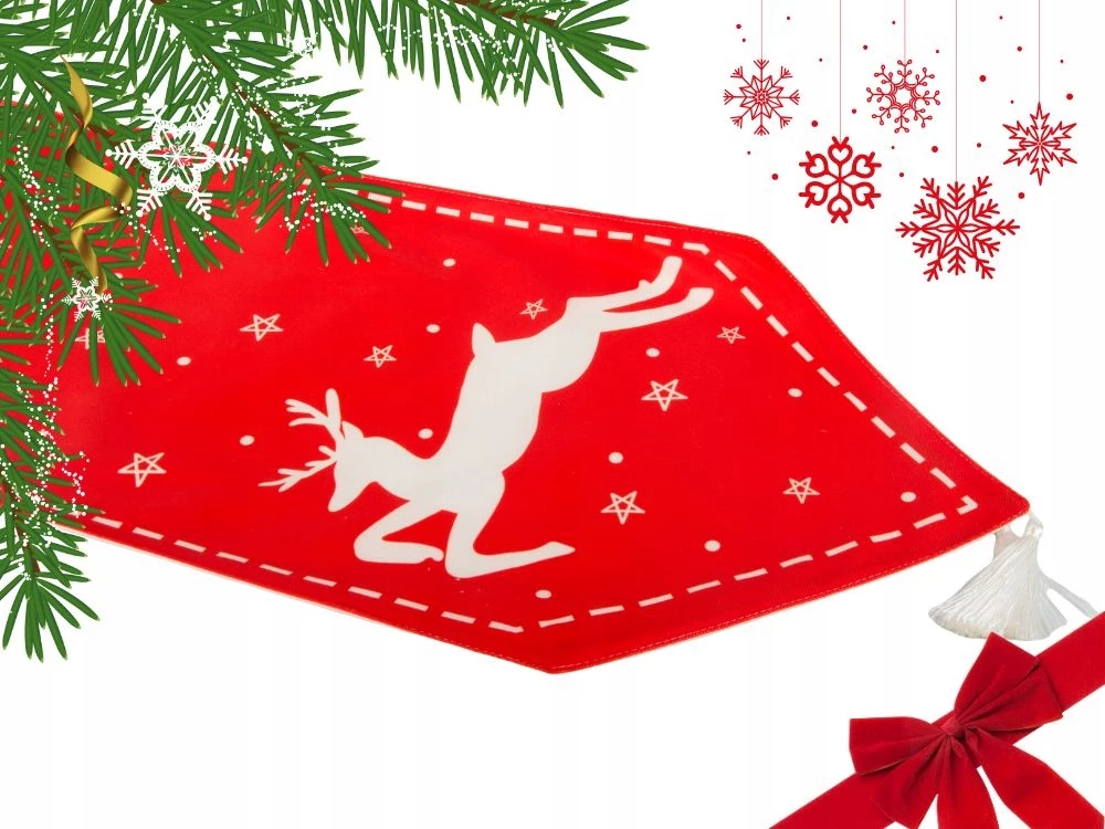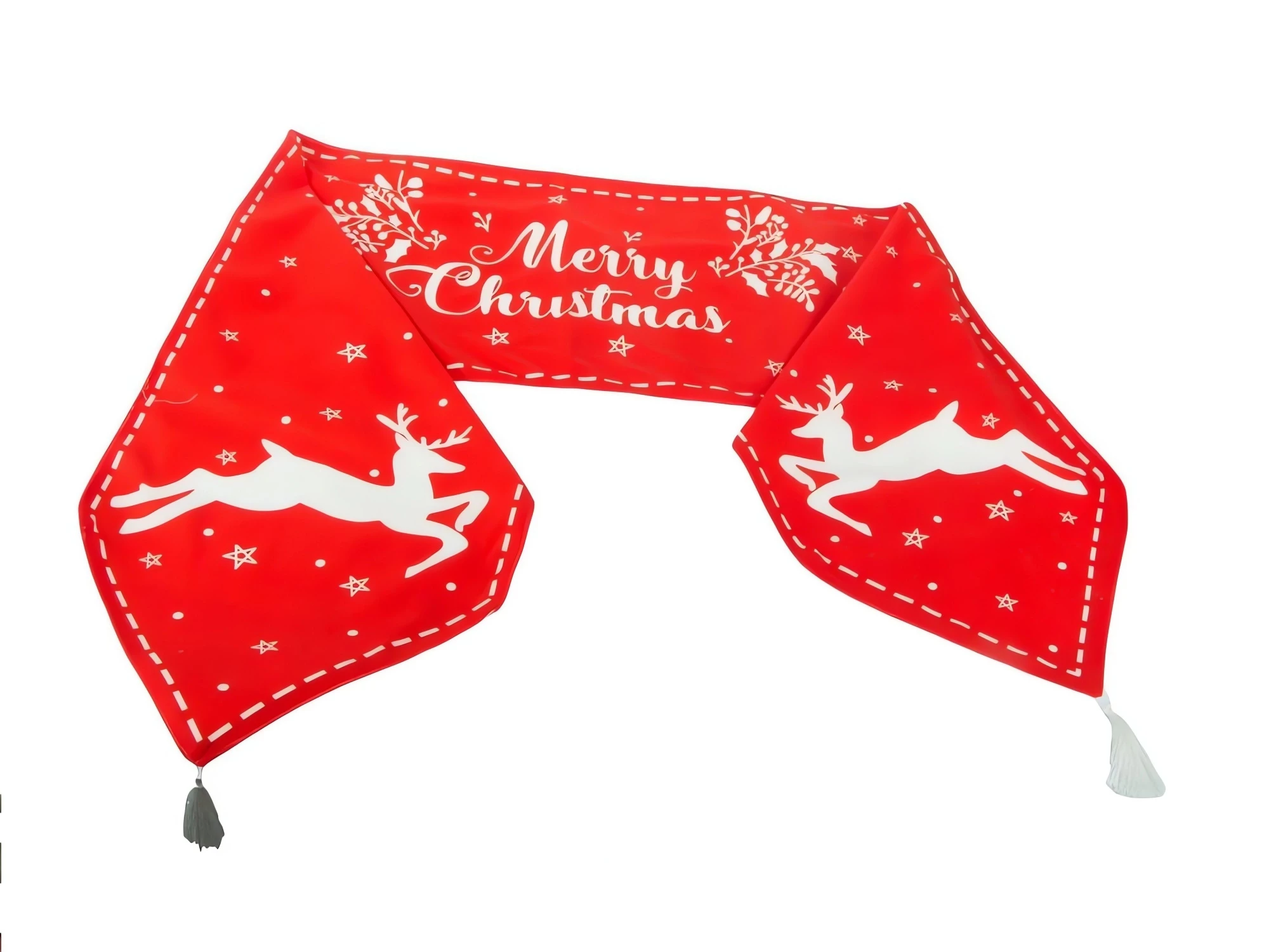 Vánoční ubrus na štědrovečerní stůl o délce 205 cm je elegantním doplňkem, který skvěle zapadne do vánočního interiéru, zdobený krásným vzorem znázorňujícím soba a nápis "Merry Christmas". Zakončen nápadnými třásněmi.
